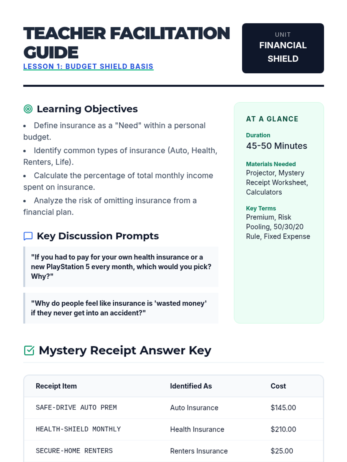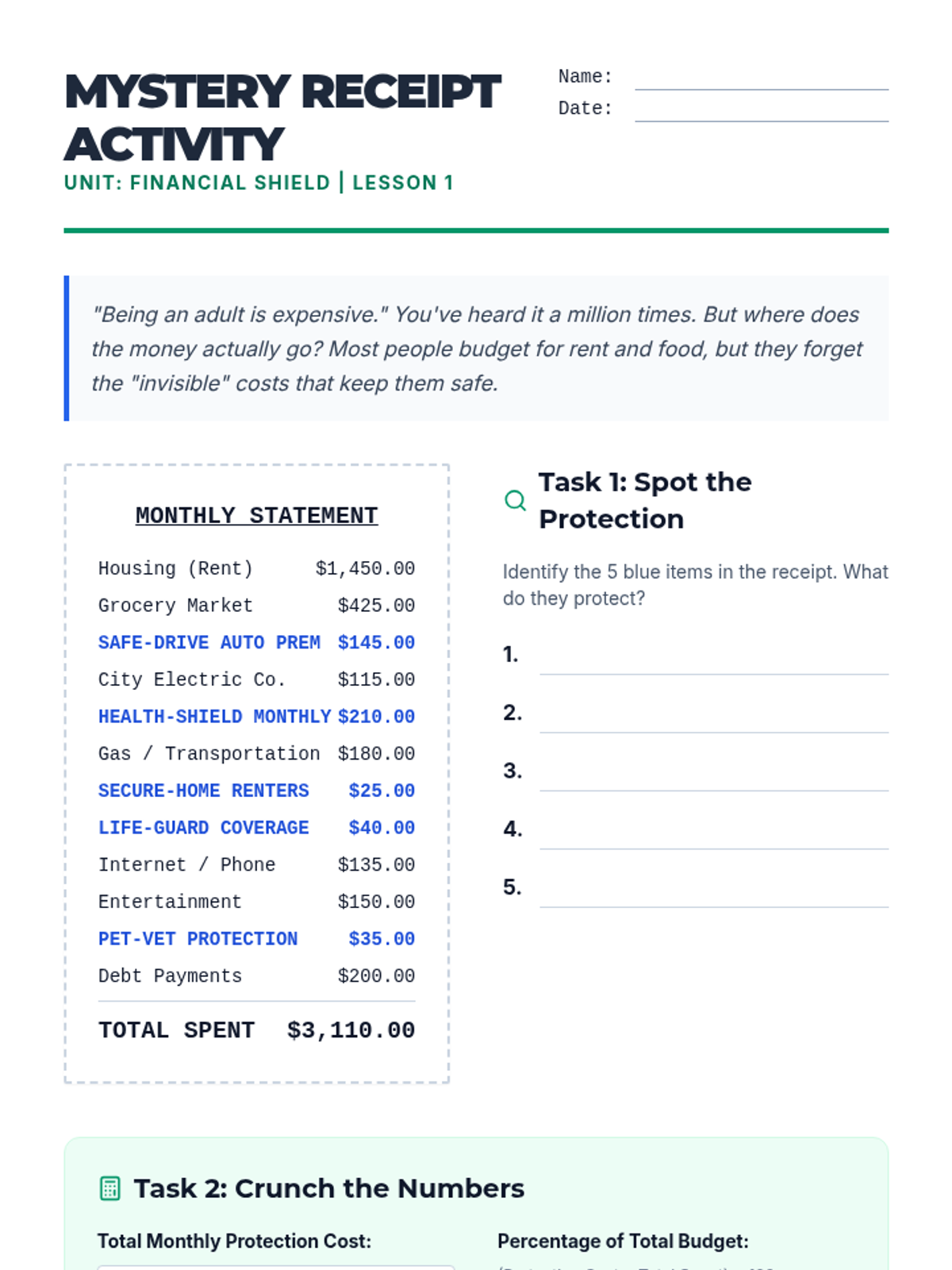 Students identify insurance as a necessary budget category and calculate the percentage of income typical households spend on protection. They analyze a 'mystery receipt' to uncover hidden adult expenses.