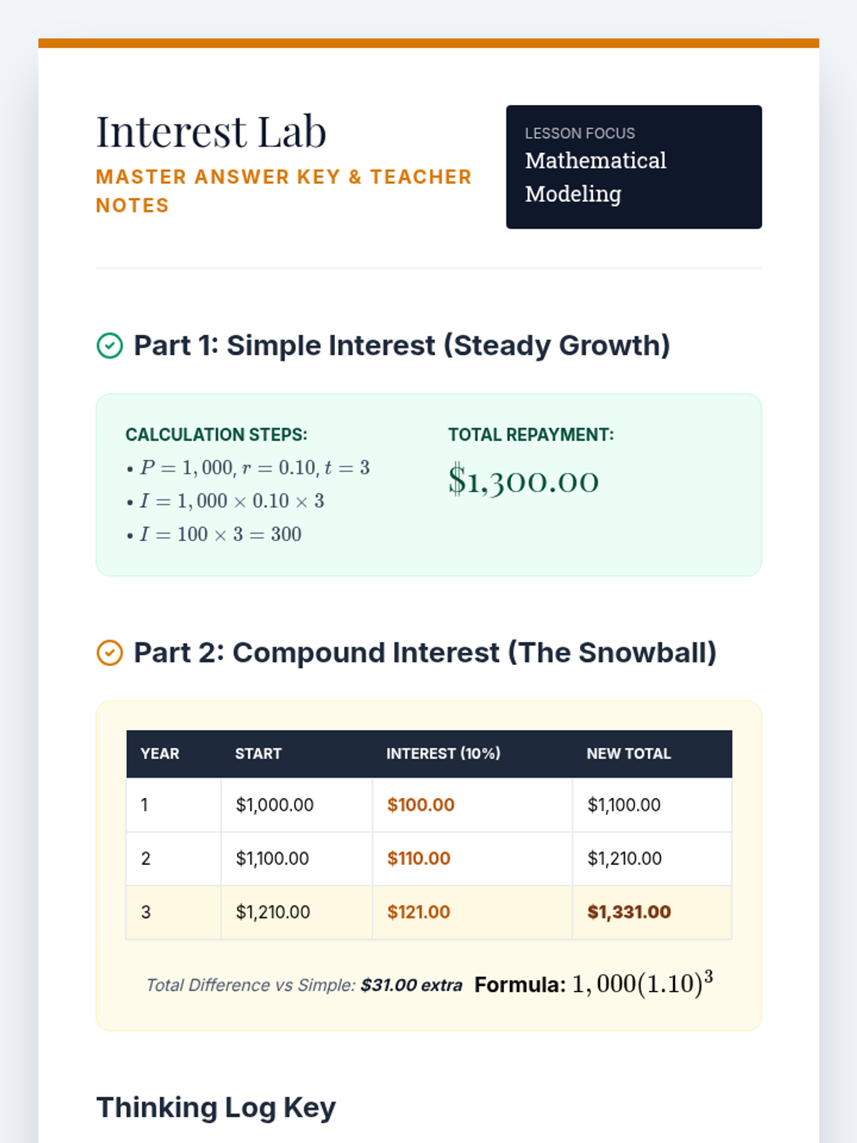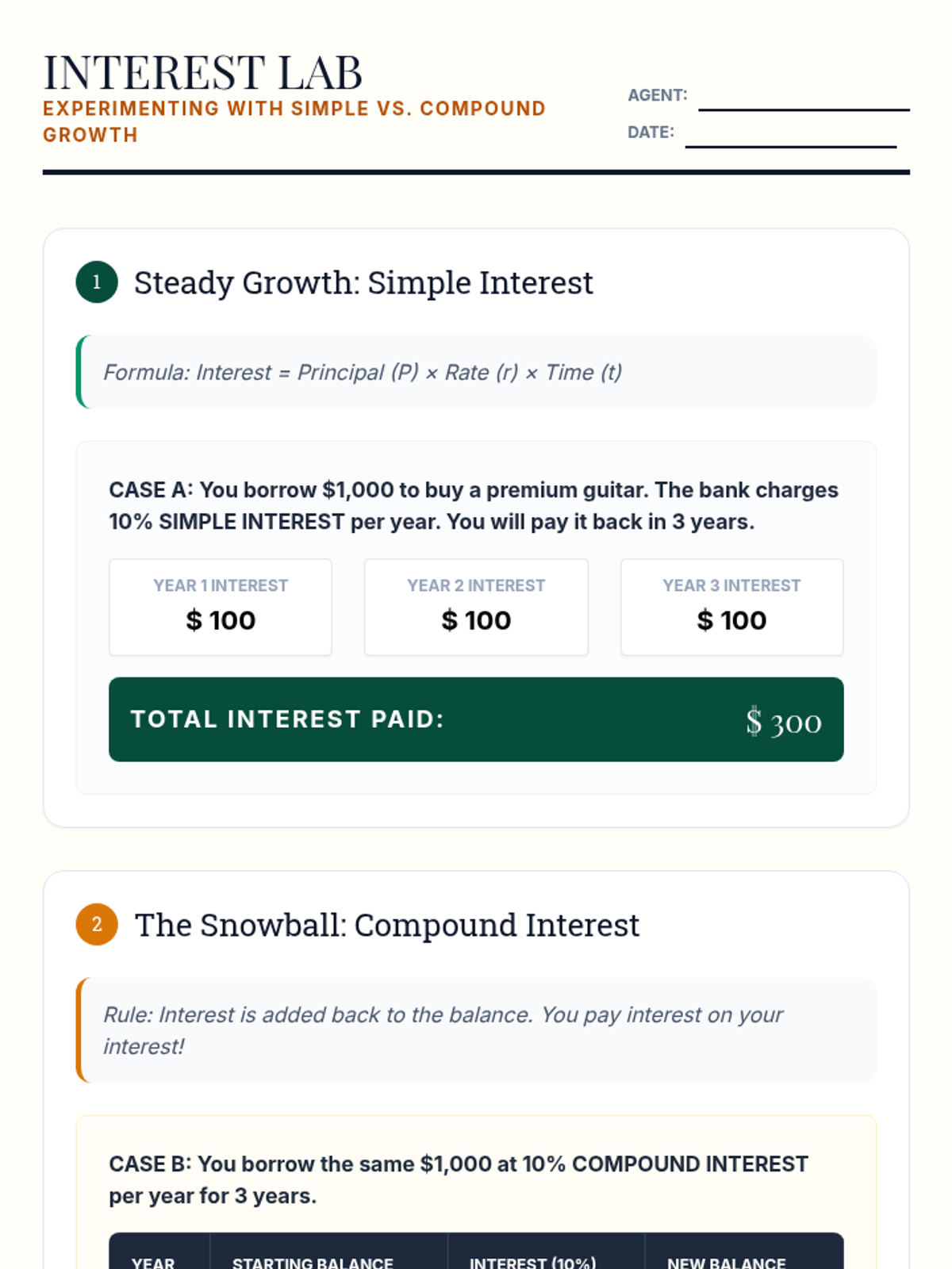 Students will learn the fundamental concepts of principal and interest by calculating simple interest in two scenarios: borrowing for a purchase and saving for the future. Through these calculations and a video analysis, students will understand how interest acts as both a cost and a reward in the banking system.