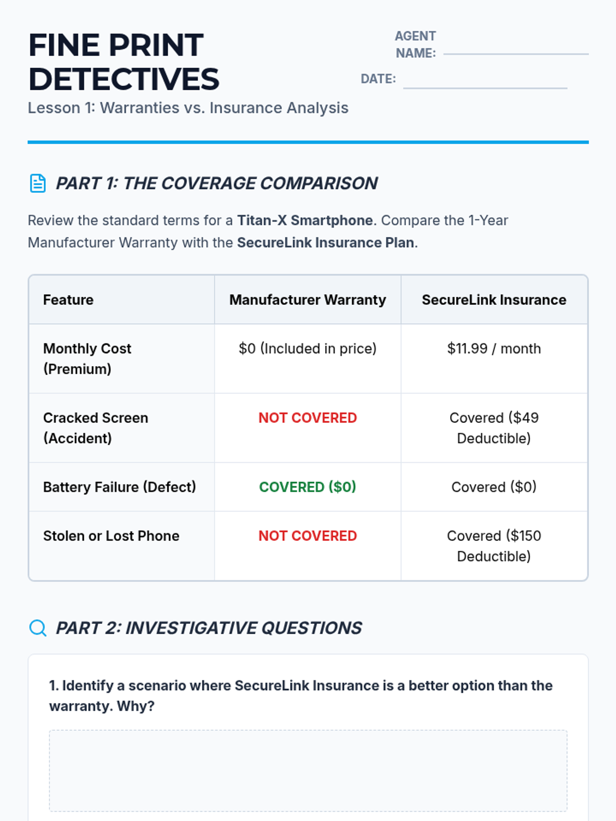 Students investigate the difference between manufacturer warranties and third-party insurance plans using cell phones as the primary case study.