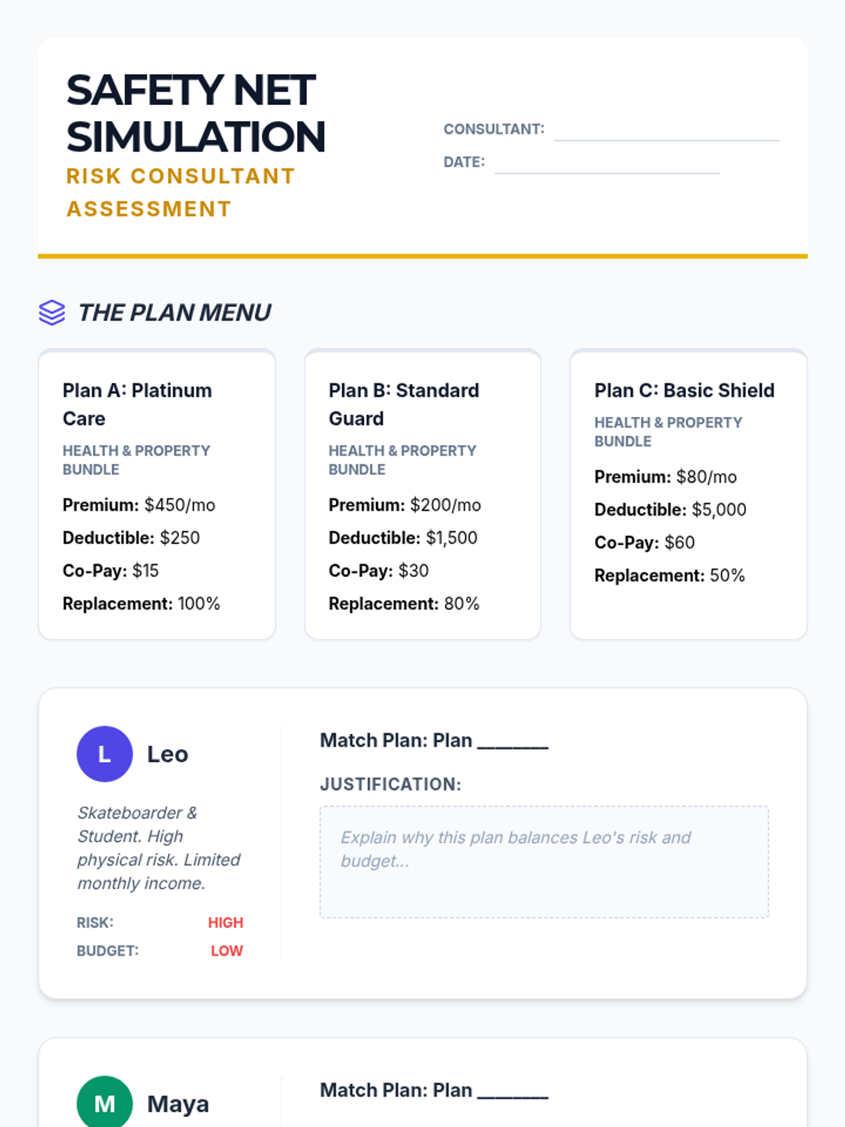 Students are presented with three different health/property plans and three different 'life profiles.' They must match the best plan to the profile based on lifestyle risks and budget.