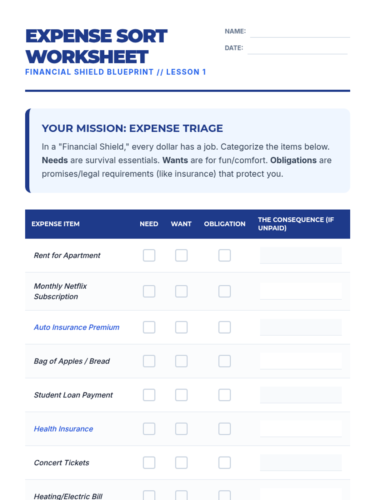 Students categorize expenses into needs, wants, and obligations, specifically identifying insurance as a critical financial obligation that protects assets.