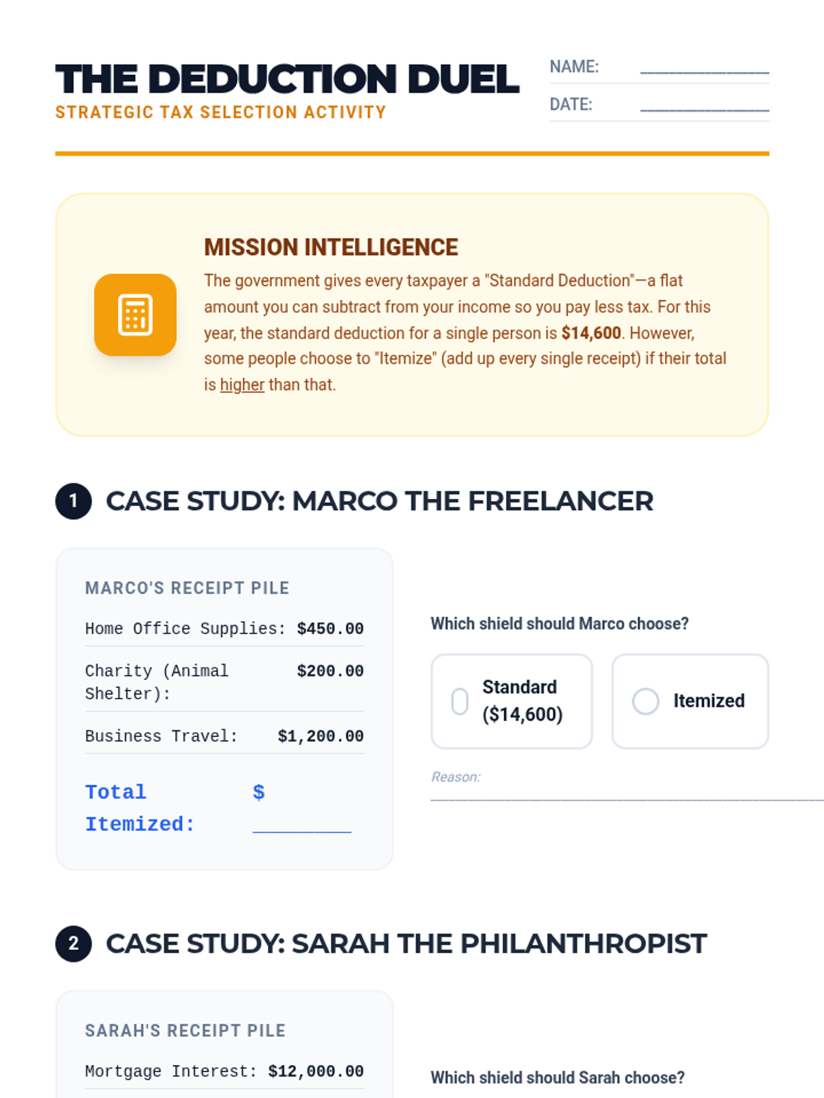 Students compare the standard deduction to itemizing deductions through a 'shopping spree' analogy and real-world scenarios.