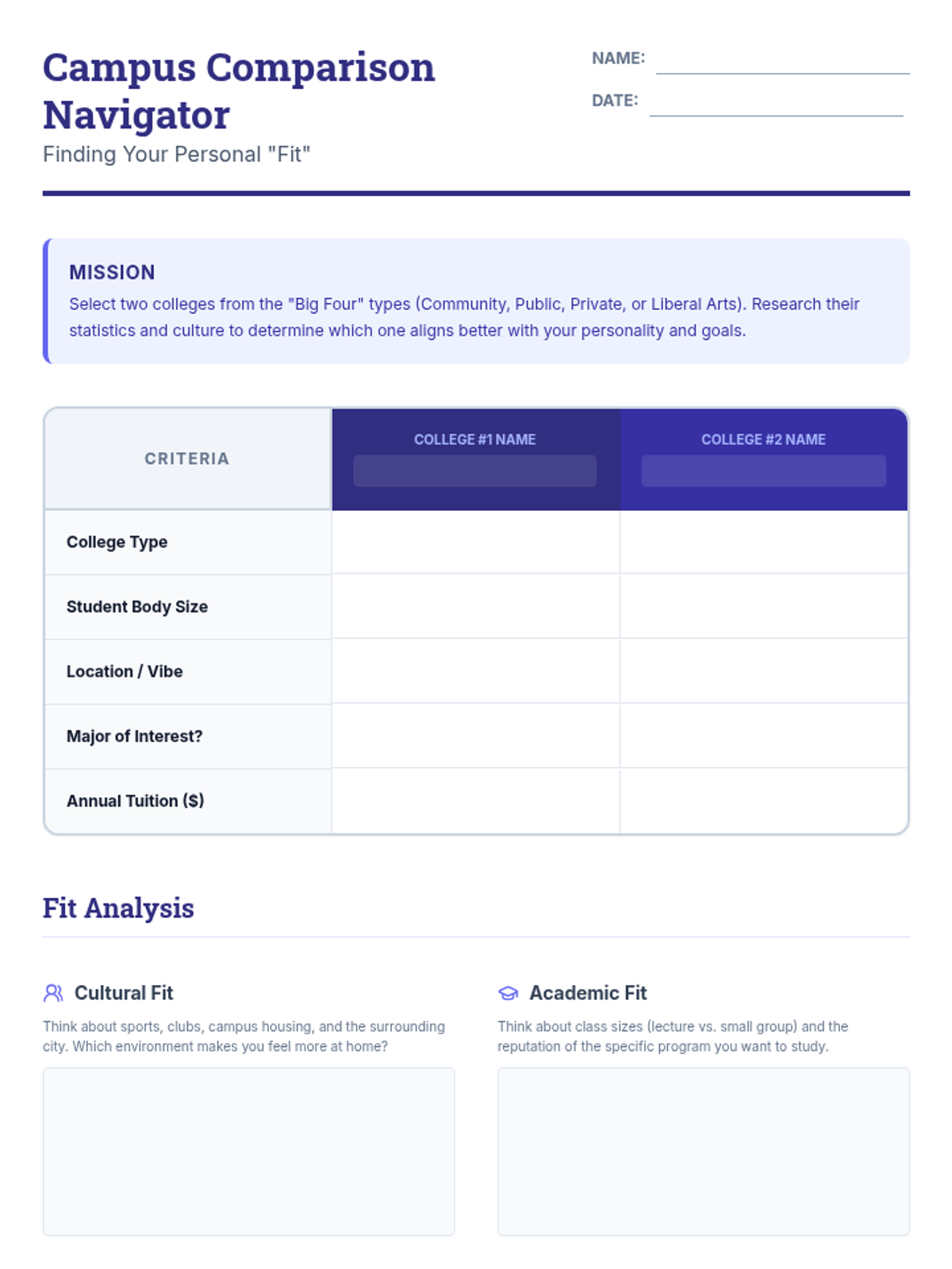 Students research the differences between public, private, community, and liberal arts colleges. They explore concepts like majors, minors, and campus culture to understand what fits their personality and academic needs.
