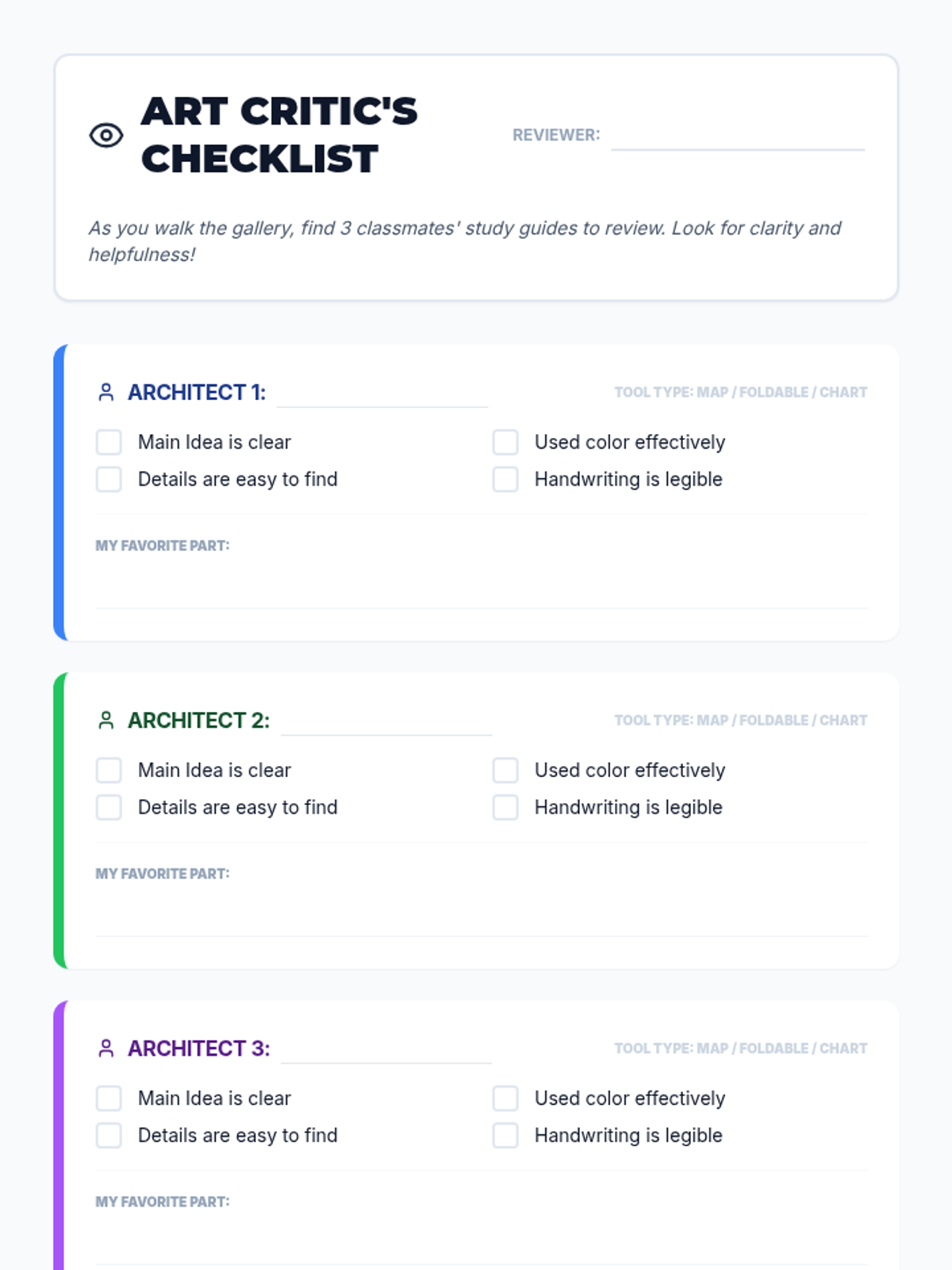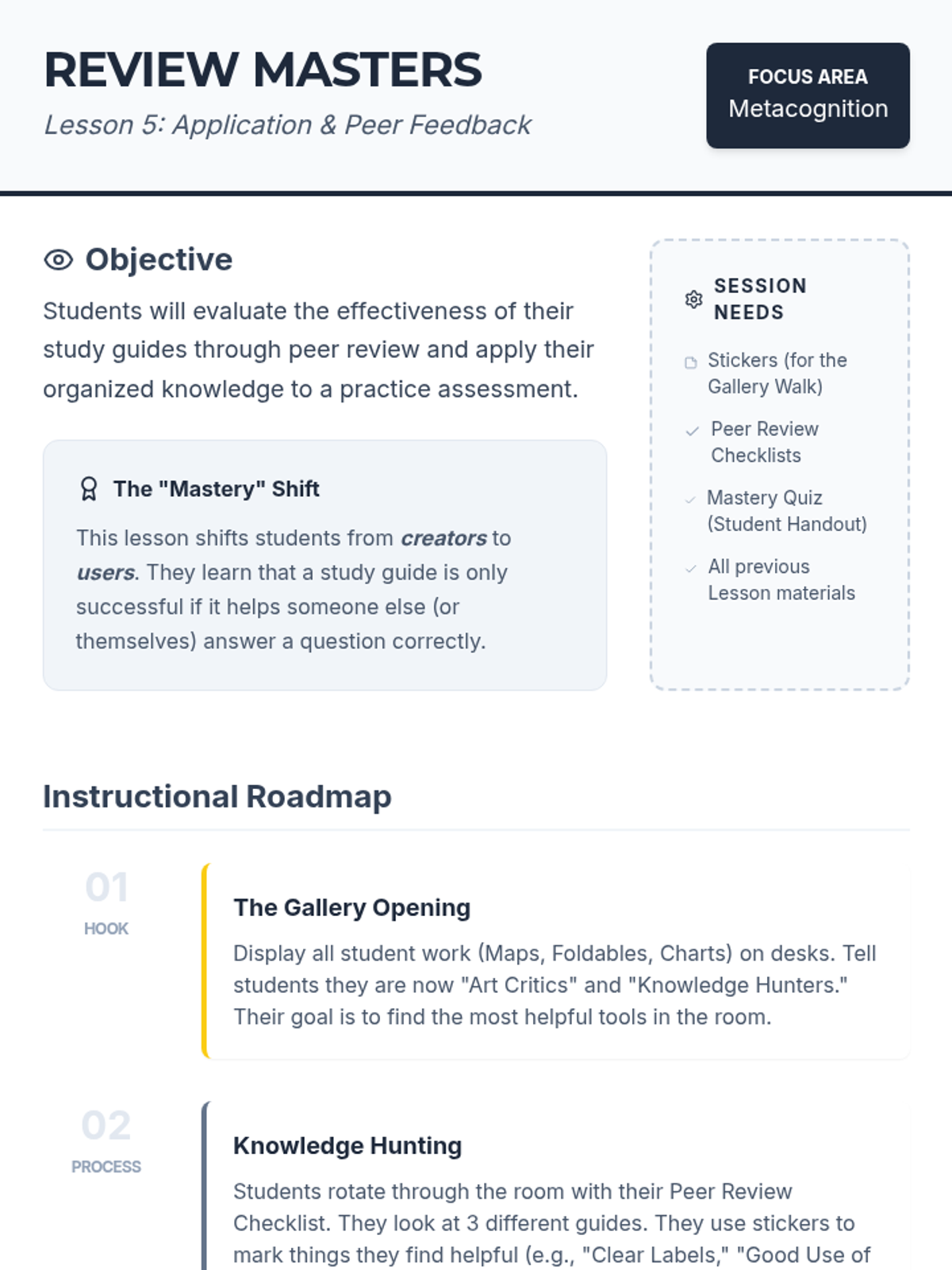 Students peer-review their study guides and apply them to a practice quiz, practicing metacognitive reflection on their learning tools.