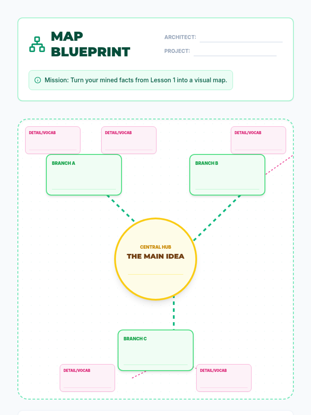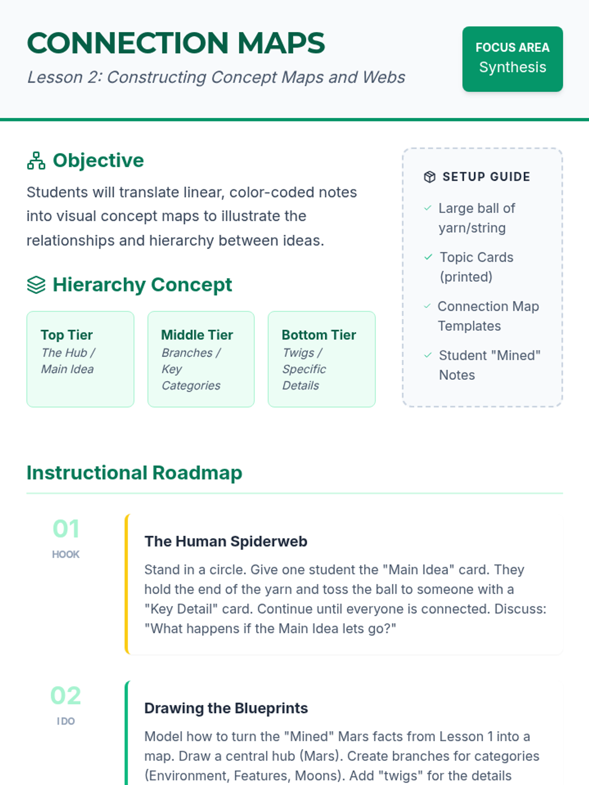 Students translate linear notes into visual concept maps to show hierarchical relationships between ideas.
