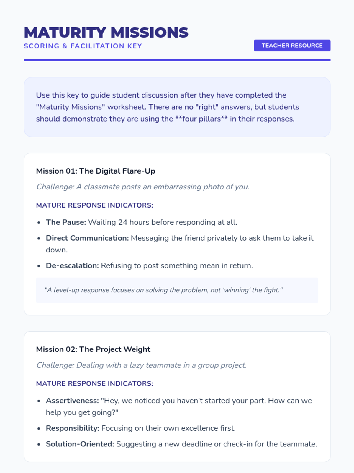 A fast-paced formative assessment game where students identify the four pillars of maturity (Emotional, Social, Intellectual, and Physical) through real-world scenarios. Includes a visual slide deck, a bank of 40+ scenarios for the teacher, and reference cards for students.