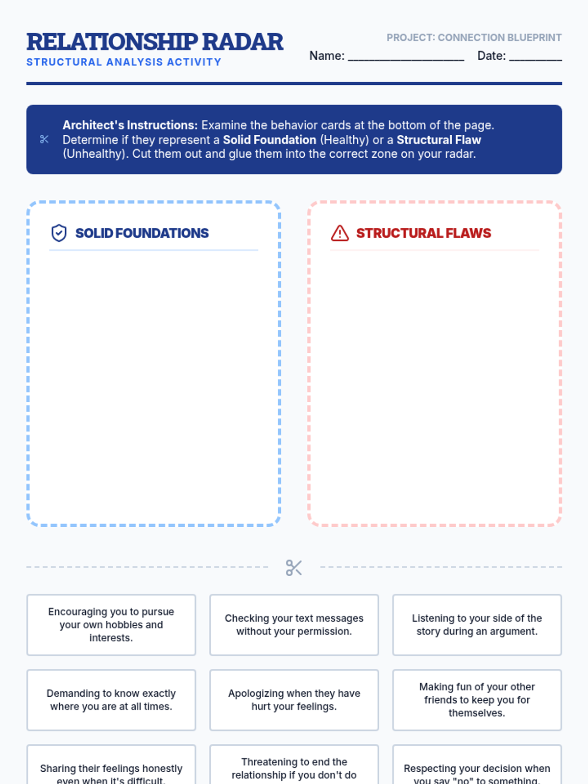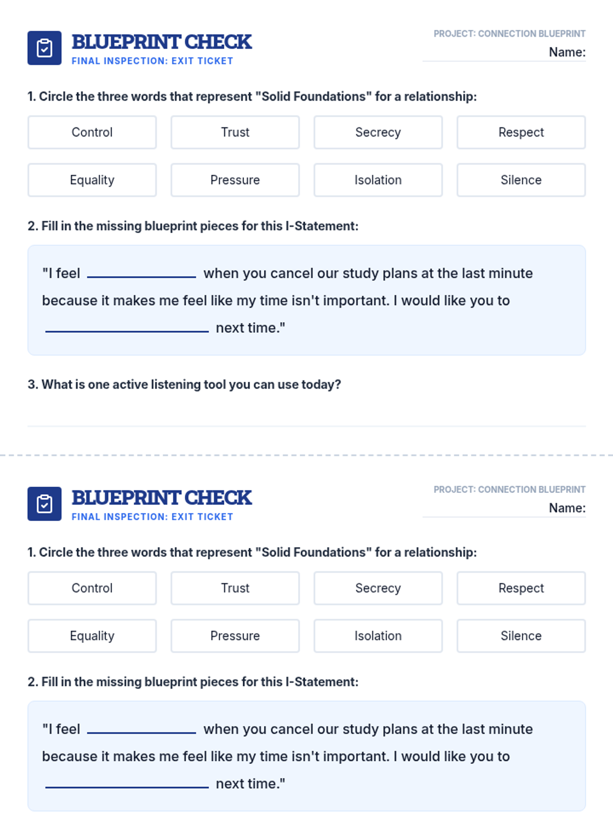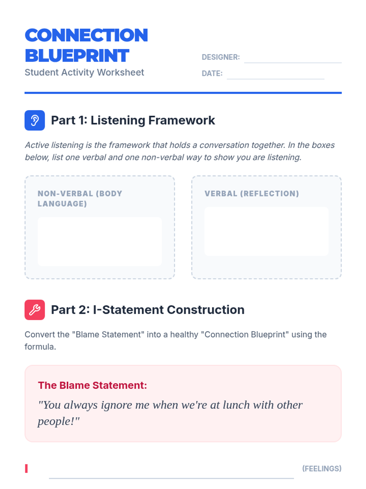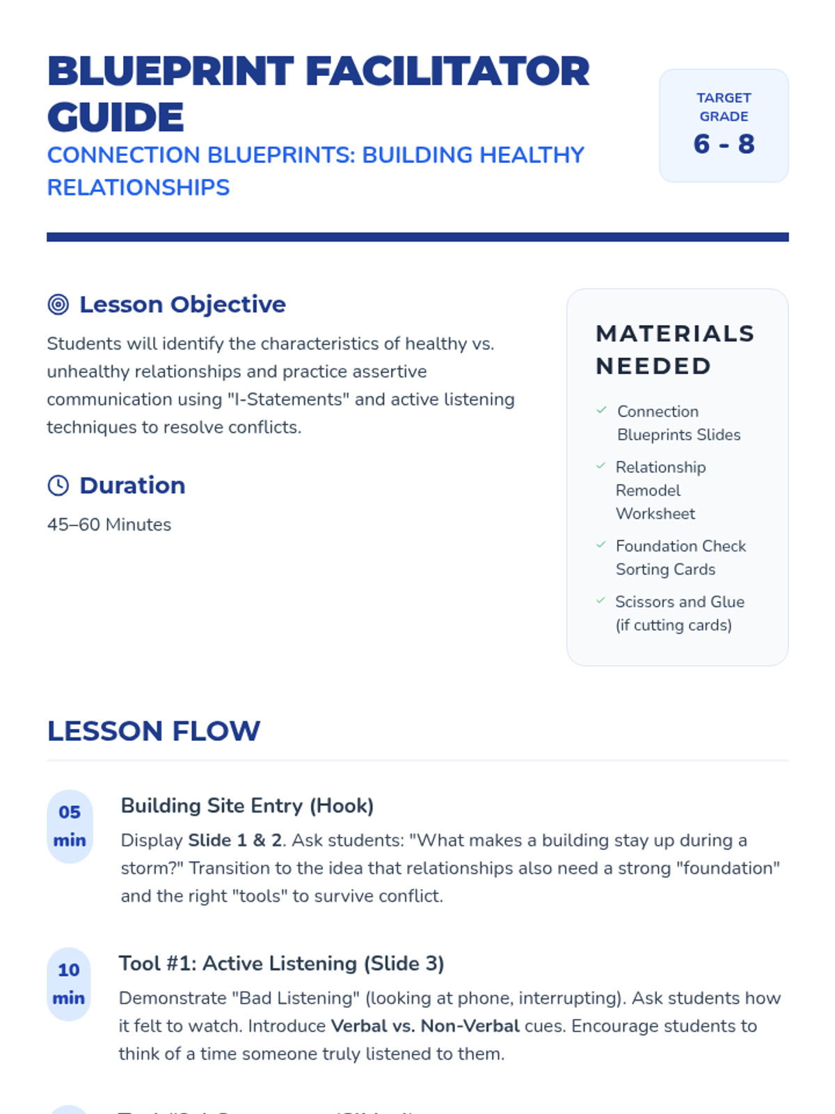 A comprehensive lesson for middle schoolers focused on developing the 'blueprints' for healthy relationships through active listening, assertive communication with I-statements, and identifying relationship red and green flags.