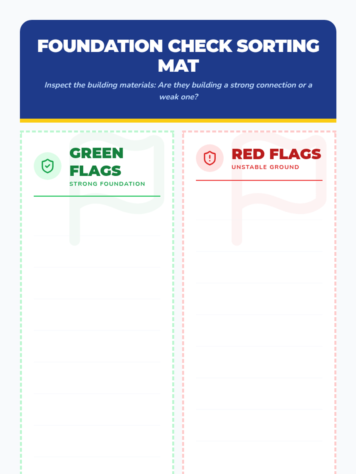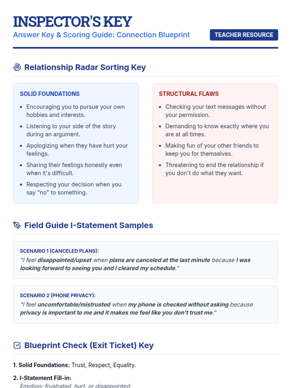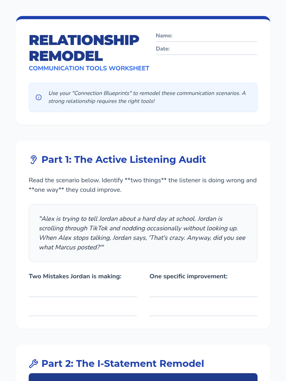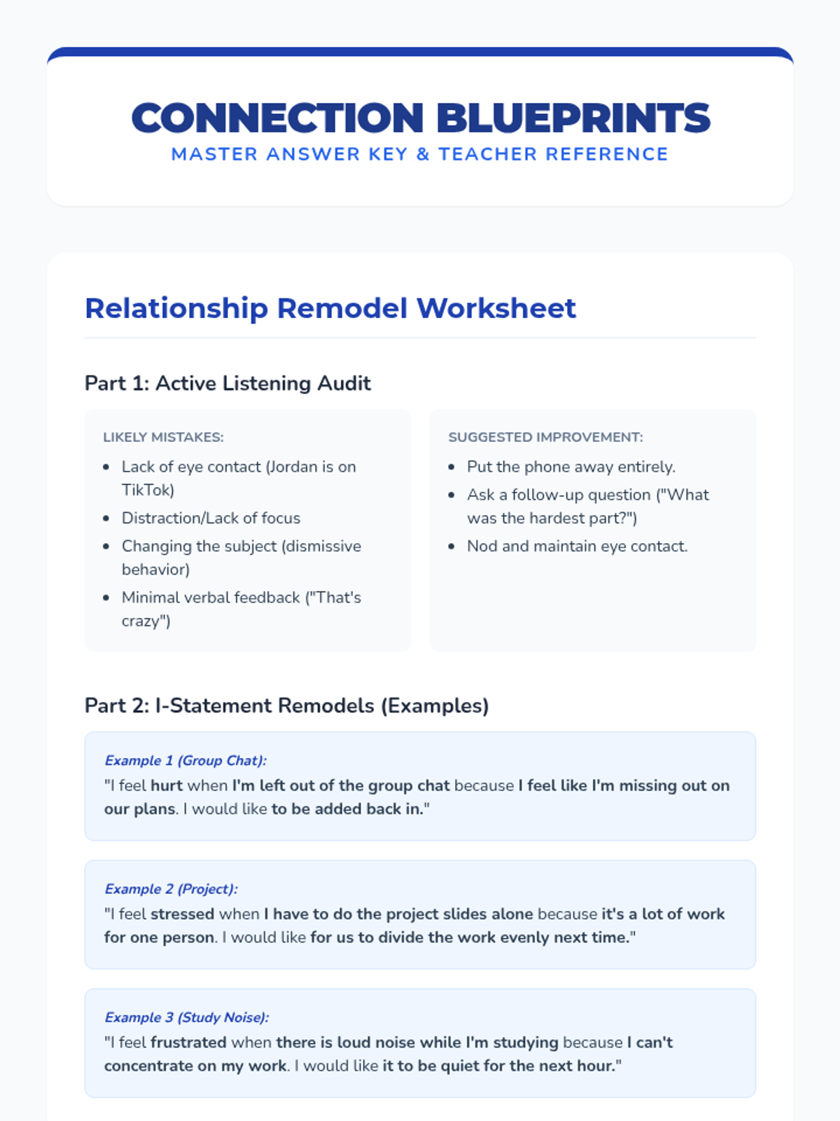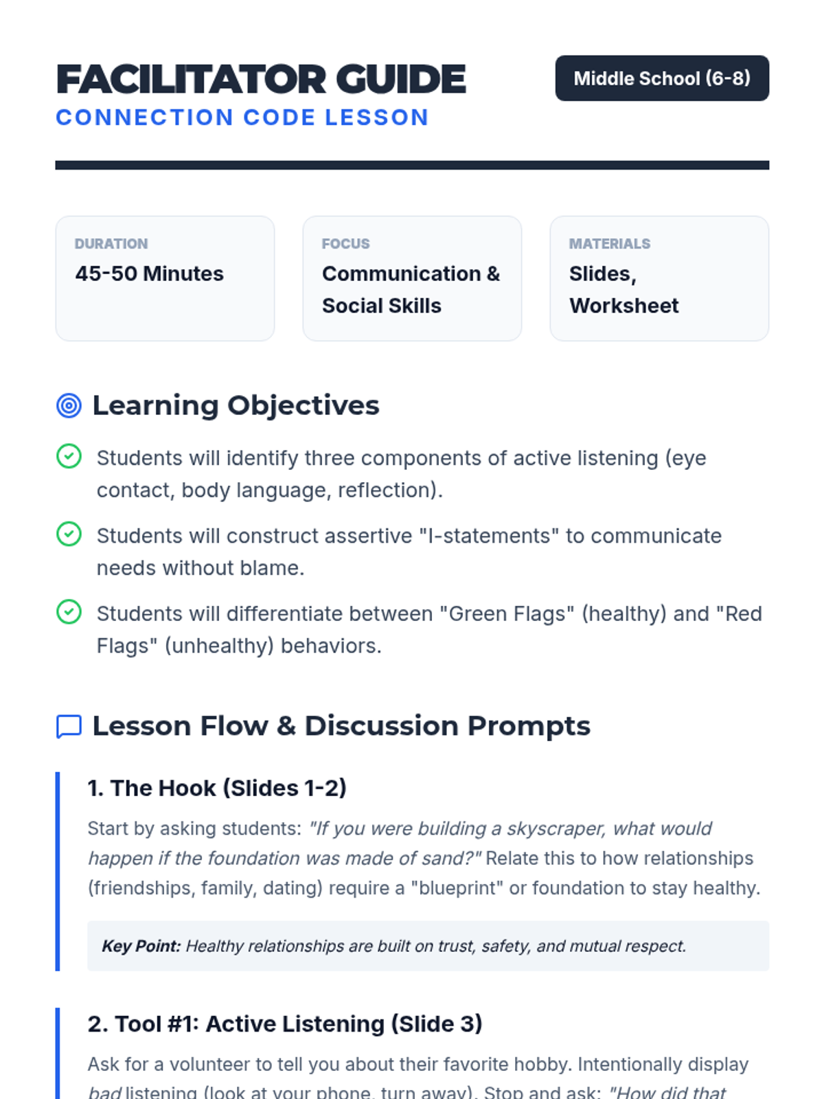 A comprehensive lesson for middle schoolers focused on developing the 'blueprints' for healthy relationships through active listening, assertive communication with I-statements, and identifying relationship red and green flags.