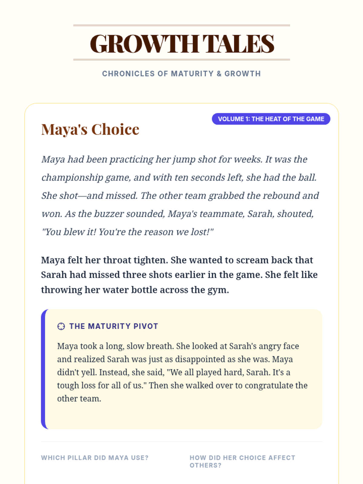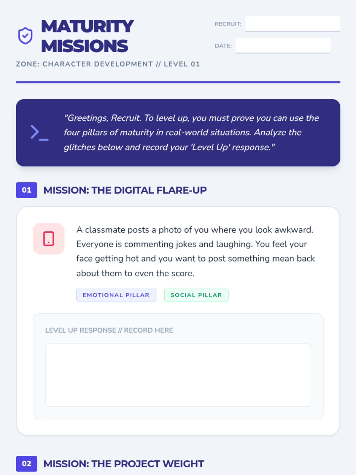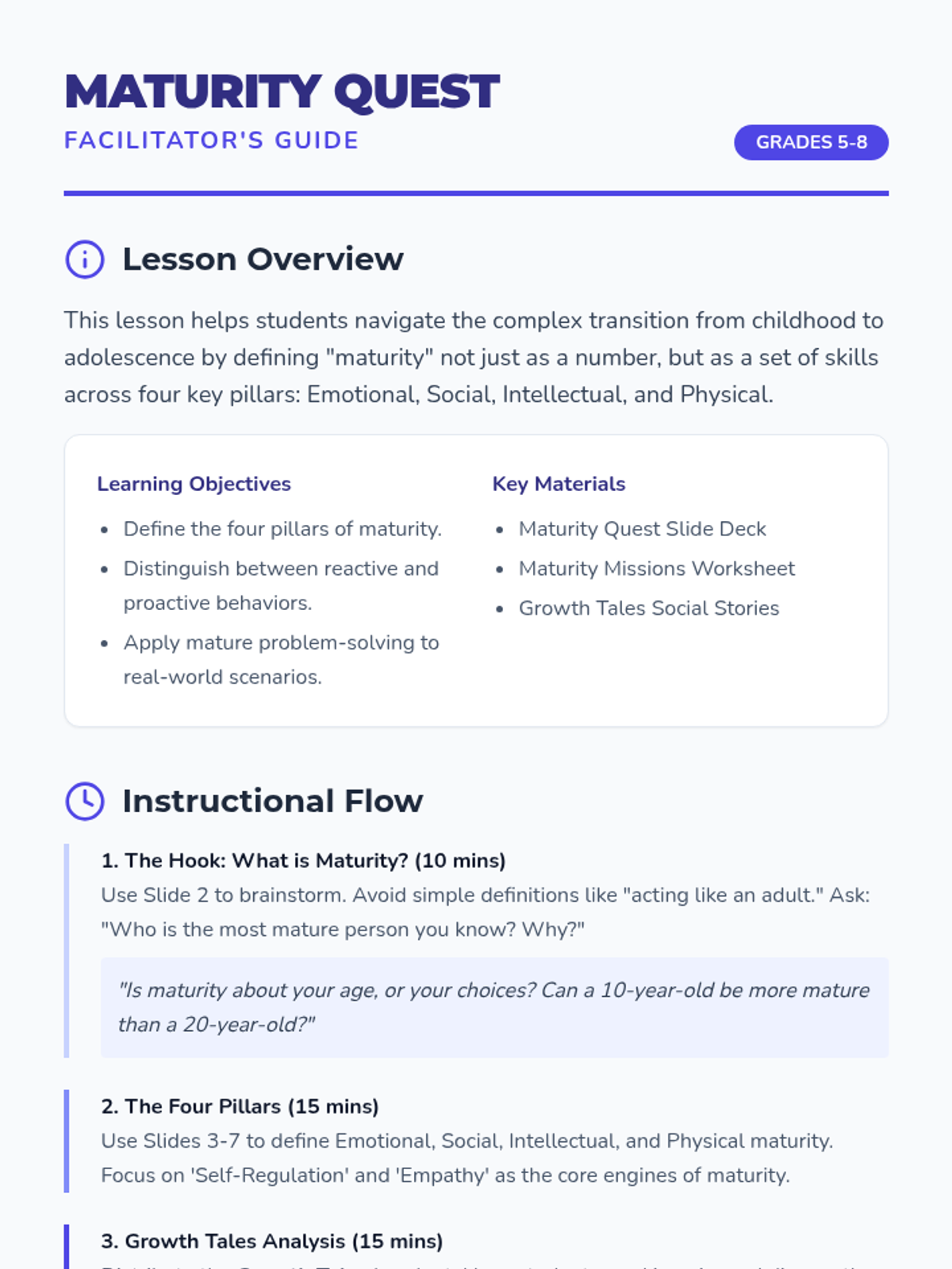 A comprehensive lesson exploring the four pillars of maturity: emotional, social, intellectual, and physical. Students will engage with interactive slides, social stories, and scenario-based challenges to understand what it means to 'level up' in their personal growth.
