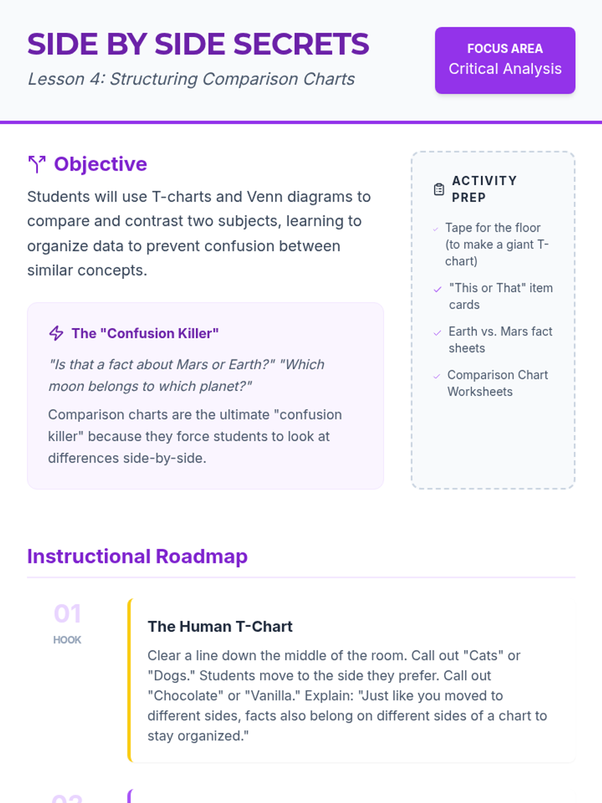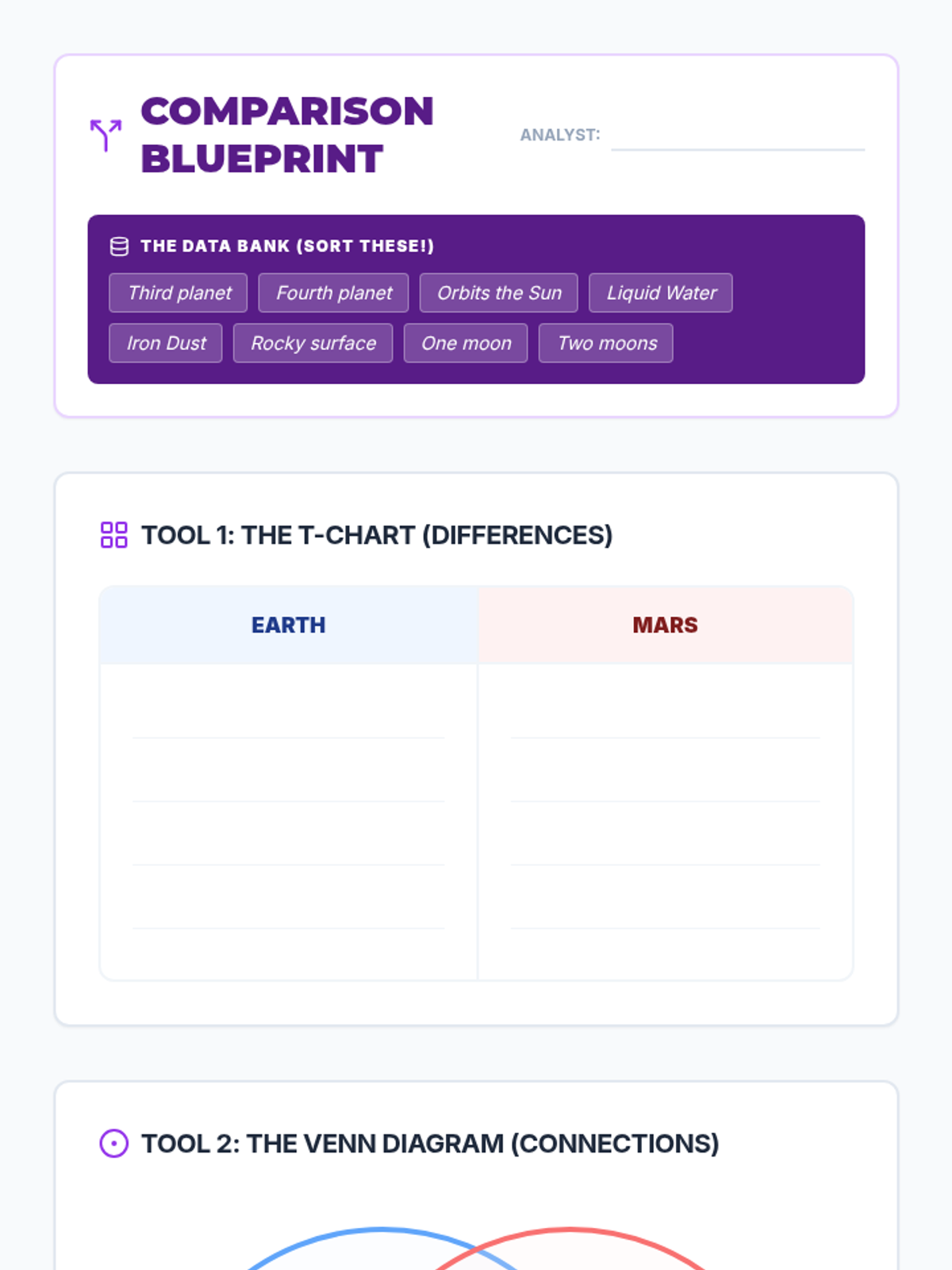 Students use T-charts and Venn diagrams to compare and contrast concepts, organizing data for clearer analysis.