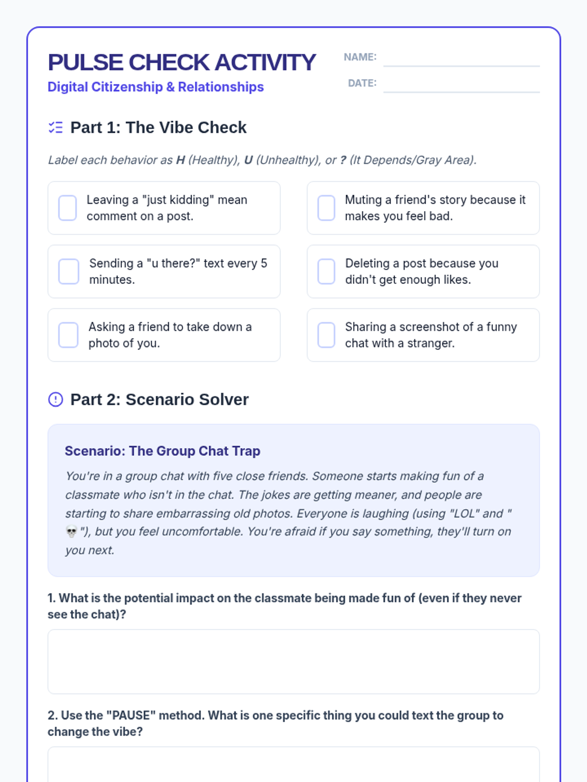 A lesson focused on navigating the complexities of digital life, covering social media etiquette, privacy boundaries, and cyberbullying prevention through realistic scenario-based learning.