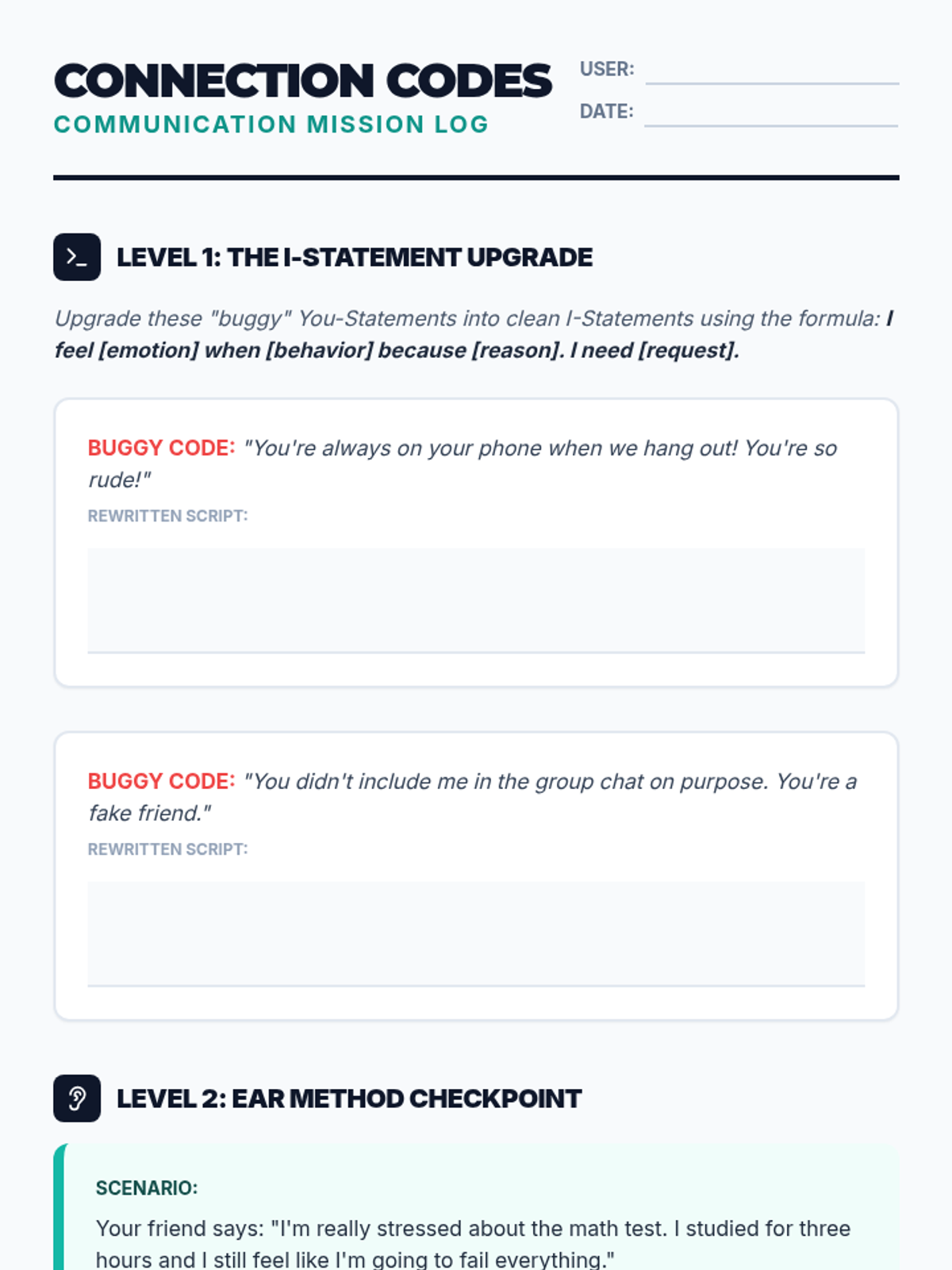Developing active listening skills and healthy conflict resolution strategies. Includes a dialogue-scripting project.