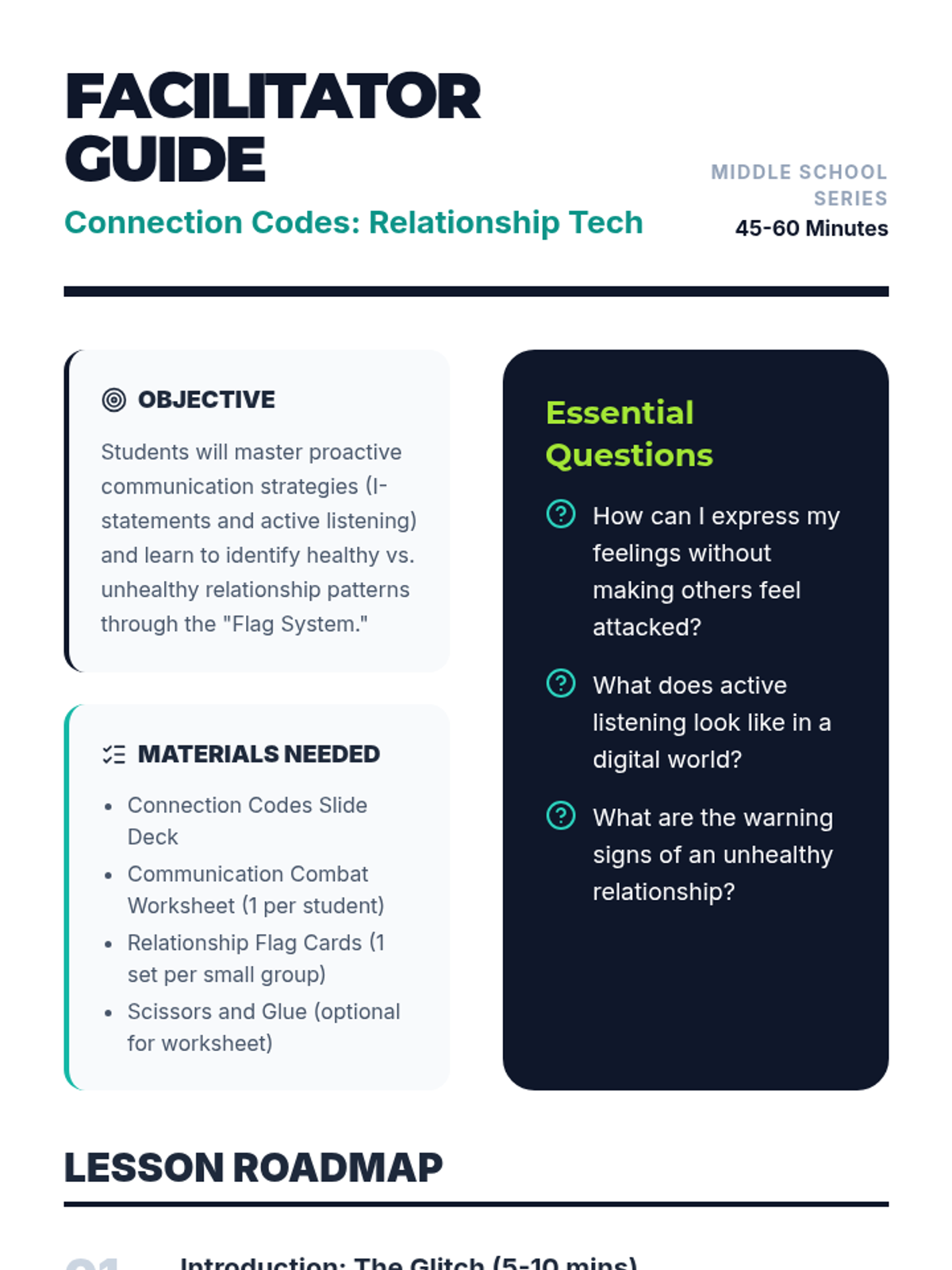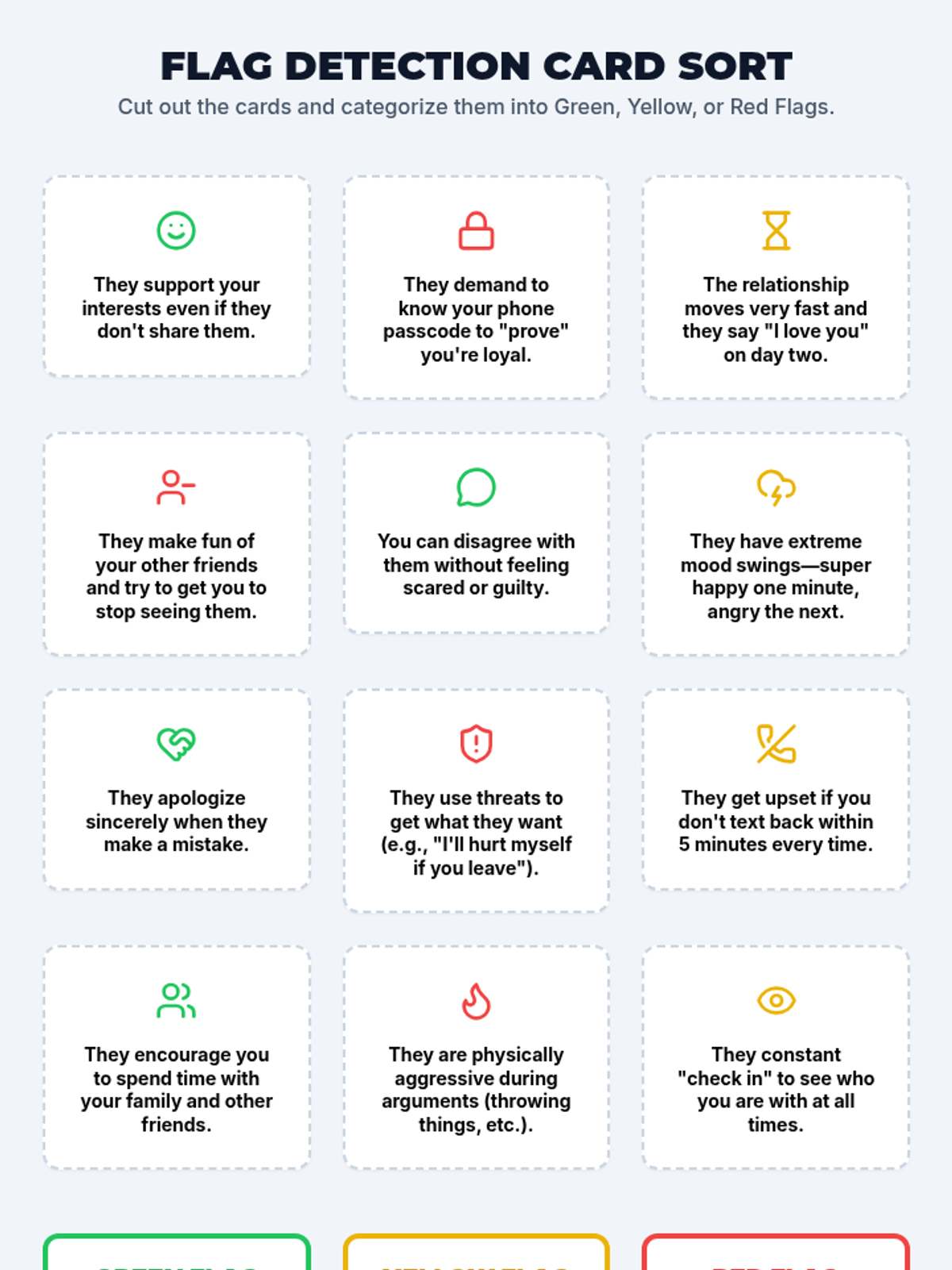 A 40-minute Social-Emotional Learning lesson for grades 7-8 focused on identifying healthy and unhealthy relationship patterns. Students explore the characteristics of respect and trust, recognize red flags like control and isolation, and discuss the nuances of digital-age relationships.