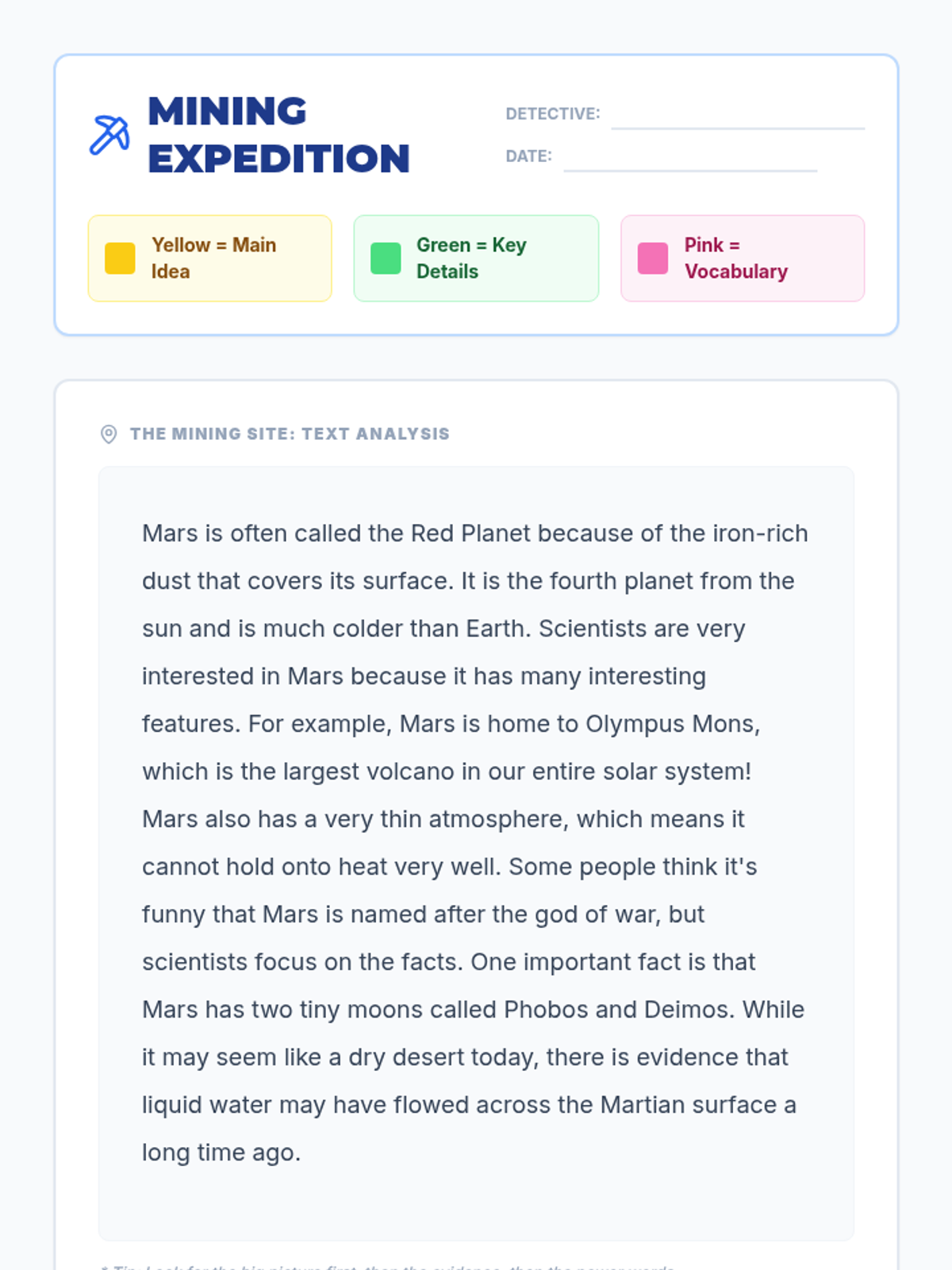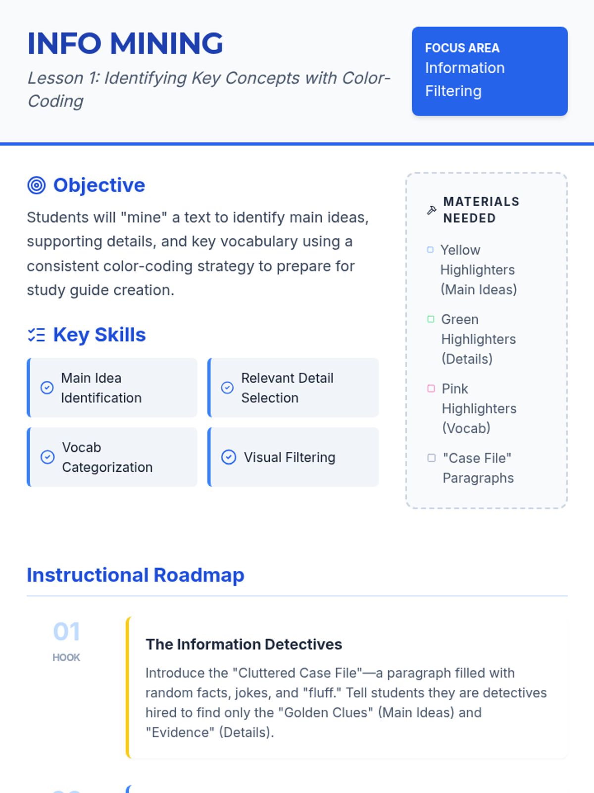 Students learn to 'mine' texts for essential information using a specific color-coding system to distinguish main ideas from supporting details.
