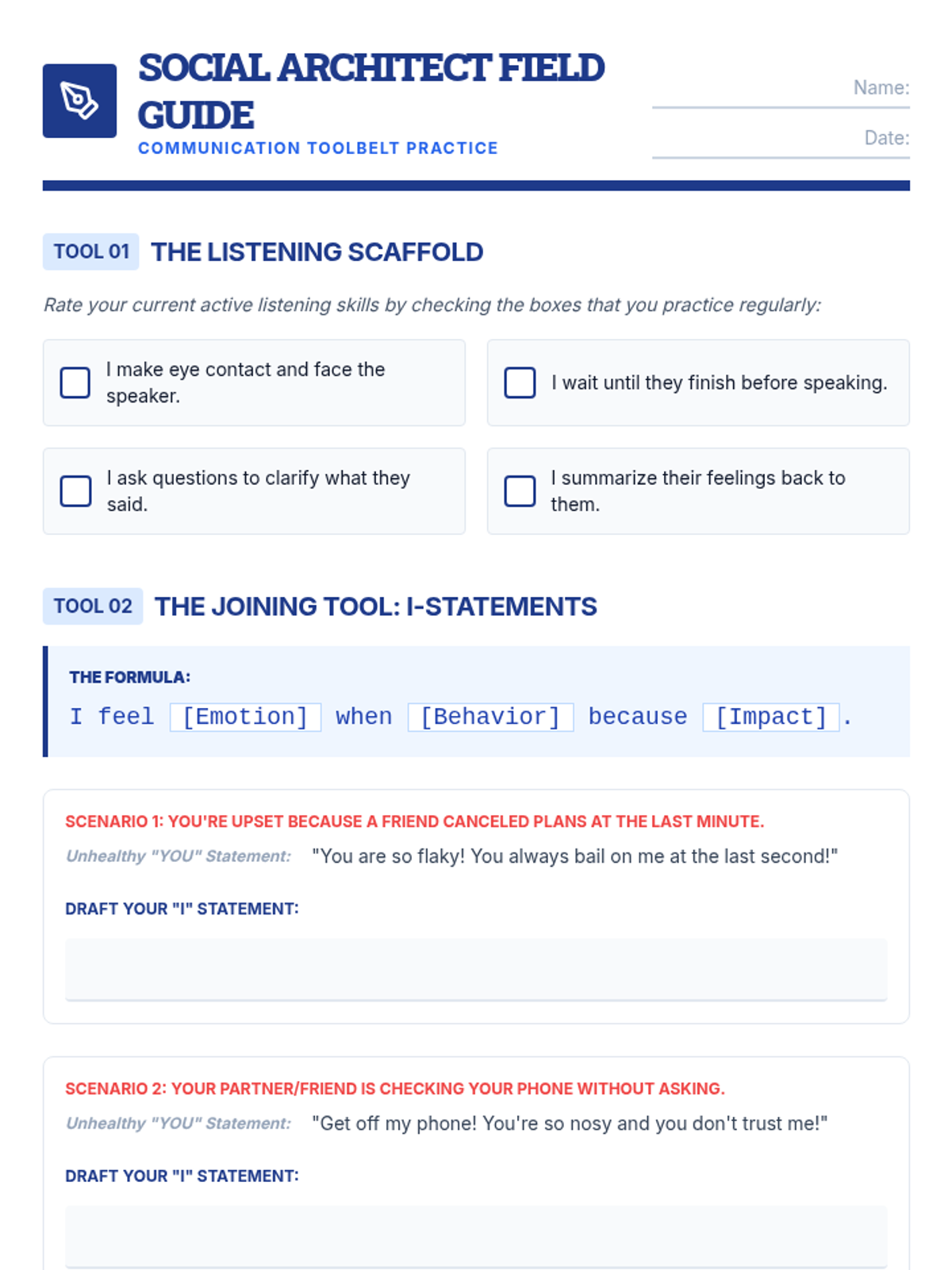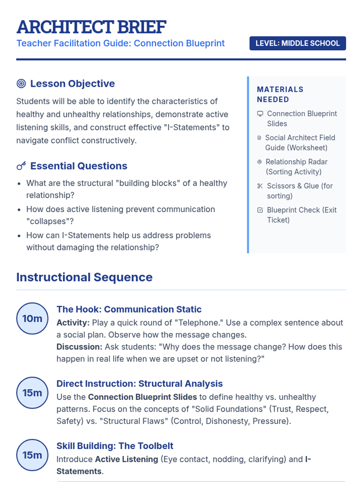 A middle school counseling lesson focused on building healthy relationships through active listening, I-statements, and identifying healthy vs. unhealthy relationship patterns. Students take on the role of 'Social Architects' to build strong connection foundations.