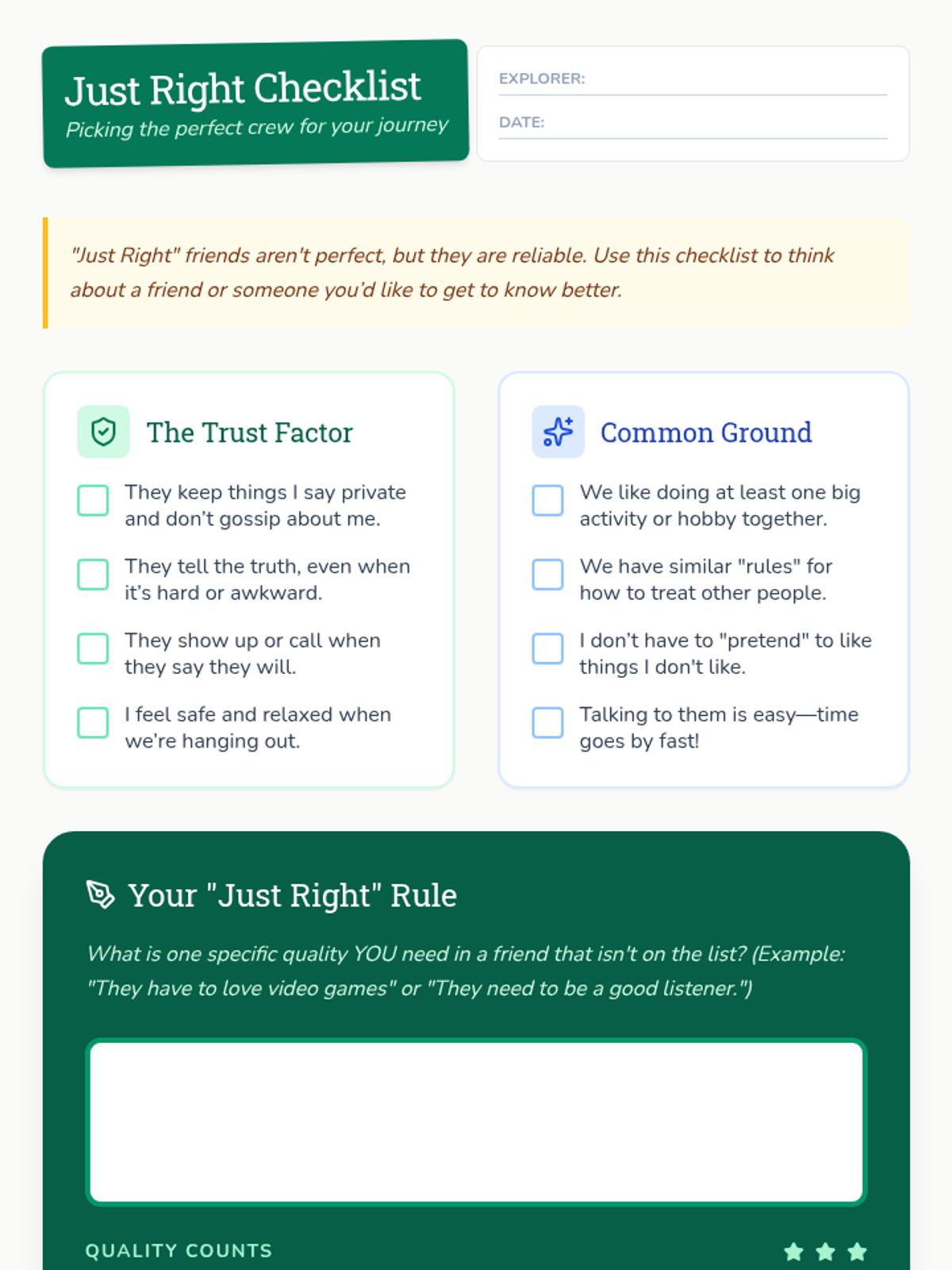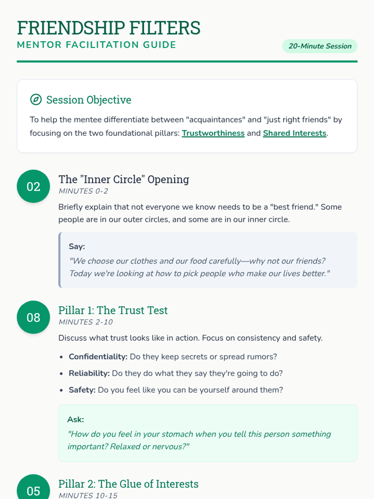 A focused 20-minute mentorship session designed to help mentees identify and cultivate high-quality friendships based on trustworthiness and shared interests.
