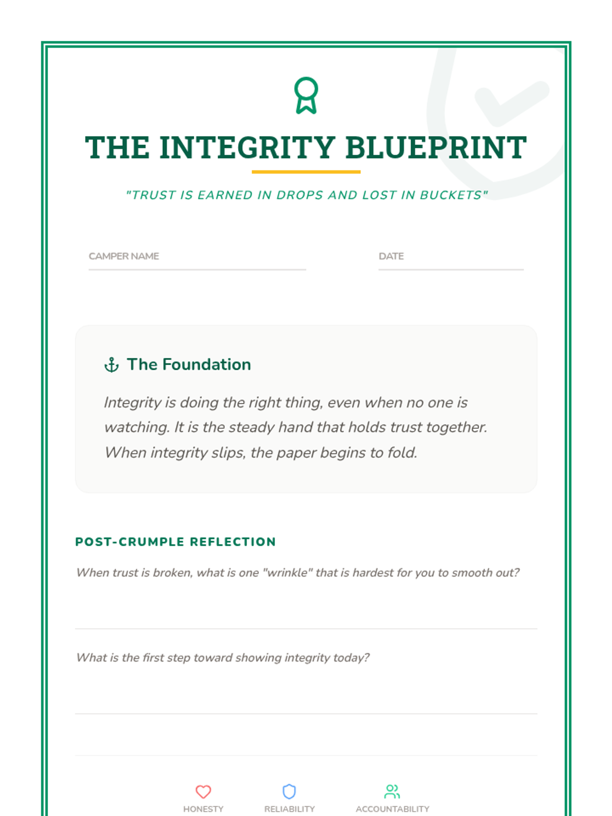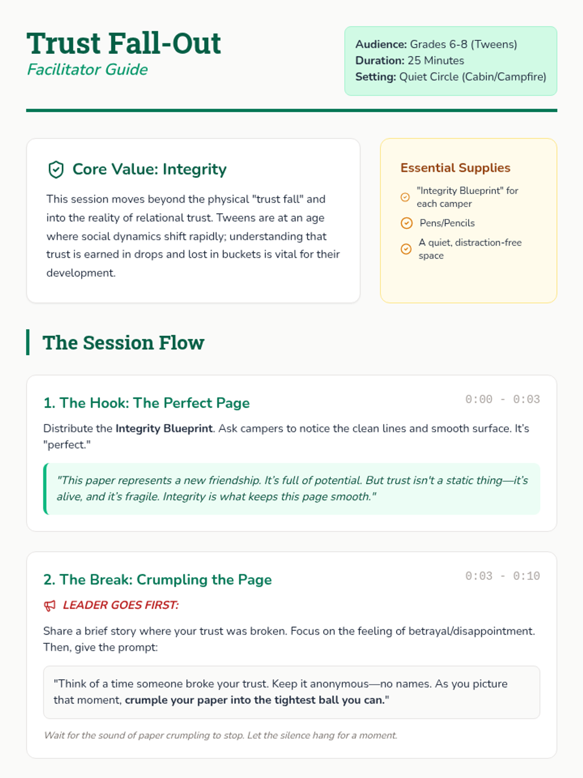 An interactive 25-minute discussion-based lesson for camp counselors to lead tweens in exploring the fragile nature of trust, using the crumpled paper metaphor to understand integrity and rebuilding relationships.