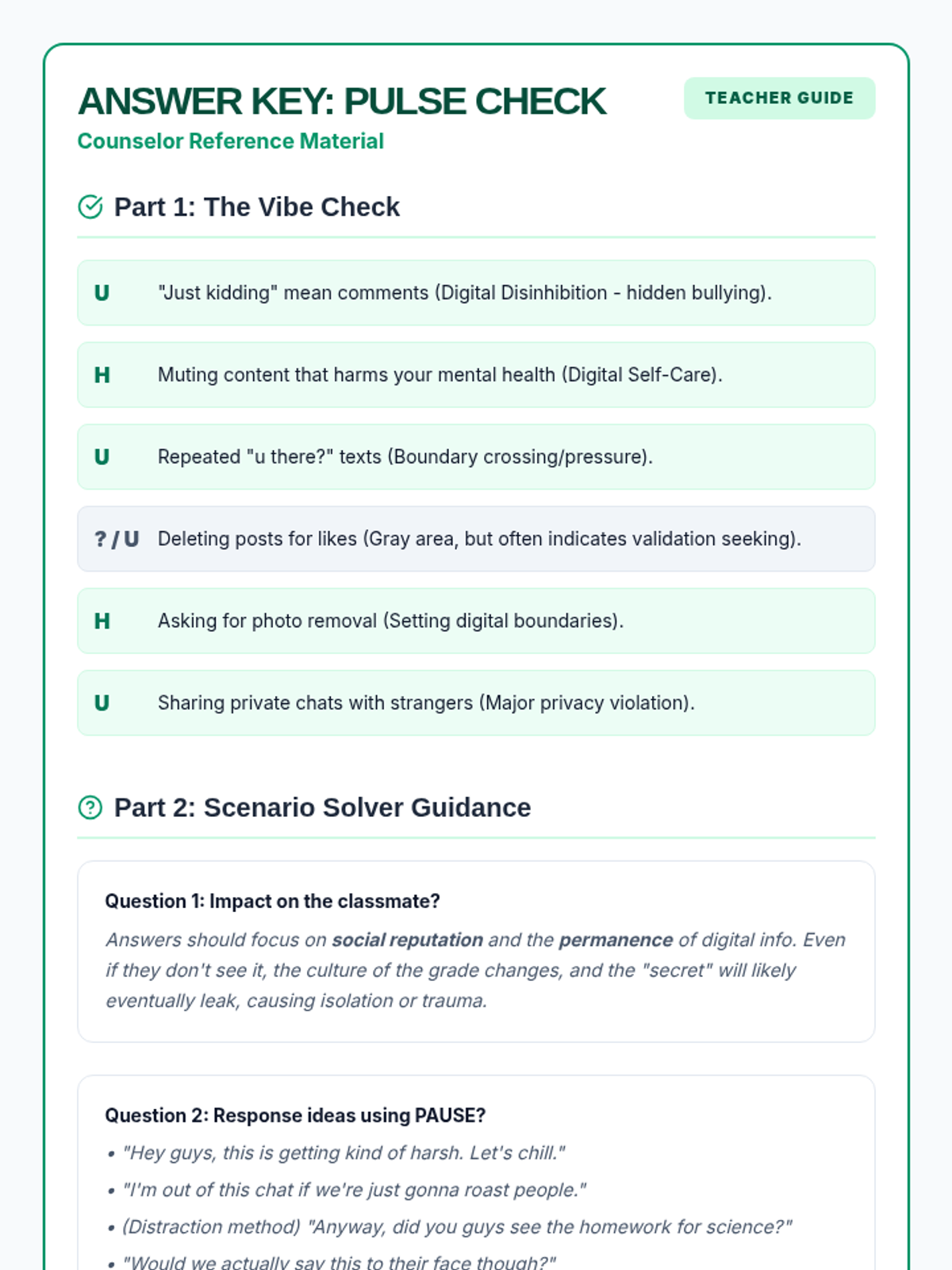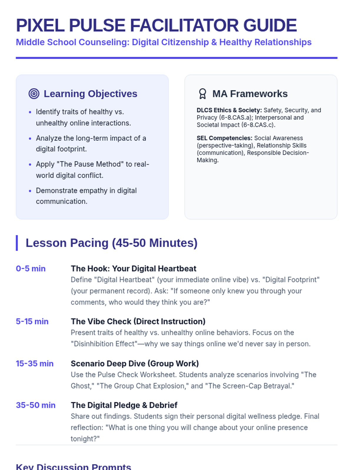 A comprehensive middle school counseling lesson focused on navigating the complexities of online relationships, social media etiquette, and maintaining a healthy digital footprint. Aligned with Massachusetts DLCS and SEL frameworks, students explore real-world scenarios to build empathy and responsible decision-making skills.