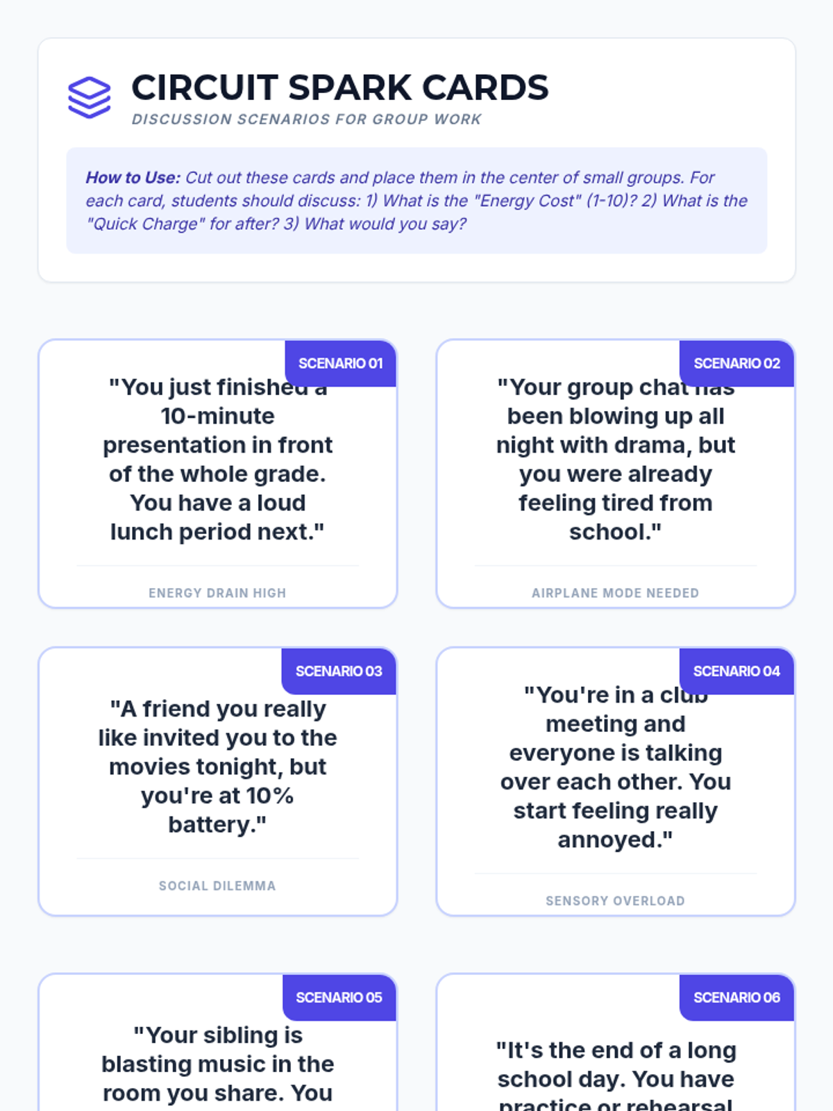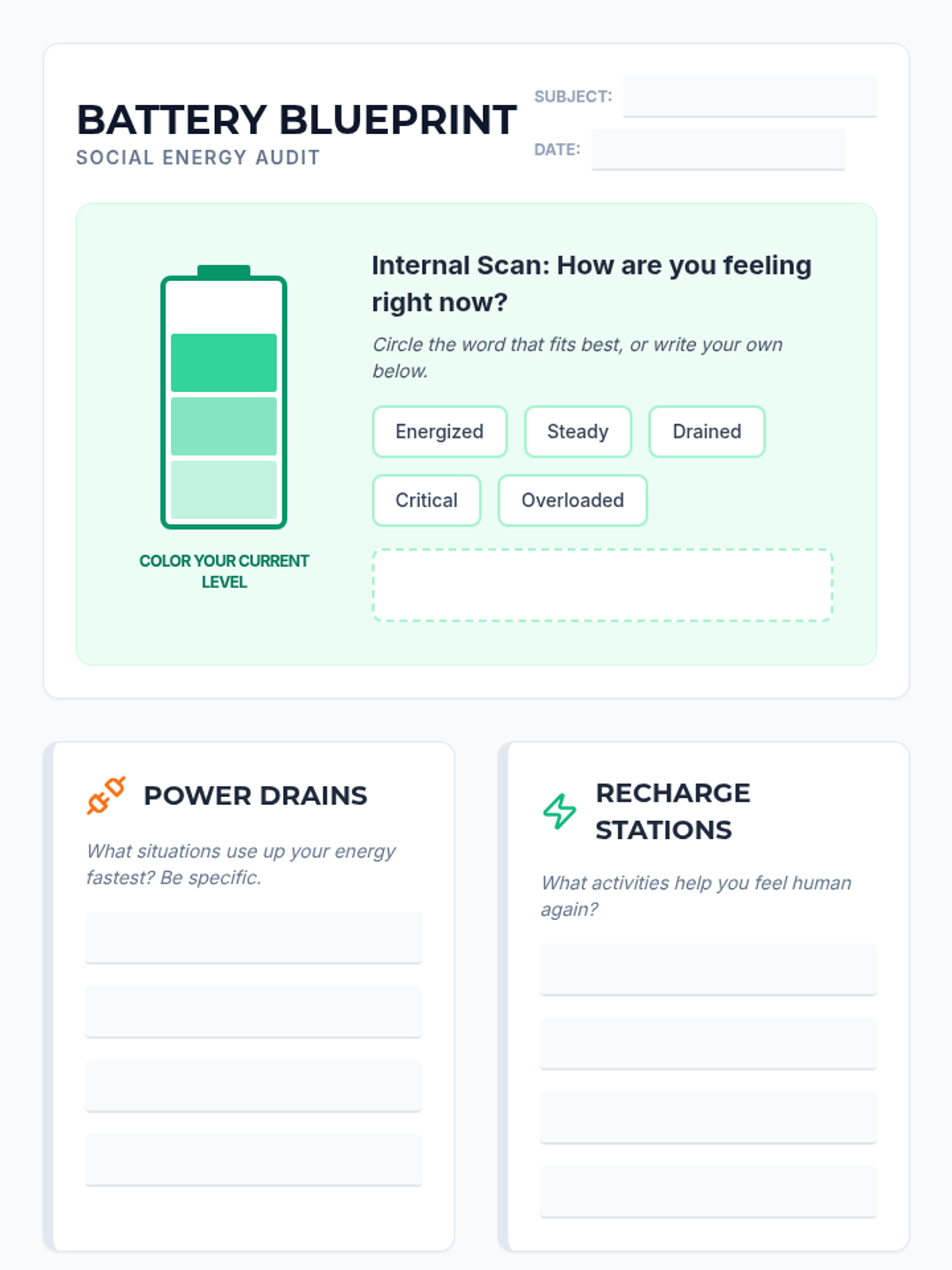 A comprehensive lesson for teens to visualize their social energy as a battery, identifying personal 'drainers' and 'chargers' to develop self-regulation and burnout prevention strategies.