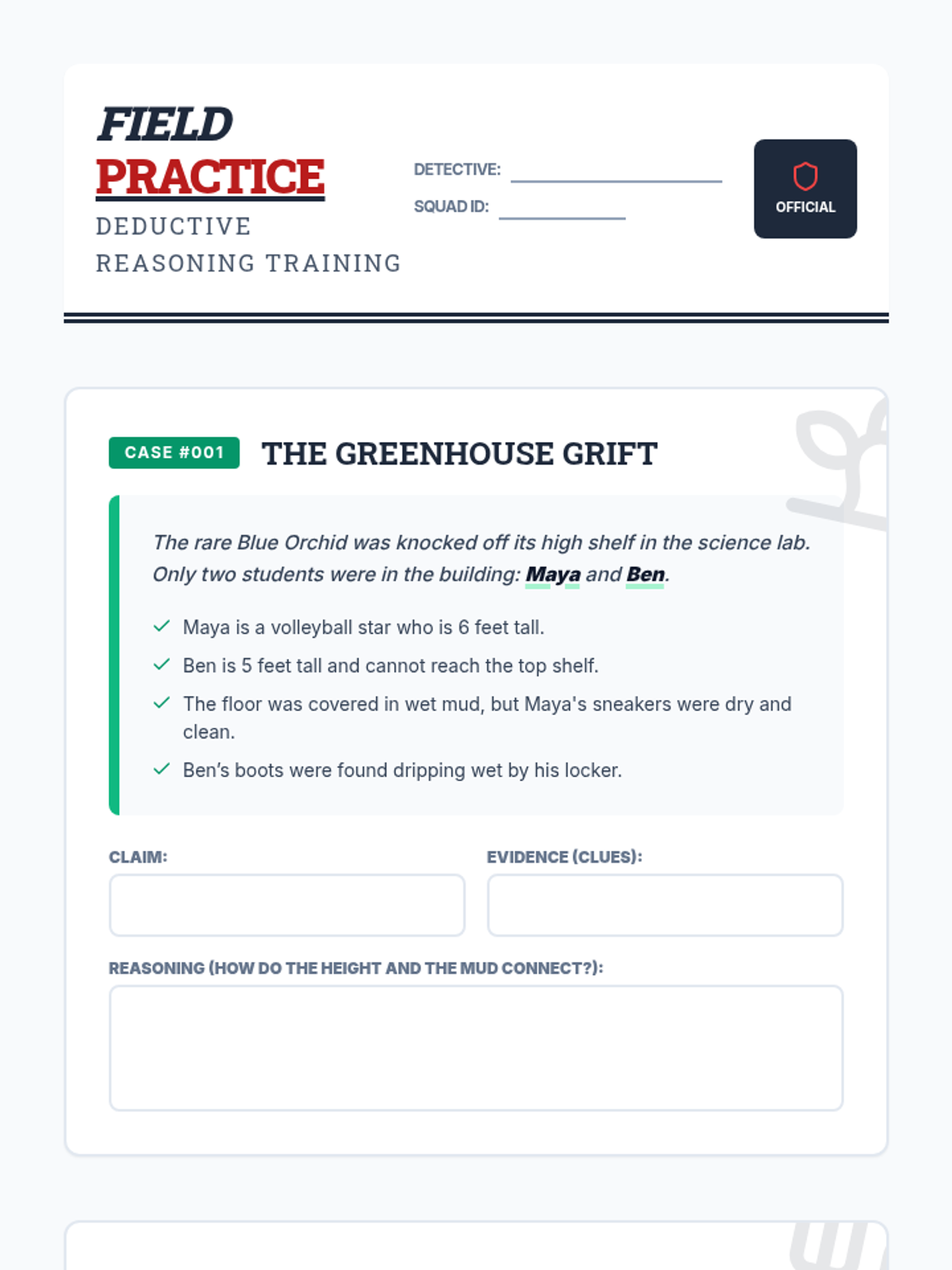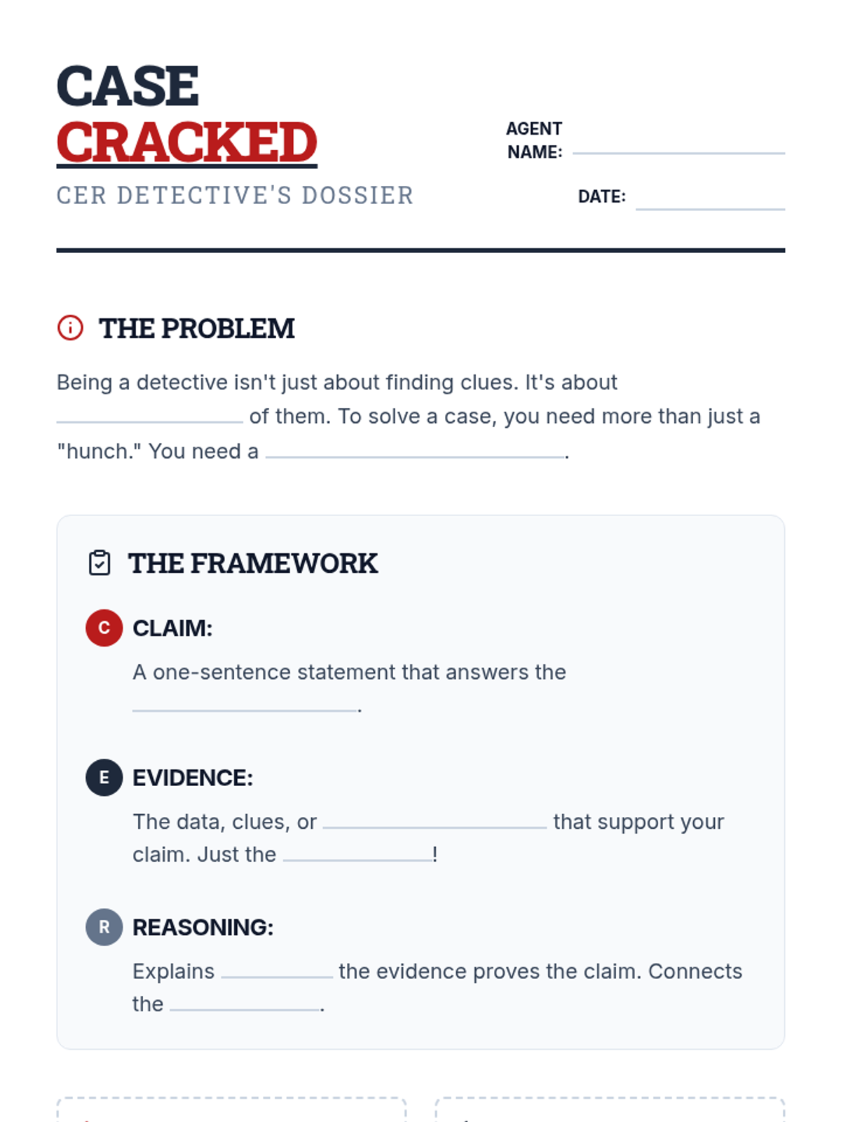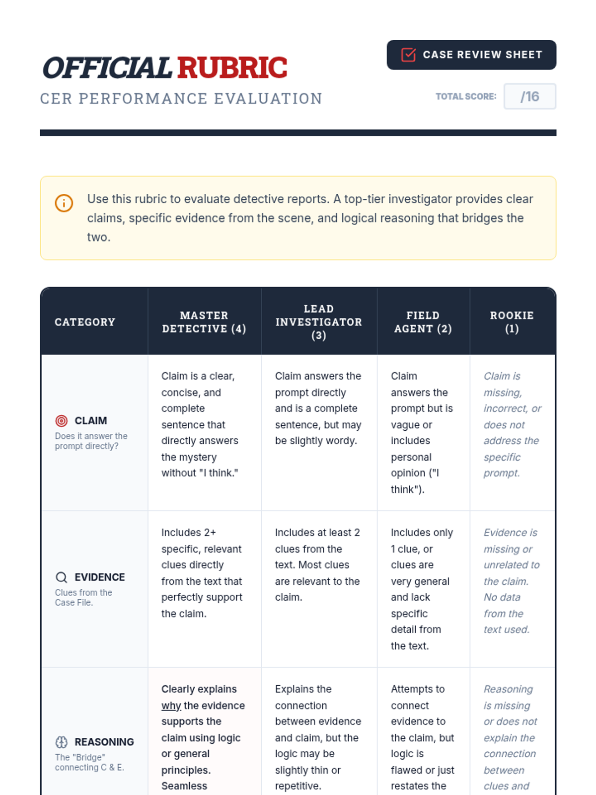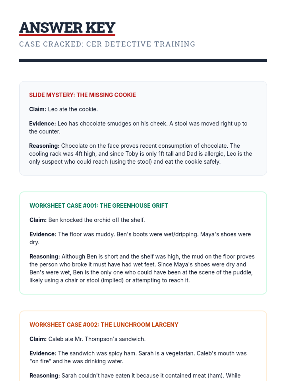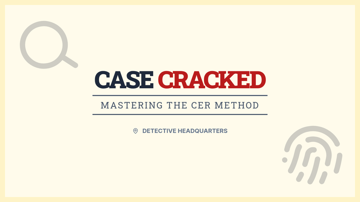 A detective-themed introduction to Claim, Evidence, and Reasoning (CER) using short mystery scenarios to develop critical thinking and argumentative writing skills for junior high students.