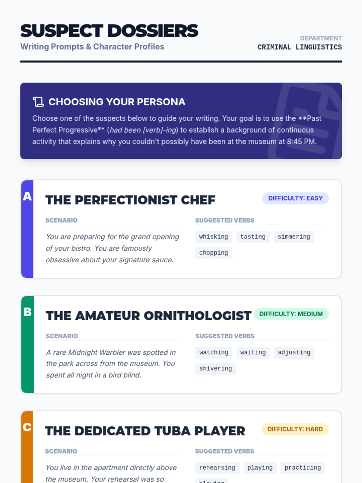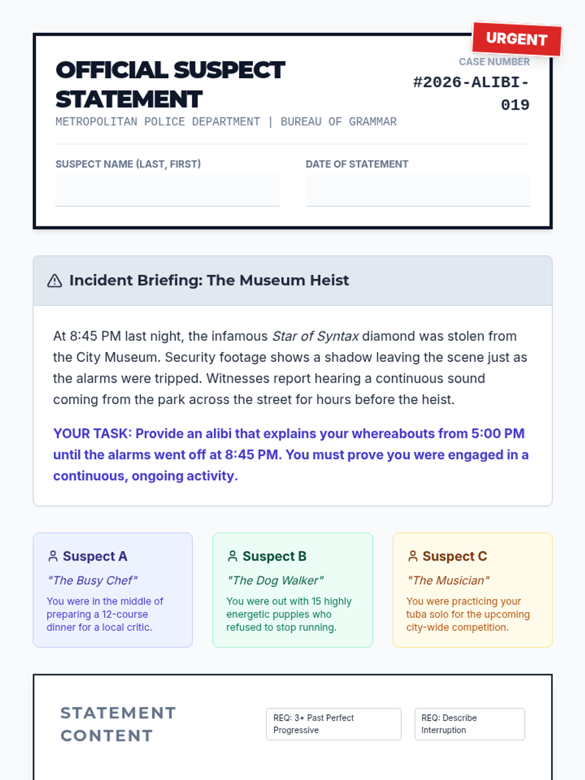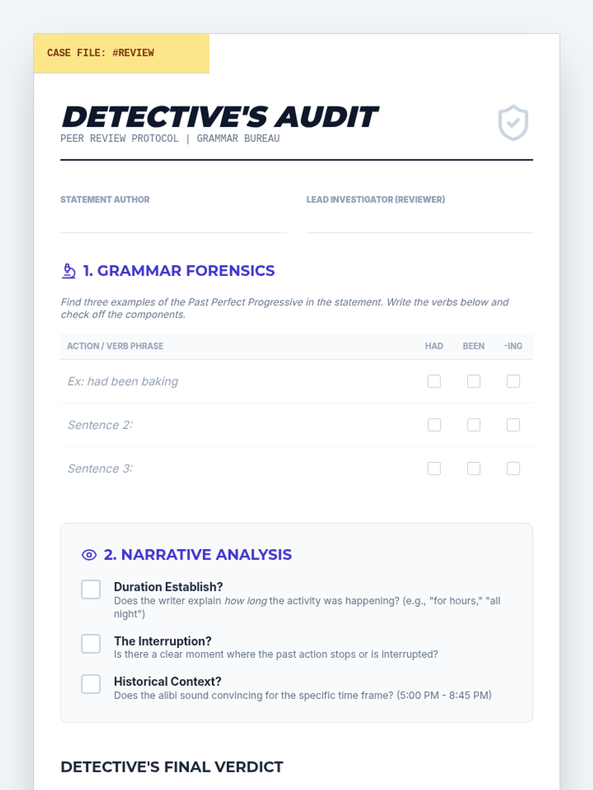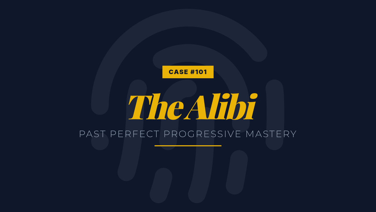 A creative writing lesson for 7th-9th graders focusing on the Past Perfect Progressive aspect. Students use 'The Alibi' mystery scenario to practice establishing continuous backstory and context.