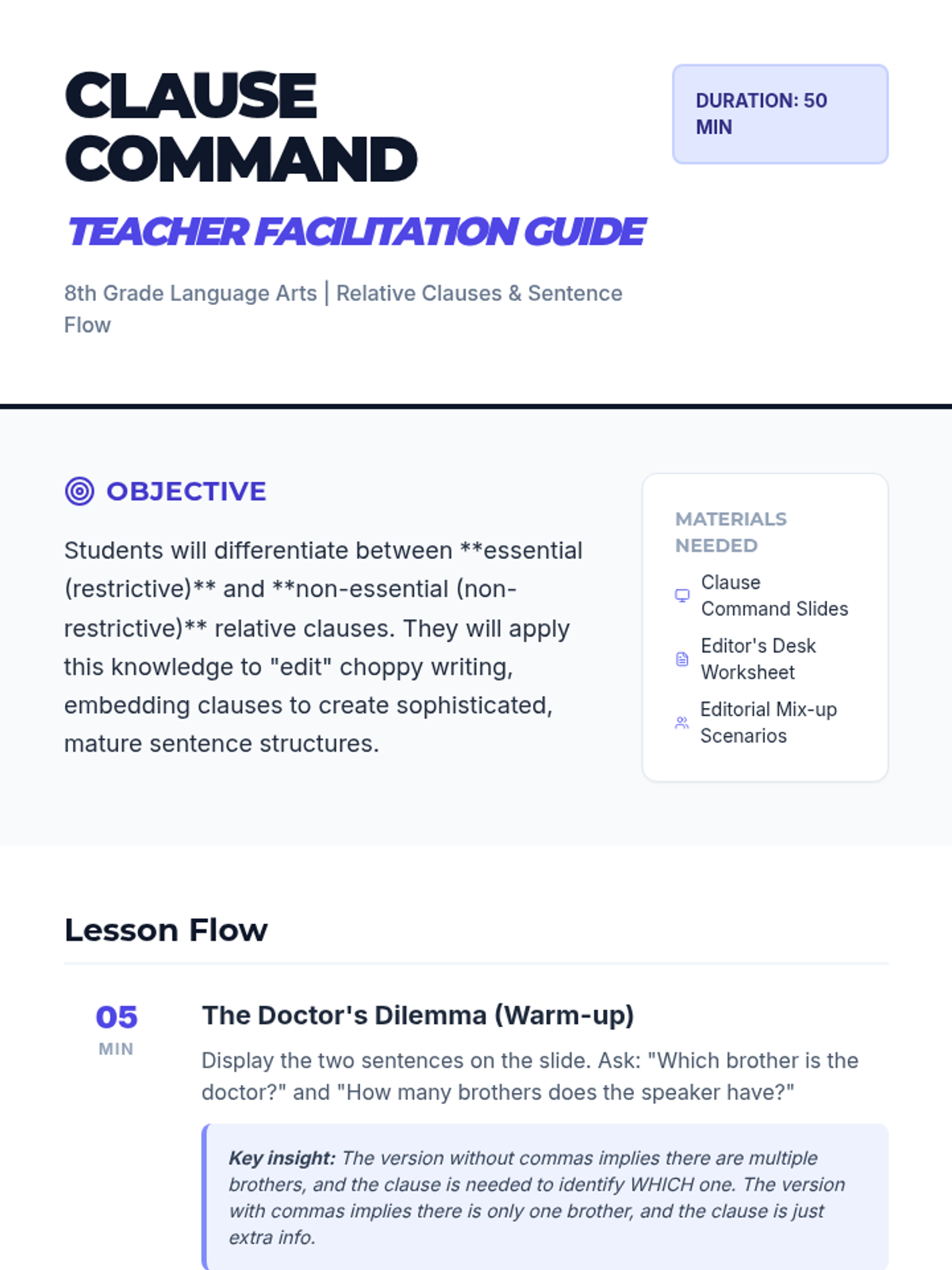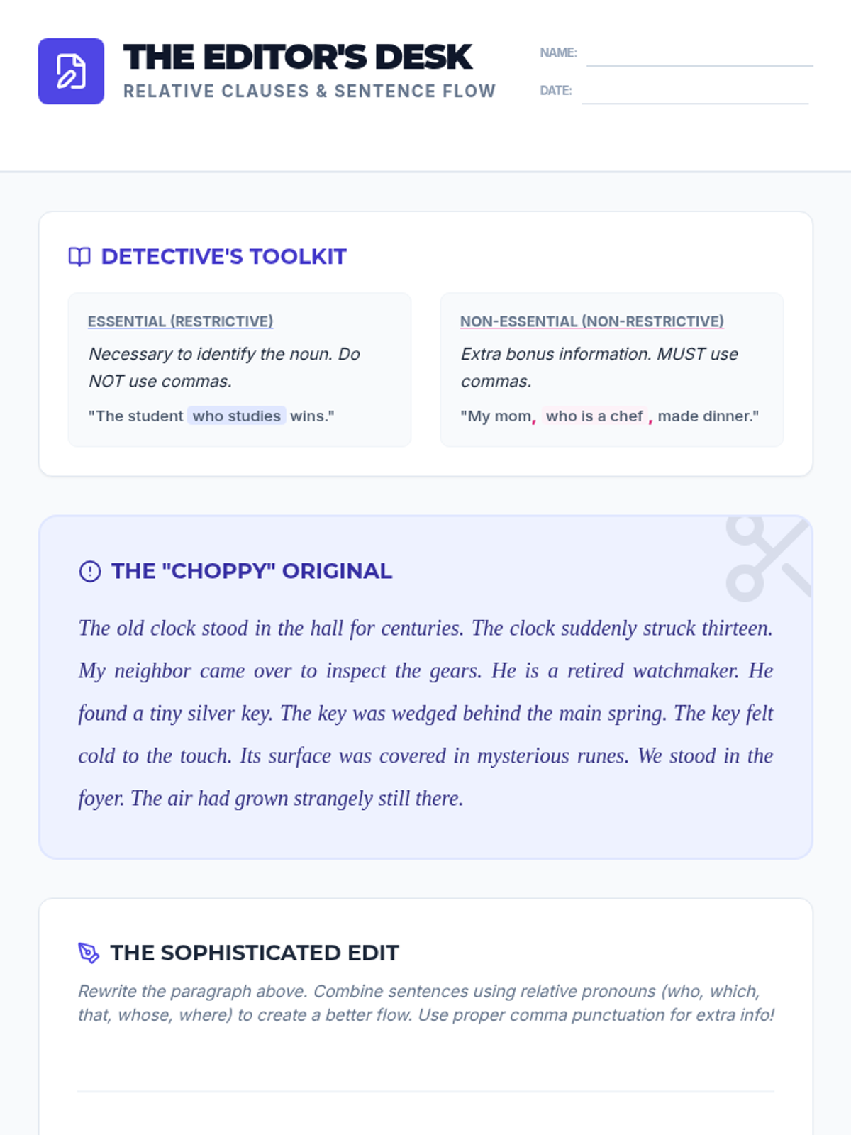 A grammar lesson for 8th graders focusing on identifying and using essential and non-essential relative clauses to improve writing flow and sophistication.