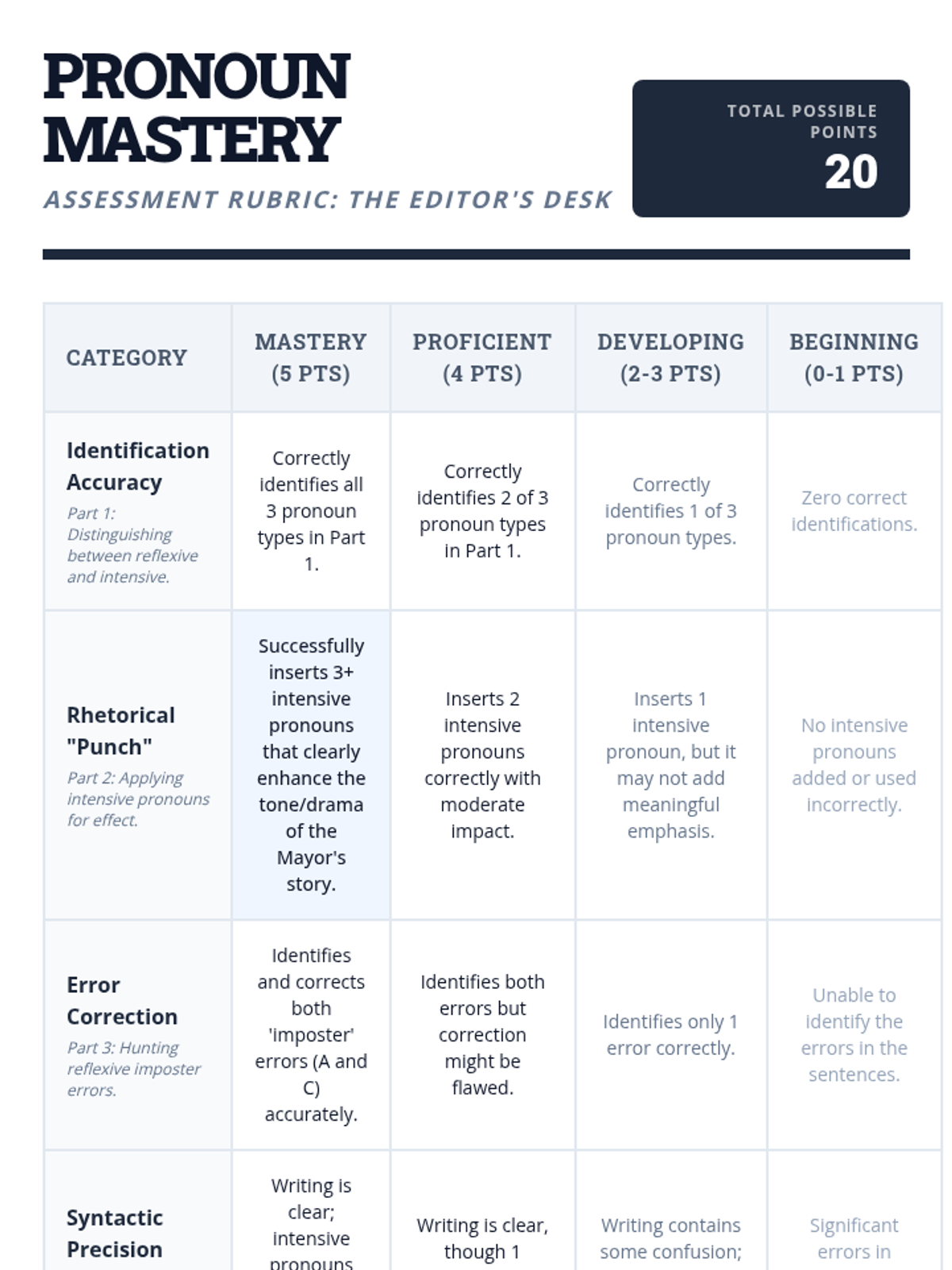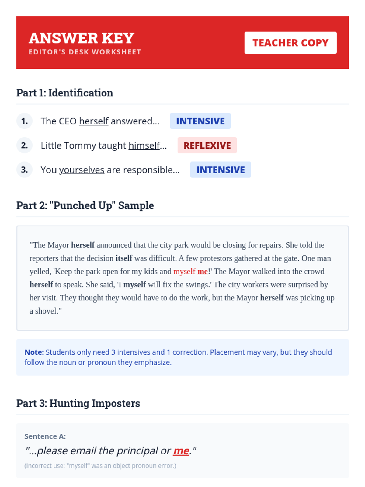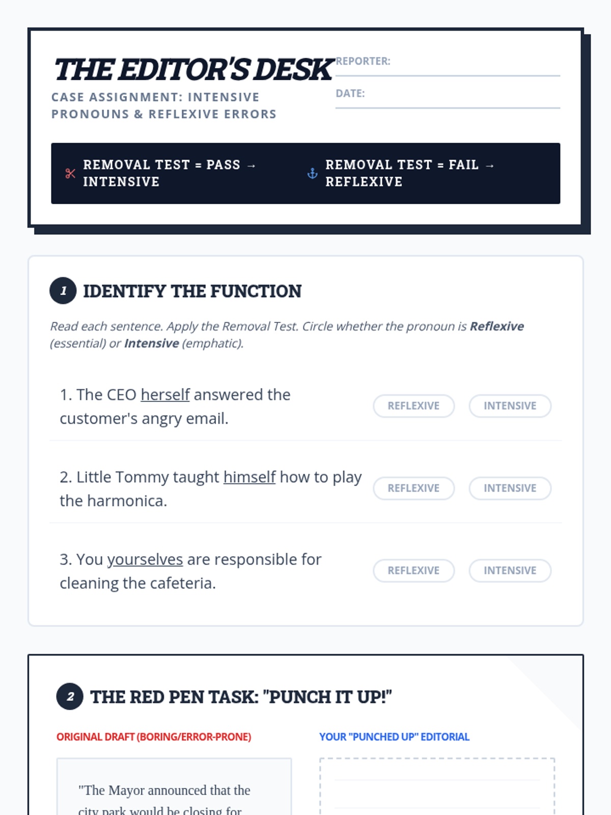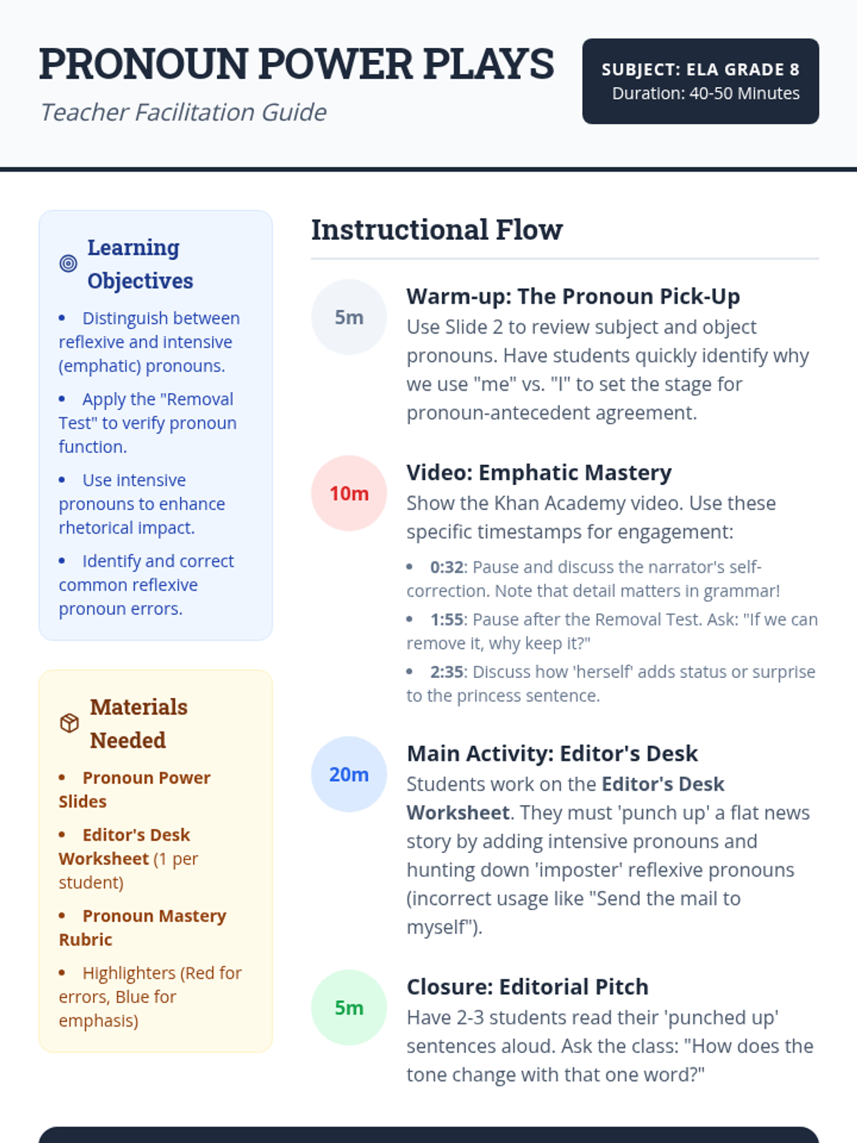 Students will master the distinction between reflexive and intensive pronouns, learning how to use emphatic pronouns to add rhetorical flair and 'punch' to their writing while avoiding common usage errors.