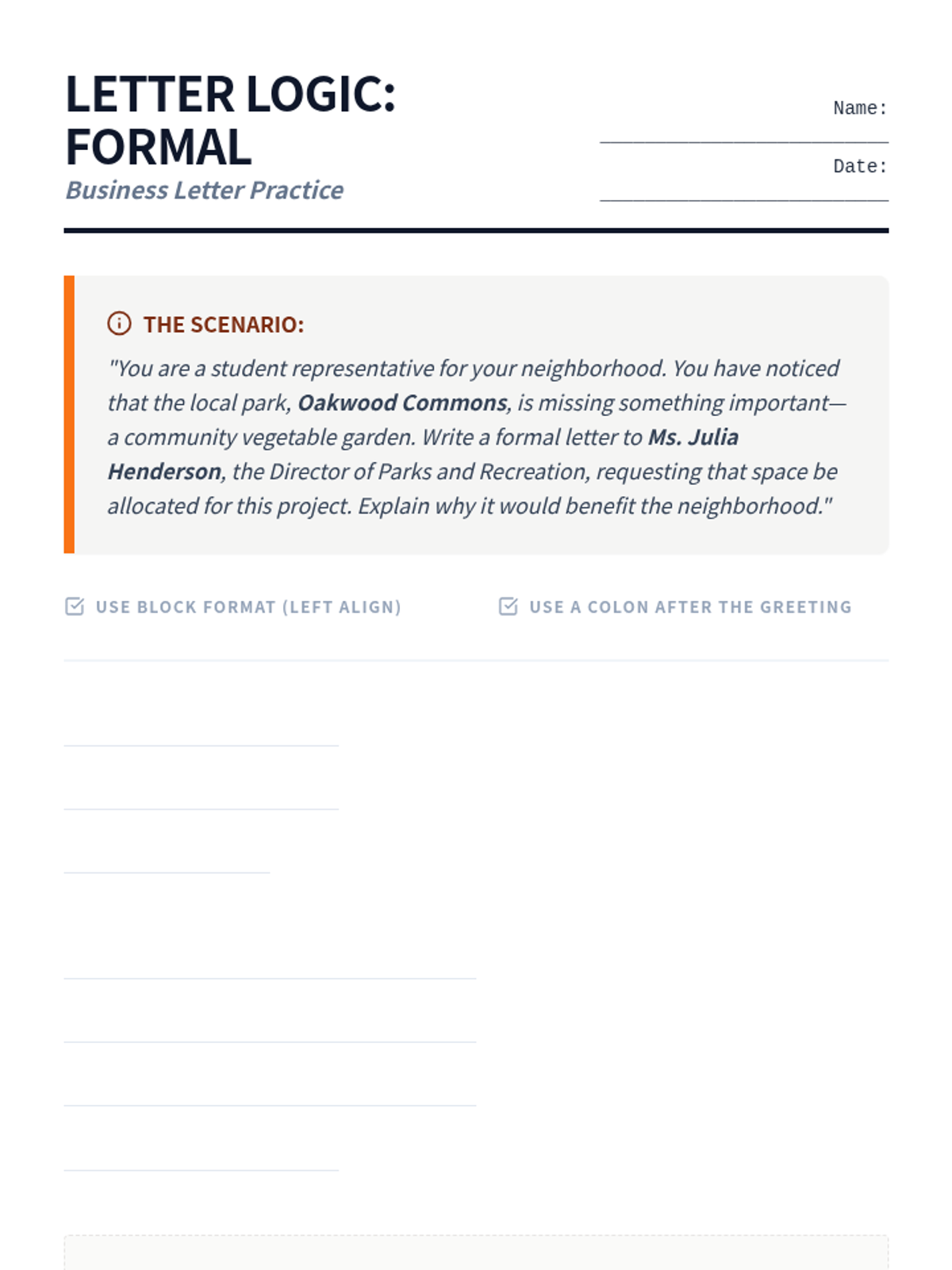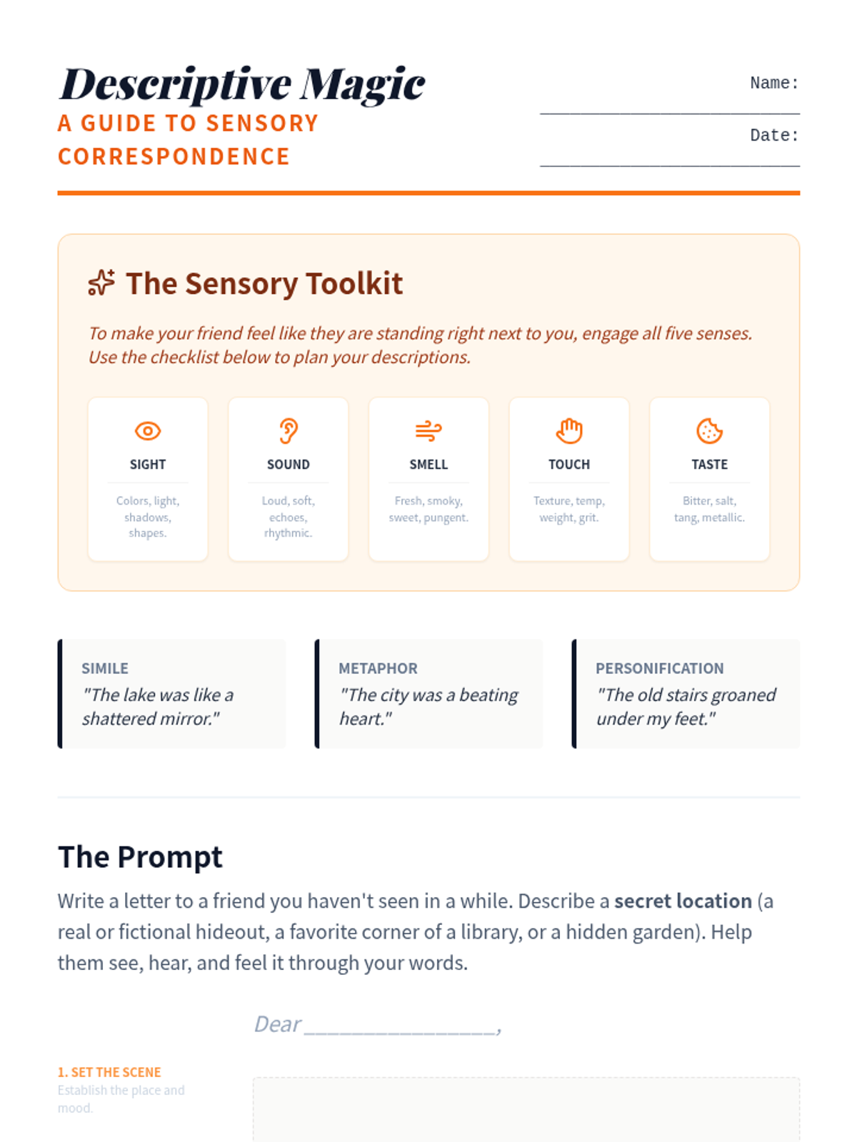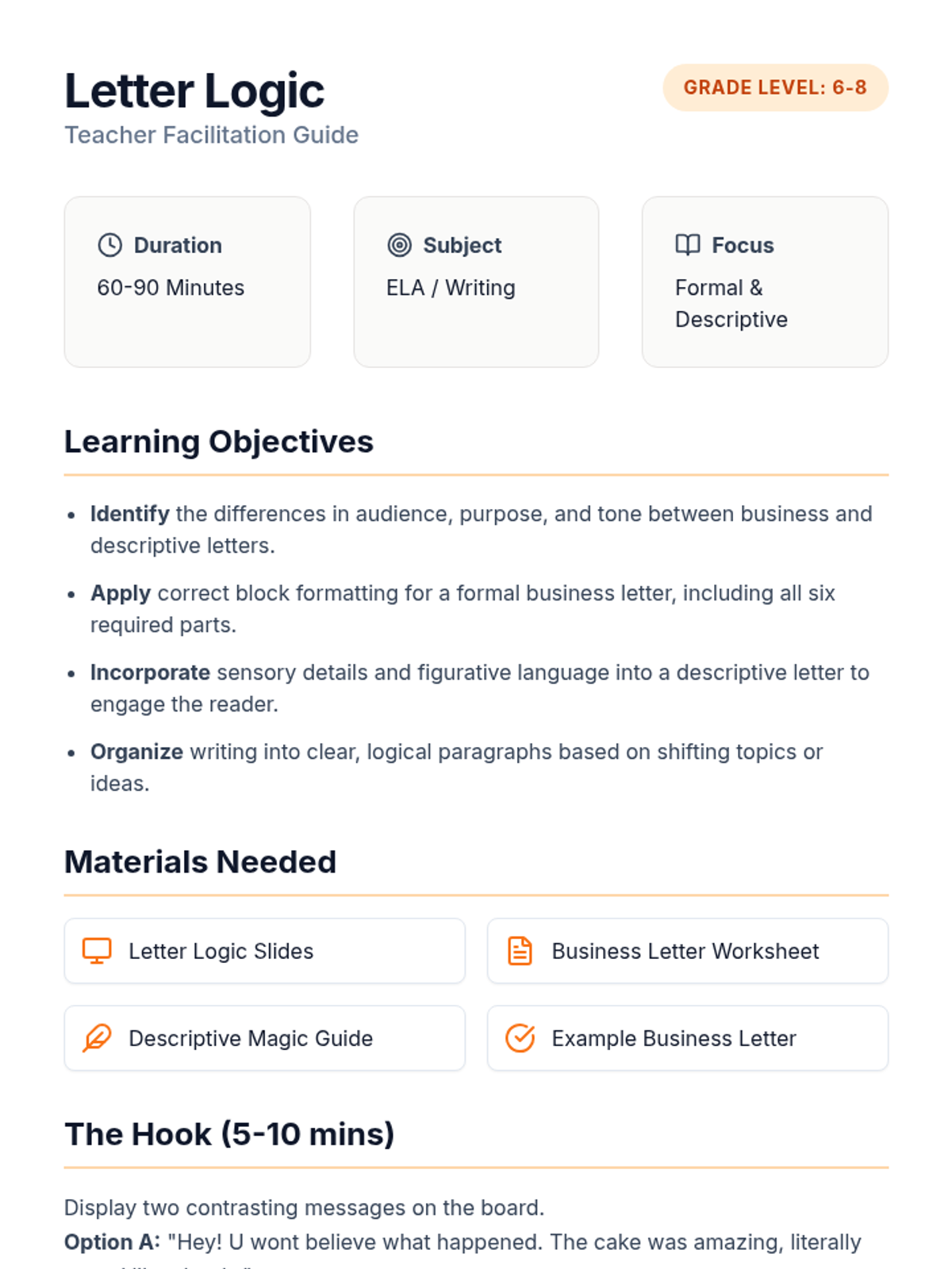 A comprehensive lesson on mastering the art of letter writing, covering the formal structures of business correspondence and the expressive techniques of descriptive personal letters. Students explore audience, purpose, and sensory language through guided practice and real-world examples.