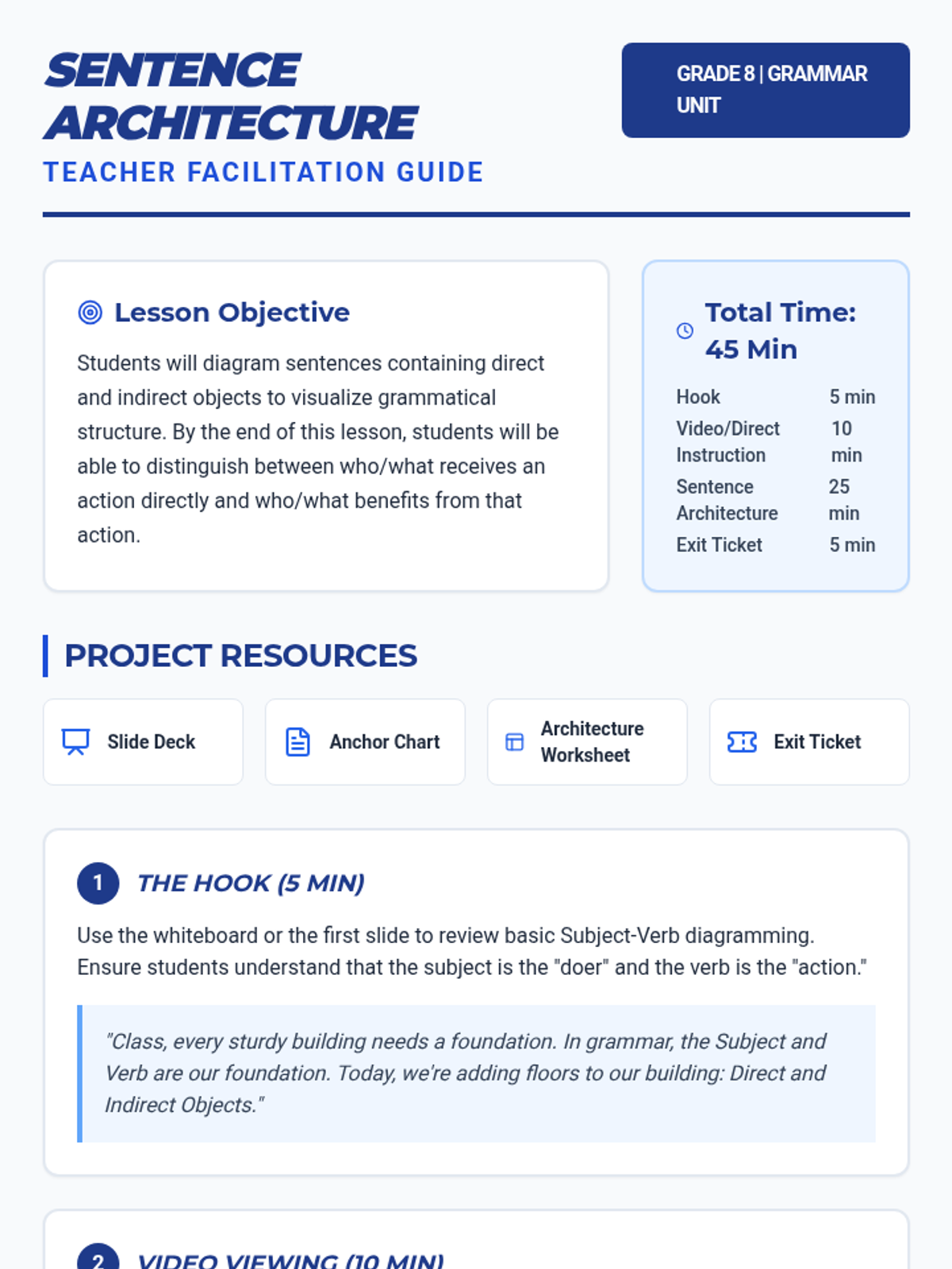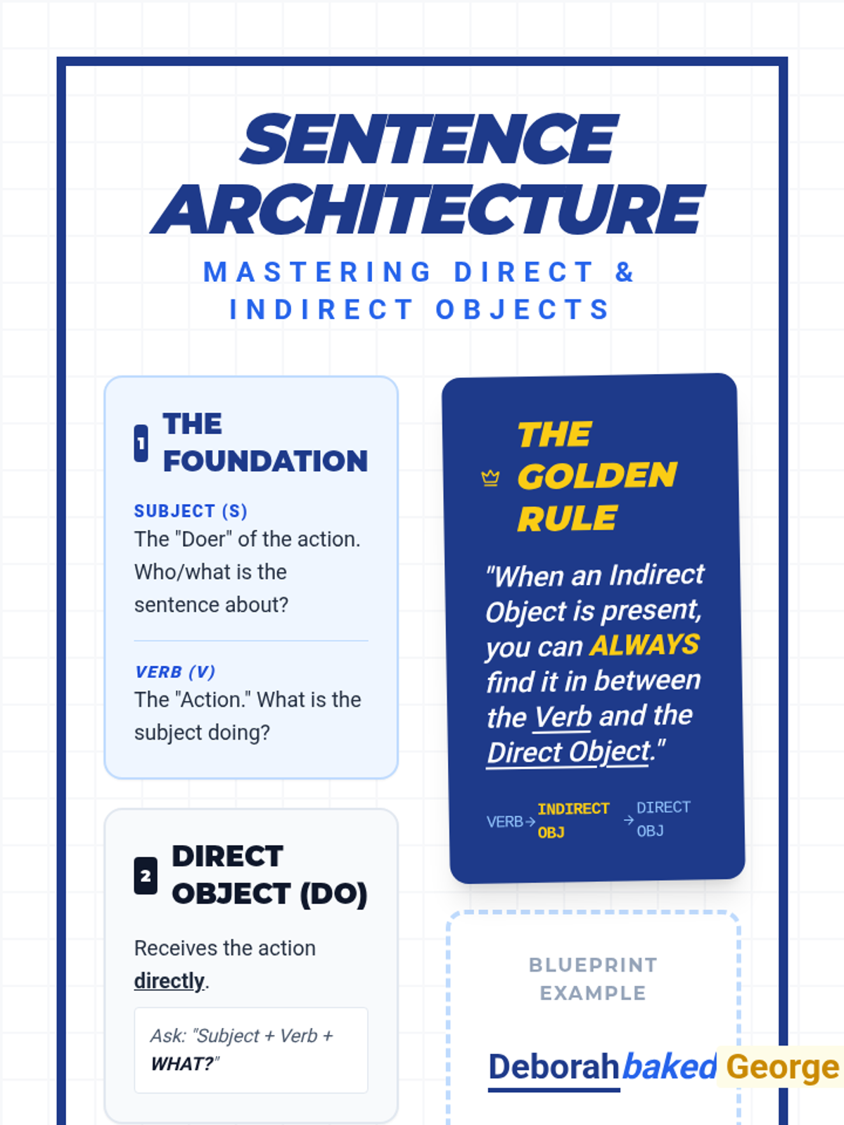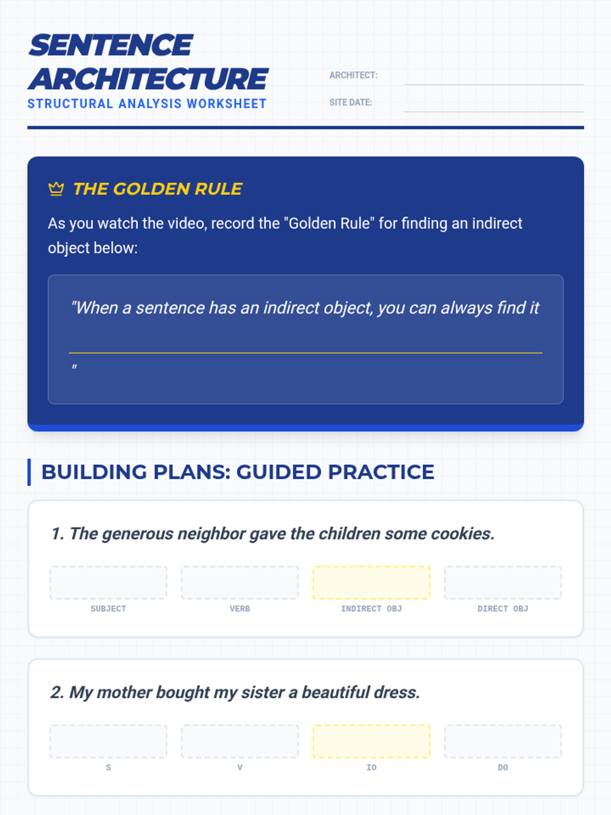 Students will learn to identify and diagram direct and indirect objects using a 'Sentence Architecture' framework, visualizing how objects receive and benefit from actions.