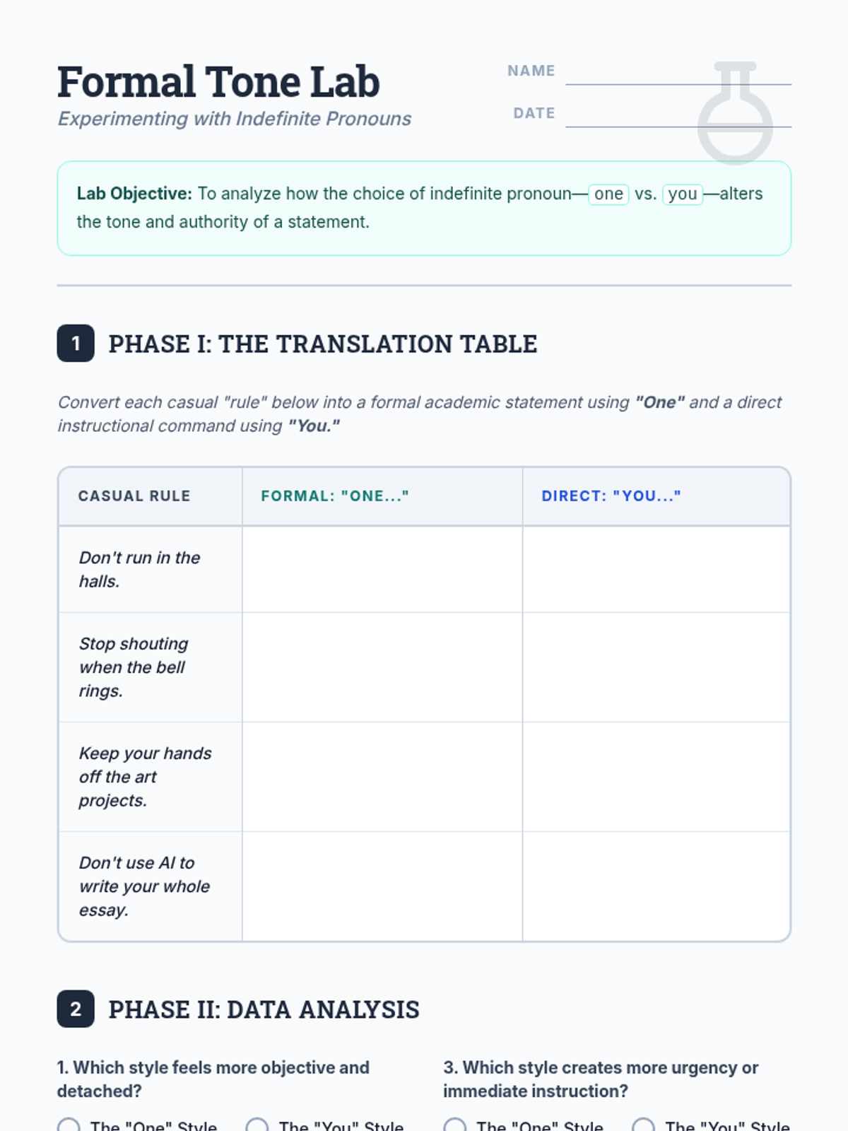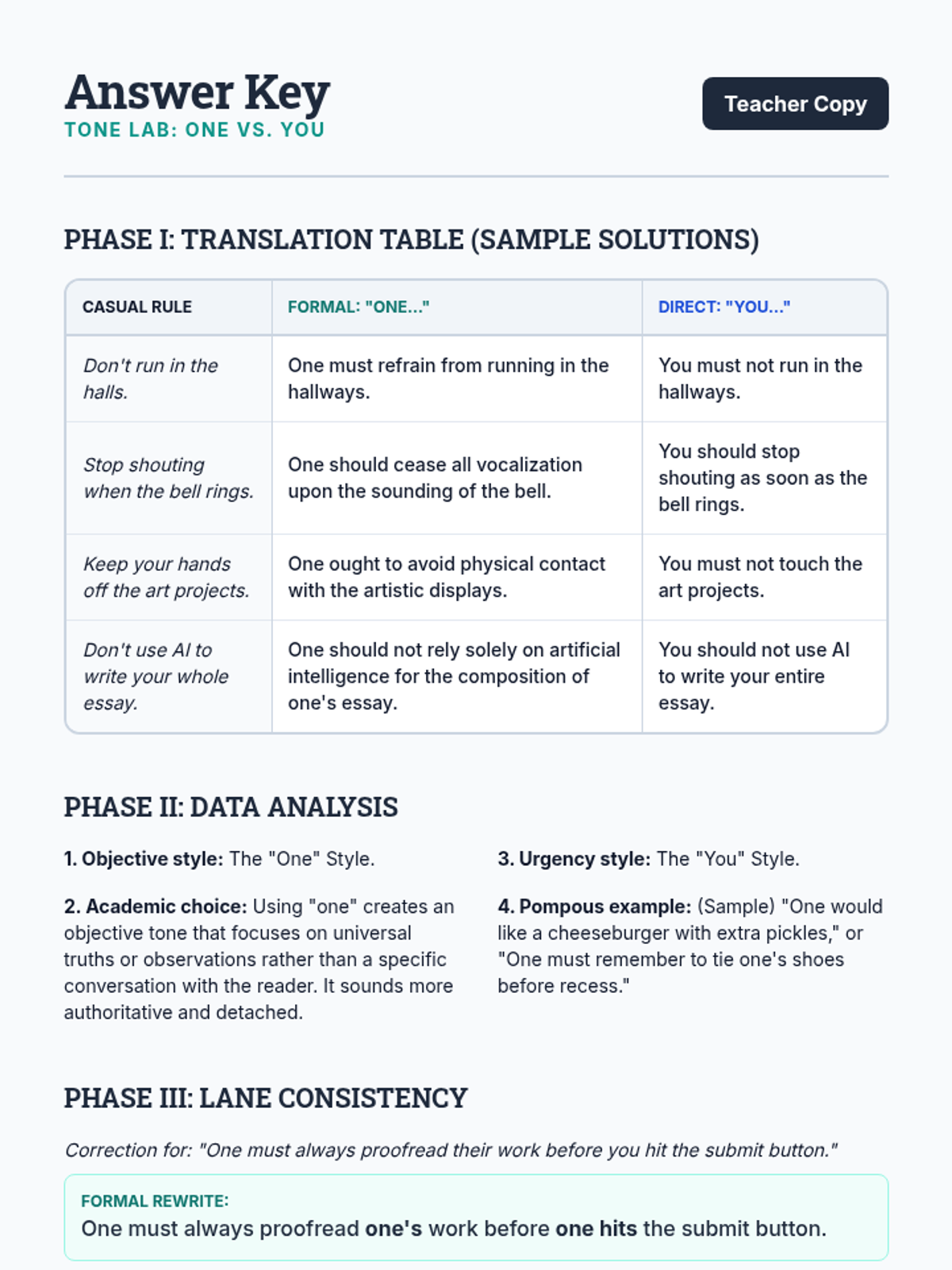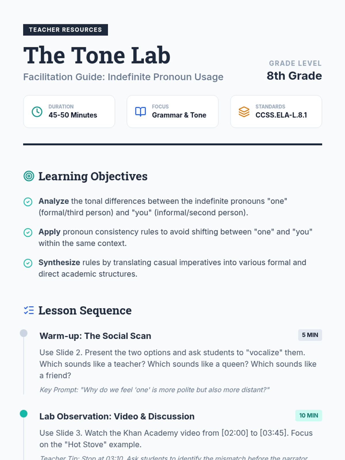 An advanced 8th-grade grammar lesson exploring the tonal differences and consistency requirements of using 'one' versus 'you' as indefinite pronouns. Students practice translating casual rules into formal and direct commands while learning to avoid confusing pronoun shifts.