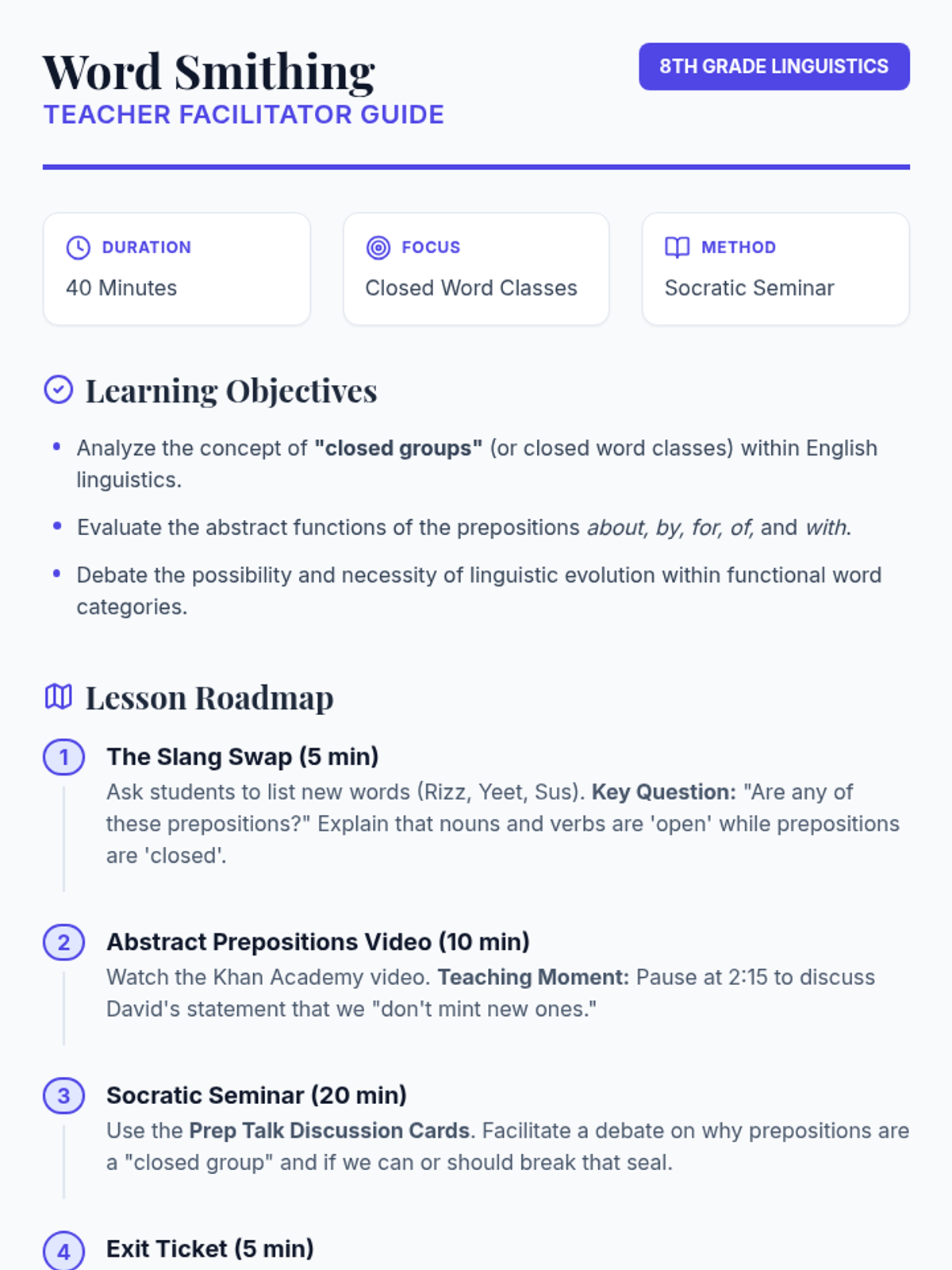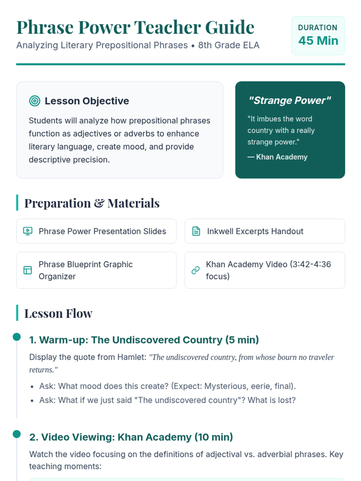 In this lesson, 8th-grade students analyze how prepositional phrases function as stylistic tools in literature, using Shakespeare's 'Hamlet' as a core example to understand how grammar creates 'strange power' and atmosphere.