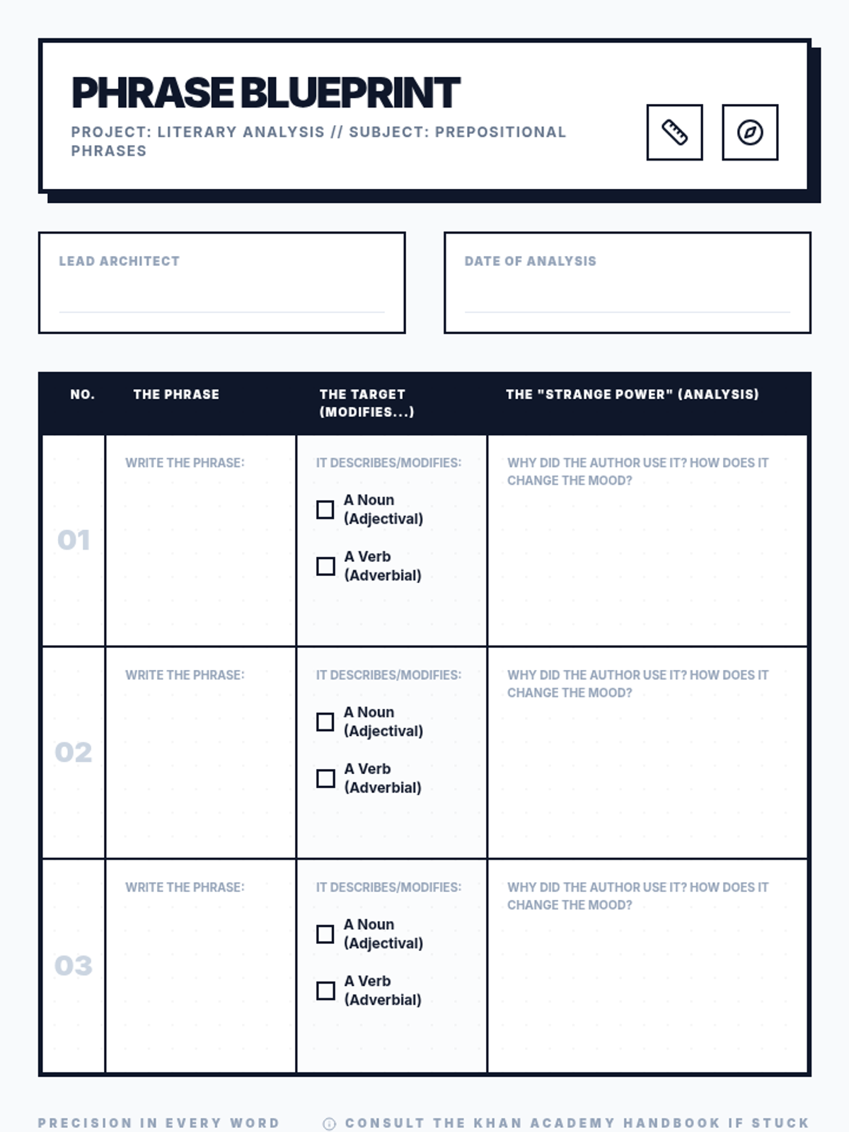 A 50-minute lesson on the academic action verb 'Analyze.' Students learn to break complex topics into smaller parts to understand how they work together using the 'Architect's Blueprint' method.