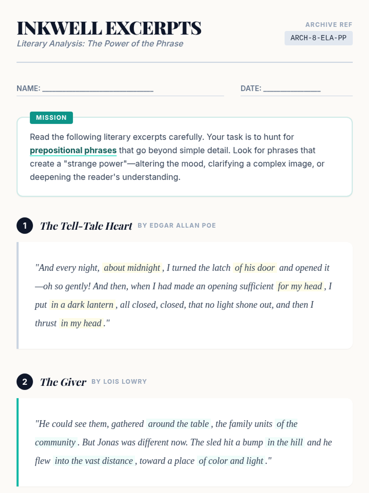 A lesson for 8th-grade students focused on identifying prepositional phrases in literature and analyzing how they create mood, clarity, and 'strange power' in writing.