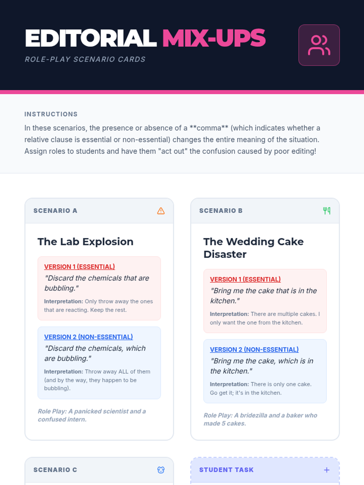 A high-energy editing and revising game where students master comma splices, pronoun-antecedent agreement, and sentence structure through verbal challenges.