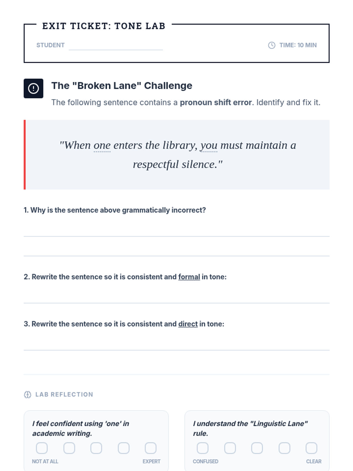 A high-energy lesson focused on maintaining consistent grammatical person (pronoun agreement). Students learn the 'Stay in Your Lane' concept through a video and a collaborative board-race game.