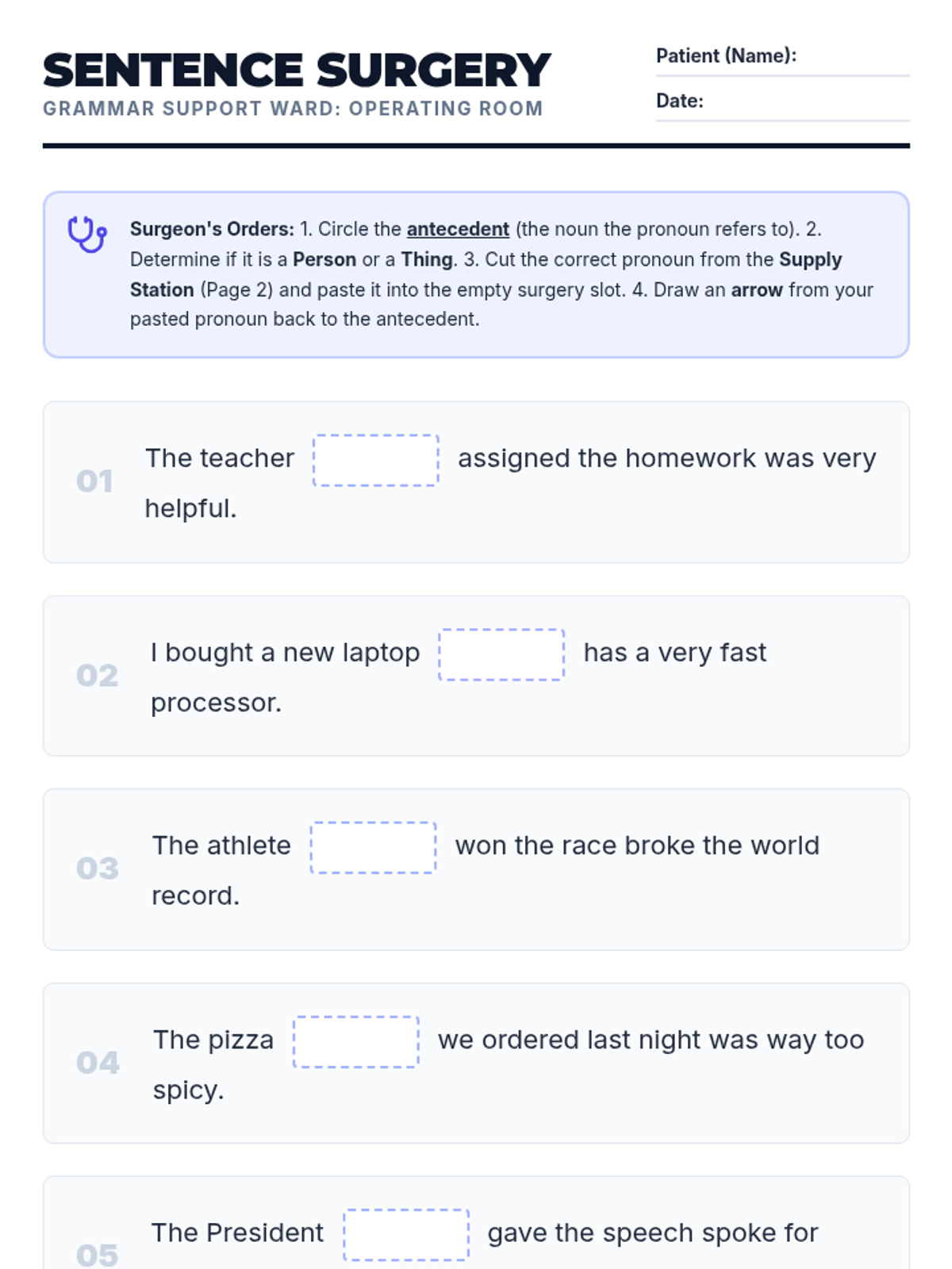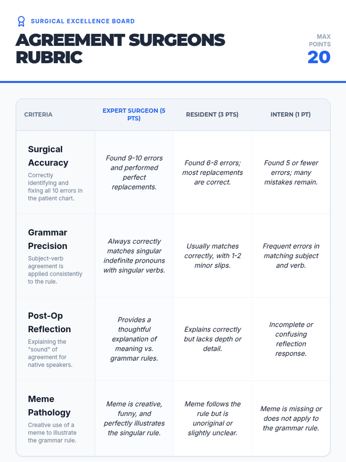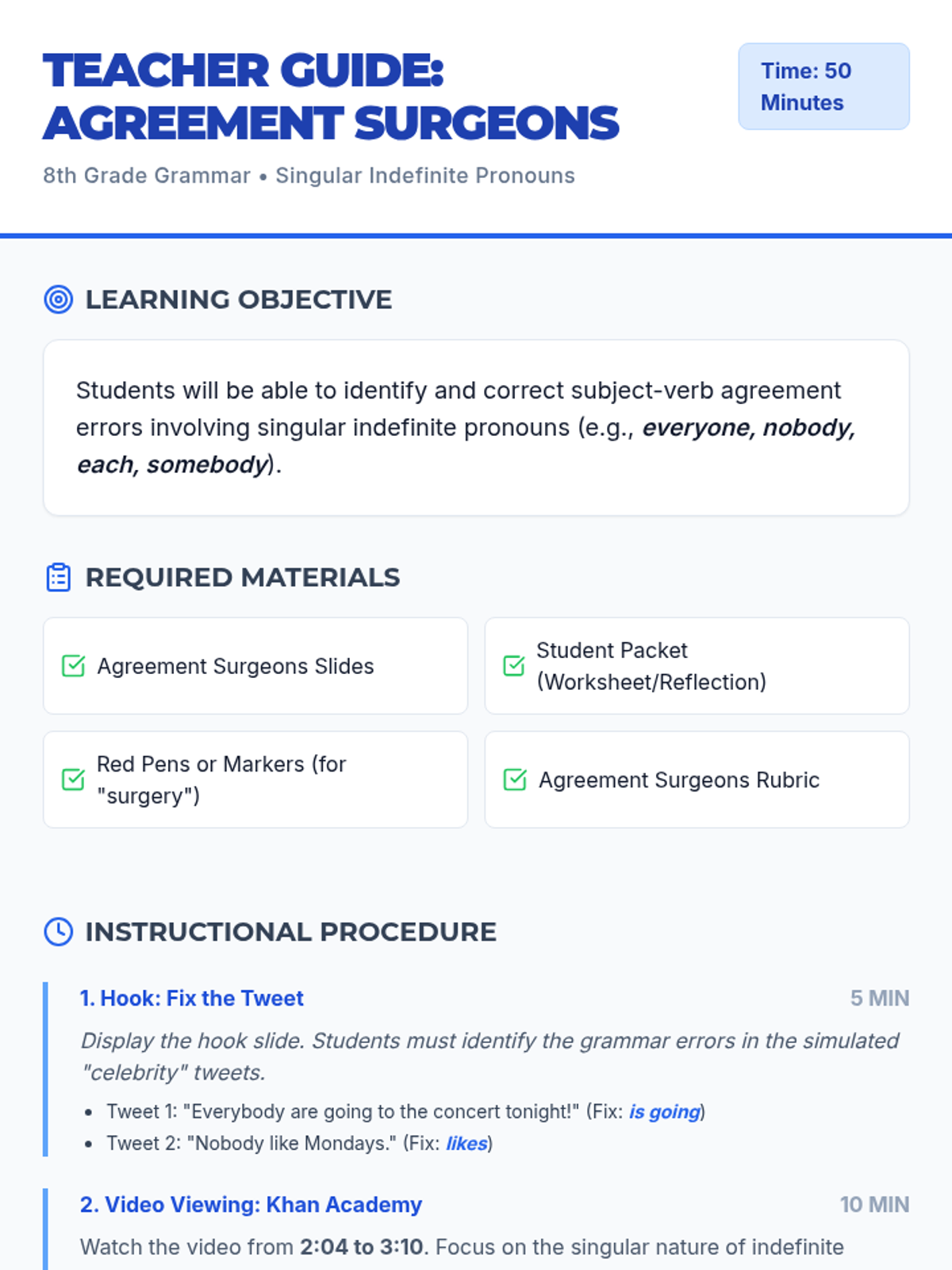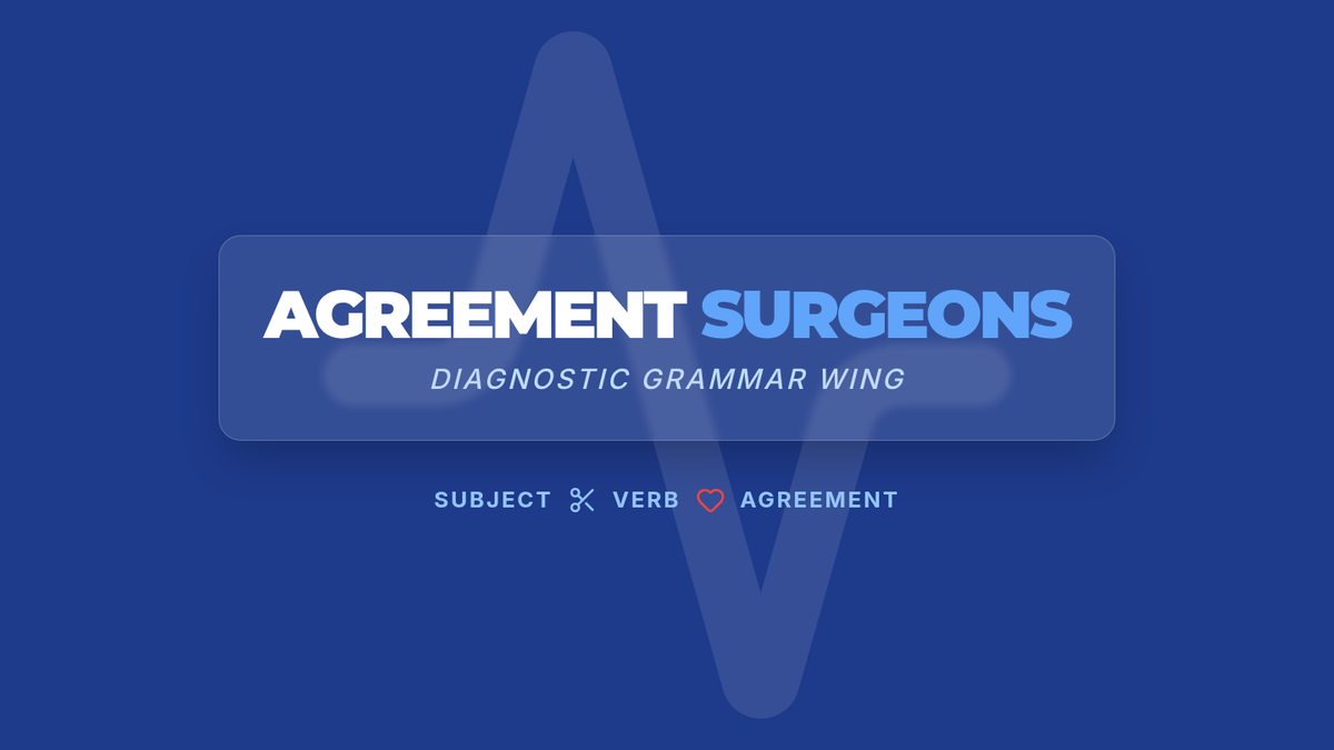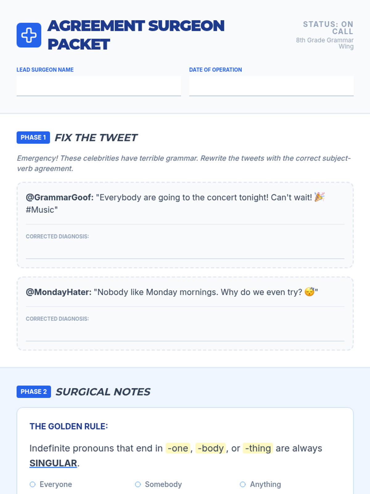 A medical-themed grammar lesson where students become 'Agreement Surgeons' to diagnose and fix subject-verb agreement errors involving singular indefinite pronouns like 'everyone' and 'nobody'.