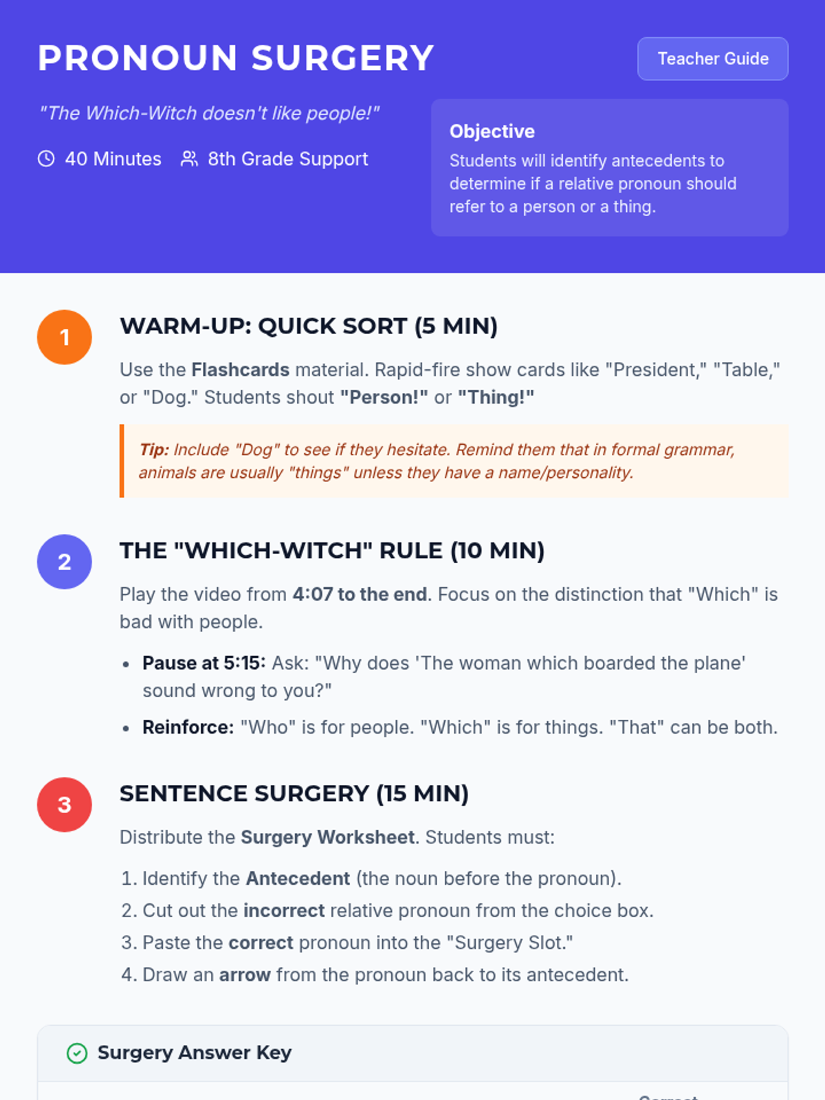 A targeted grammar lesson for 8th graders focusing on the distinction between 'who', 'that', and 'which' based on whether the antecedent is a person or a thing, featuring a 'Sentence Surgery' hands-on activity.