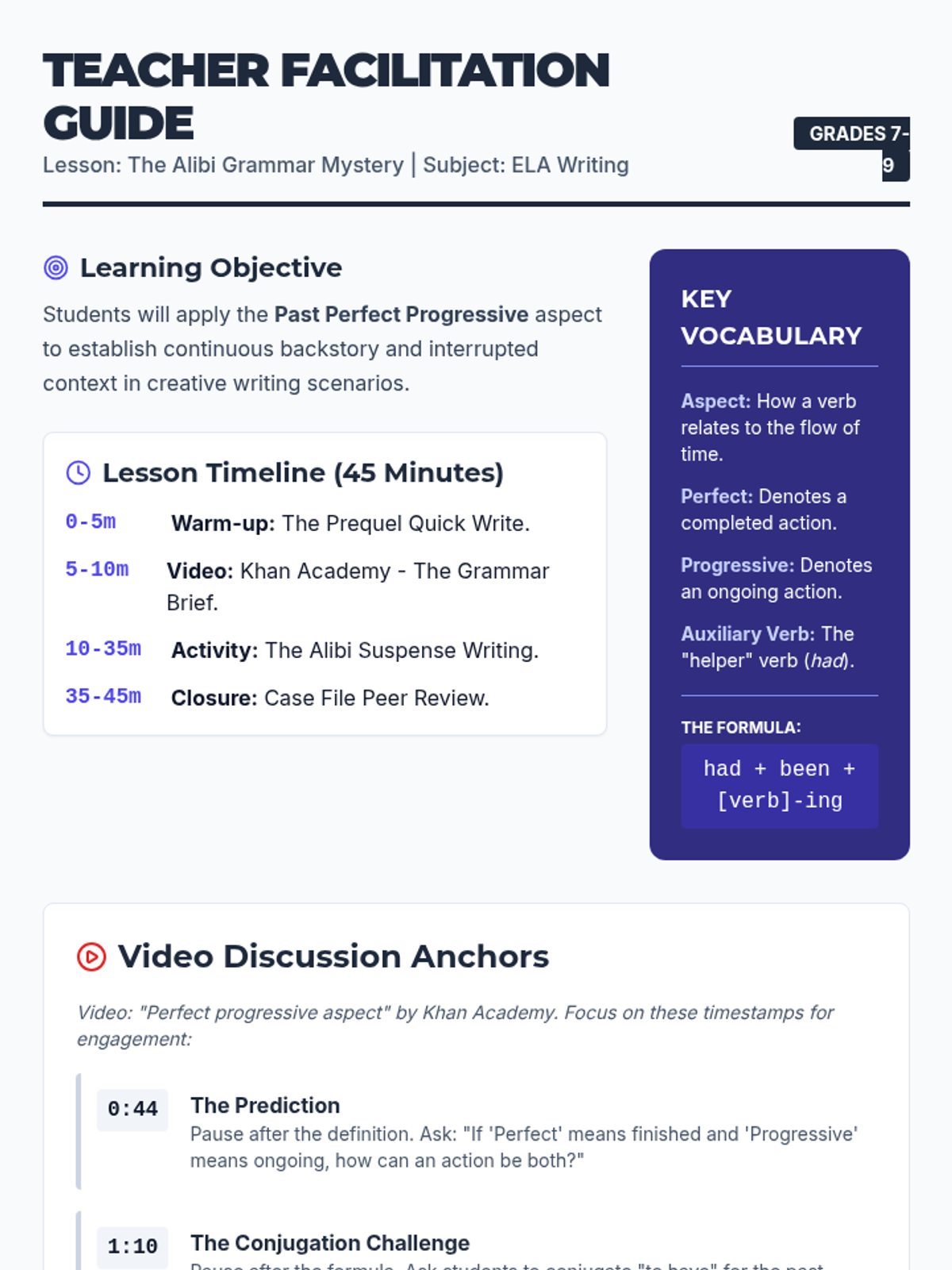 A comprehensive 30-45 minute lesson on the past perfect tense, featuring explicit instructions, a time-travel themed worksheet, and a detailed teacher guide. This lesson helps students understand how to sequence two past events using the 'past before the past' structure.