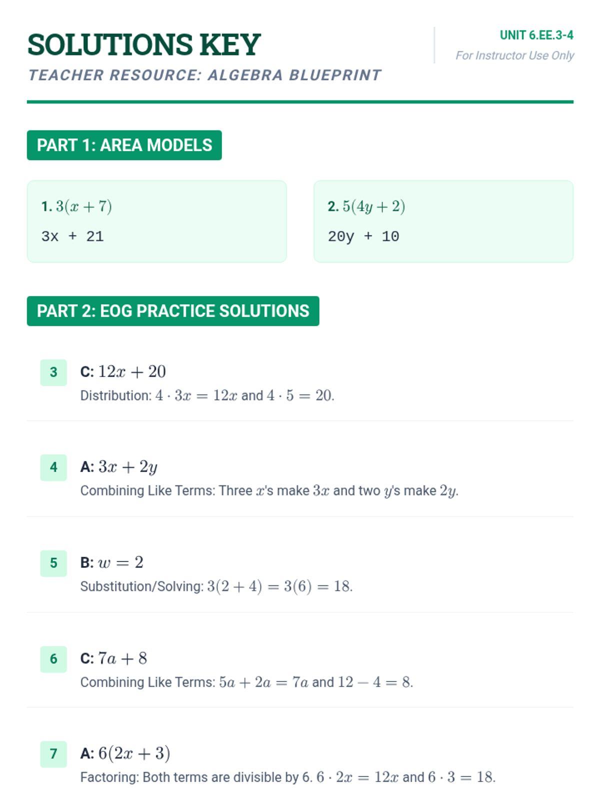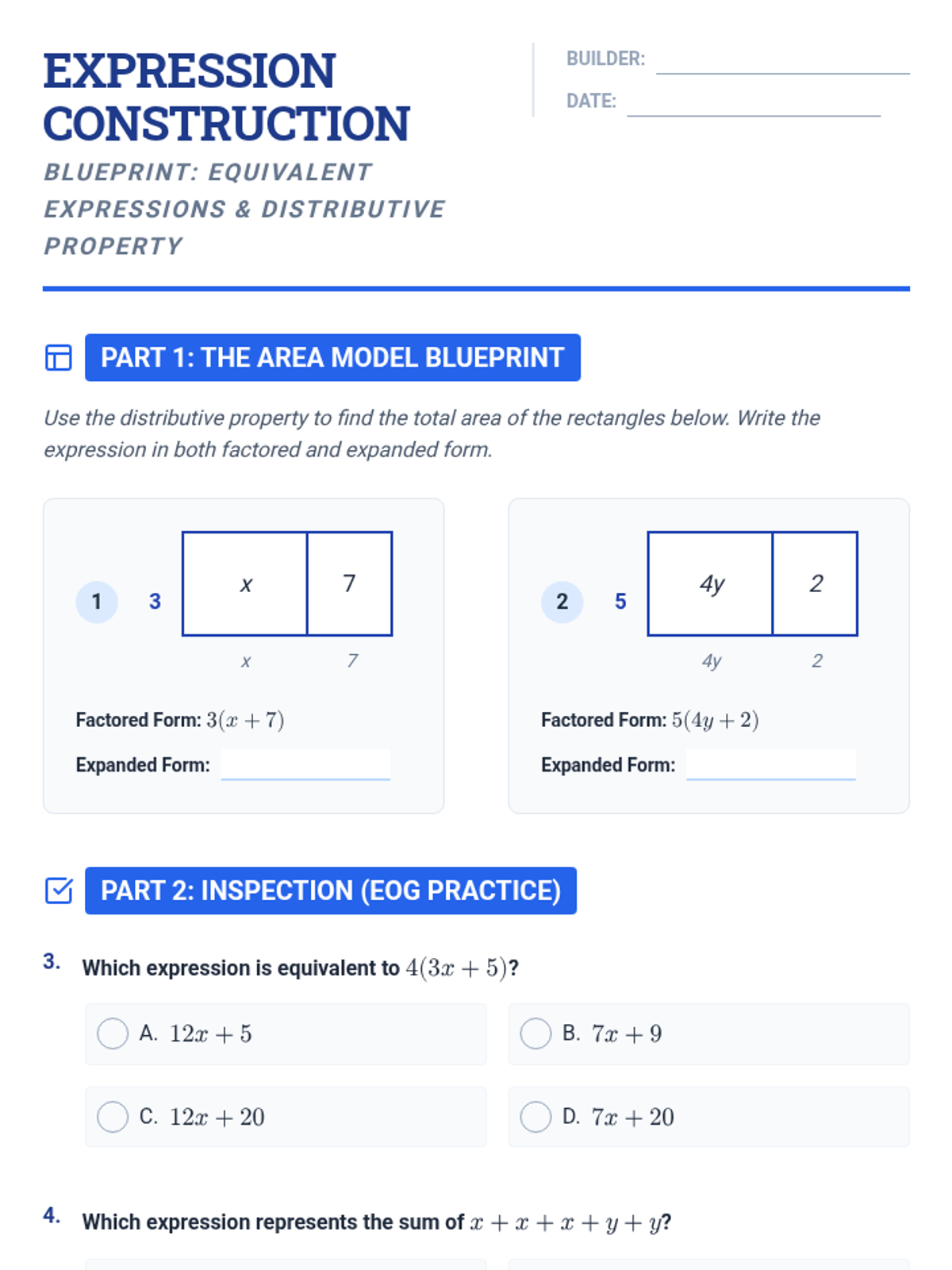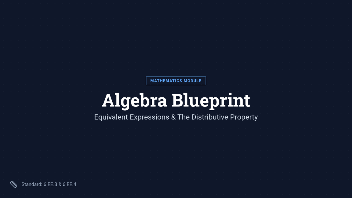 A comprehensive lesson on equivalent expressions and the distributive property, using area models and algebraic manipulation to build foundation for 6th-grade math standards.