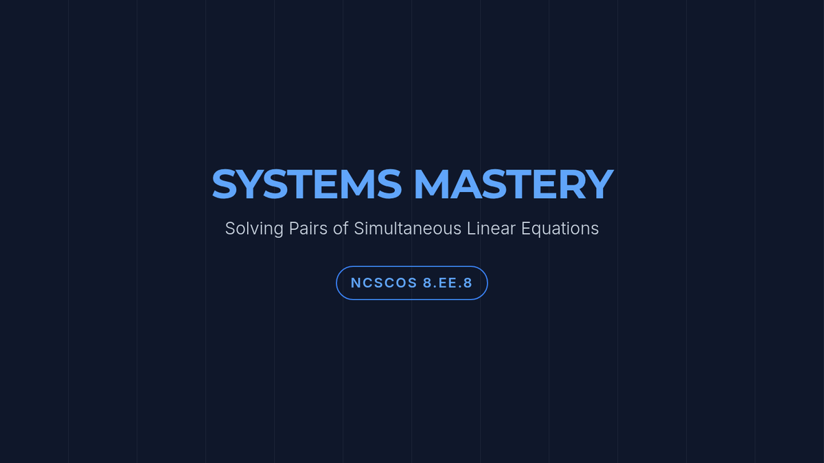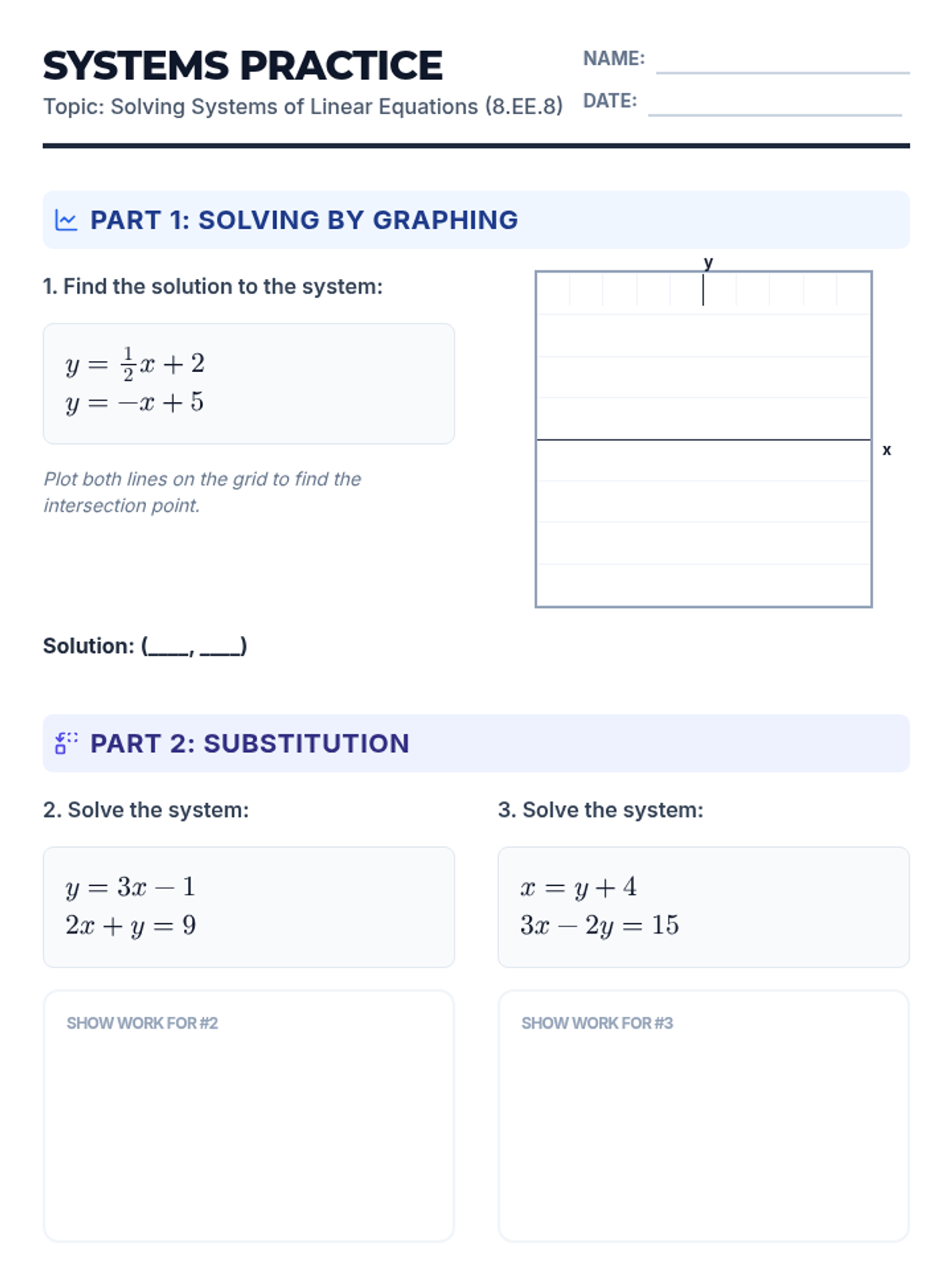 Linear Equations and SystemsSolving single-variable linear equations and systems through graphing, substitution, and elimination. Targets algebraic manipulation and real-world modeling of simultaneous relationships.