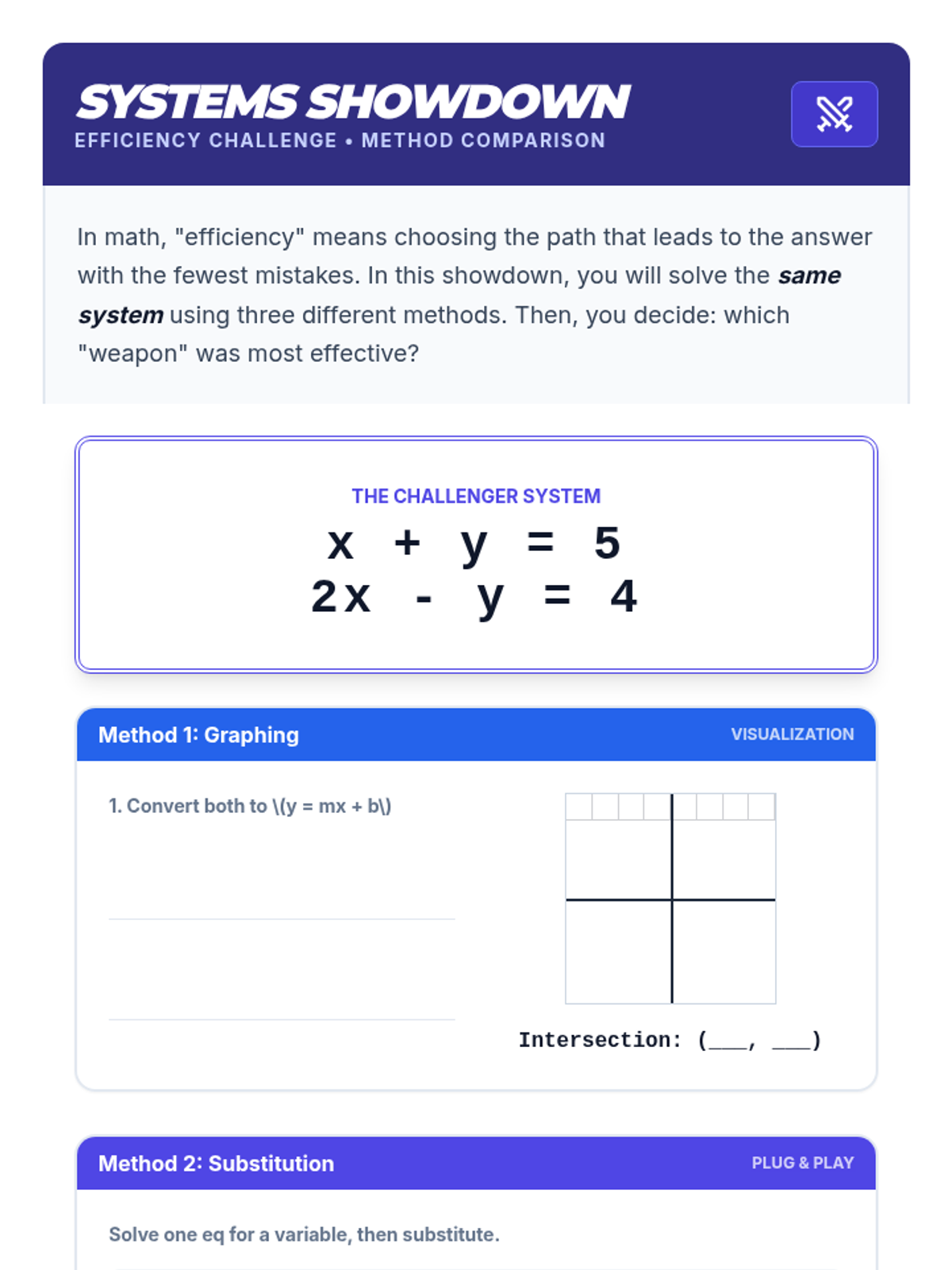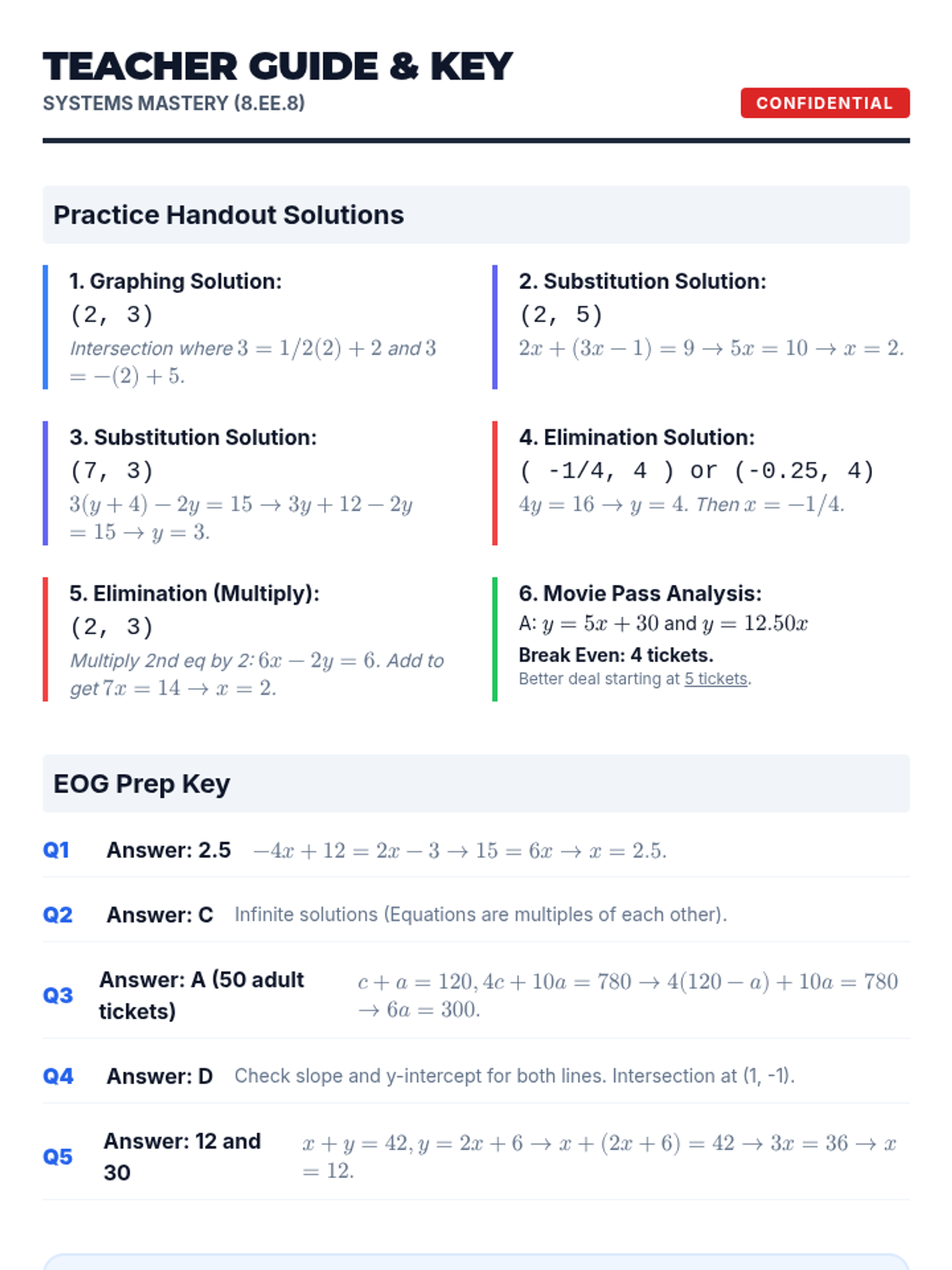 A comprehensive Grade 8 lesson on solving systems of linear equations using graphing, substitution, and elimination, featuring real-world applications and method selection strategies for the NC EOG.
