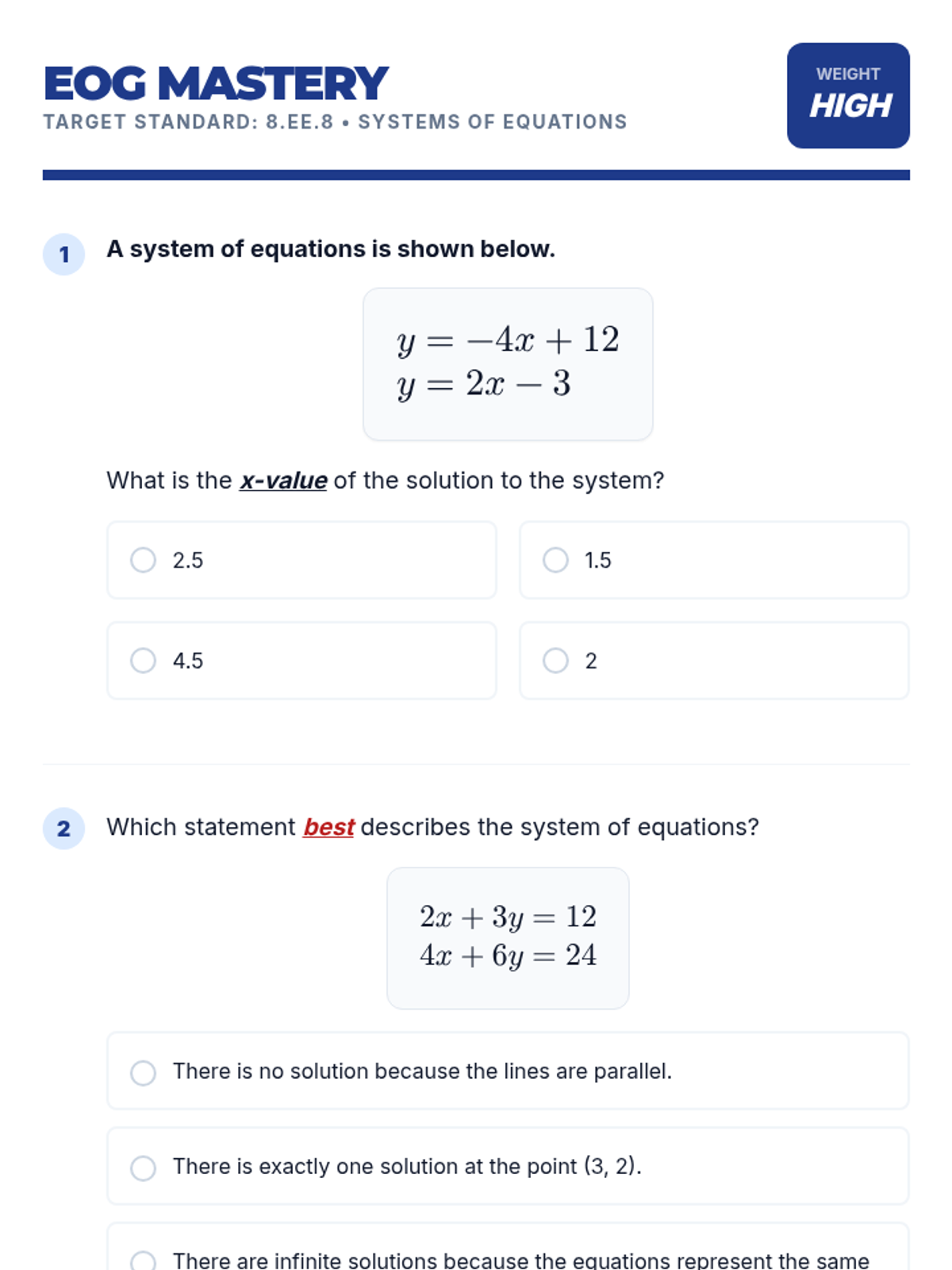 A scaffolded practice set for 8th-grade linear equations and systems, focusing on translation, solving, and verification of EOG-aligned problems.