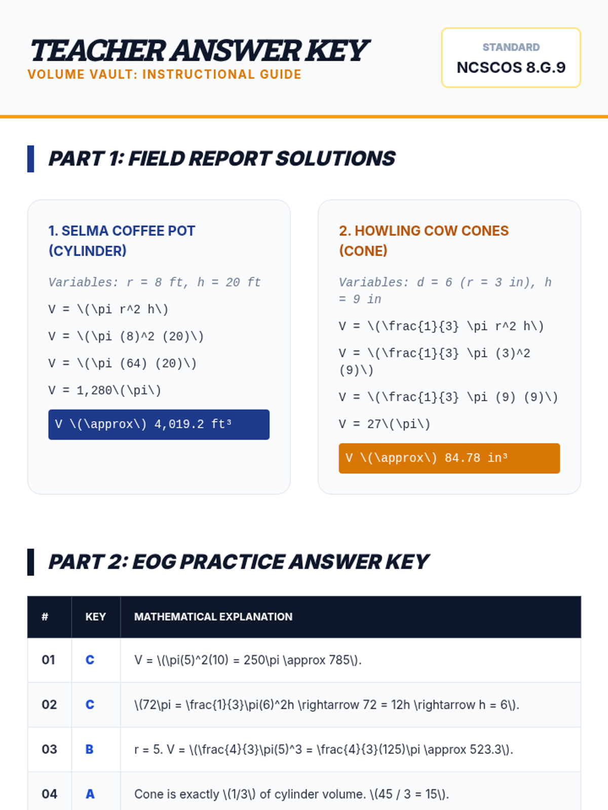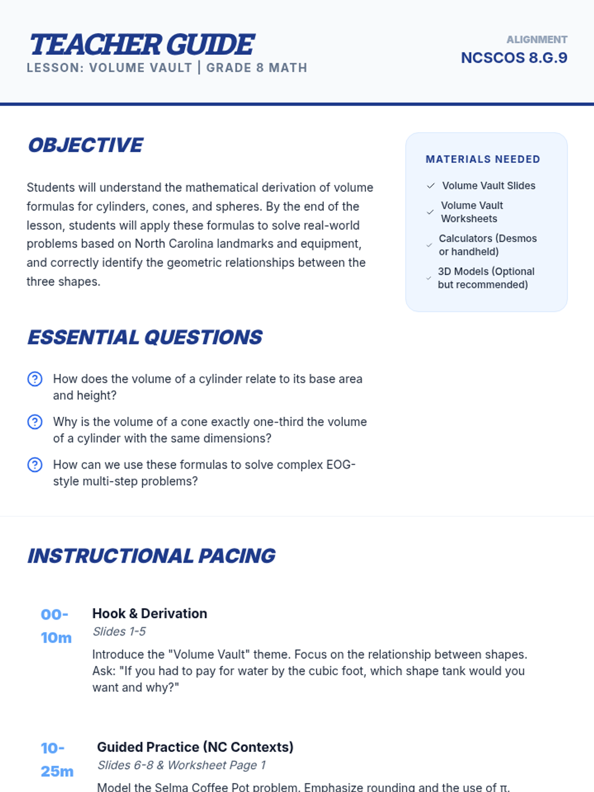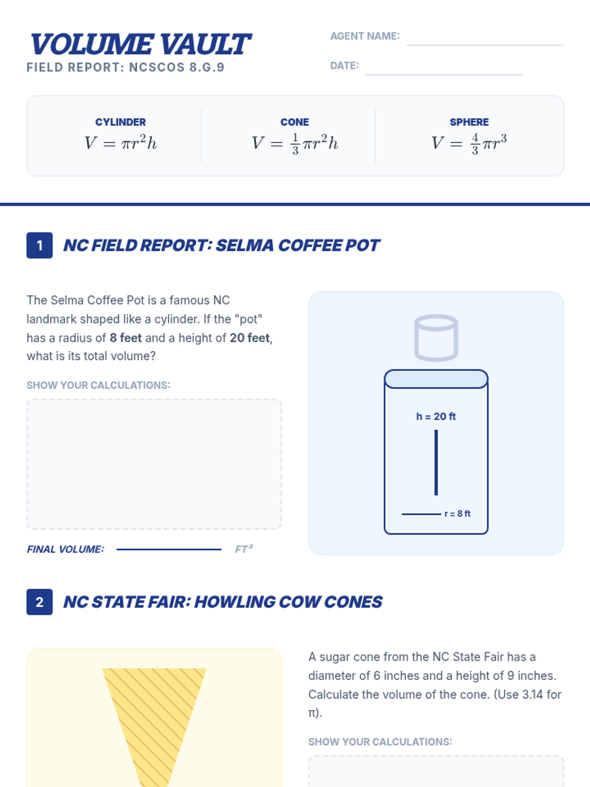 Students derive and apply volume formulas for cylinders, cones, and spheres through real-world North Carolina contexts like water towers and sports equipment. This lesson emphasizes the geometric relationships between these three-dimensional shapes.