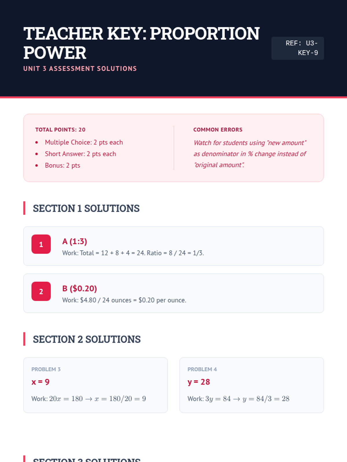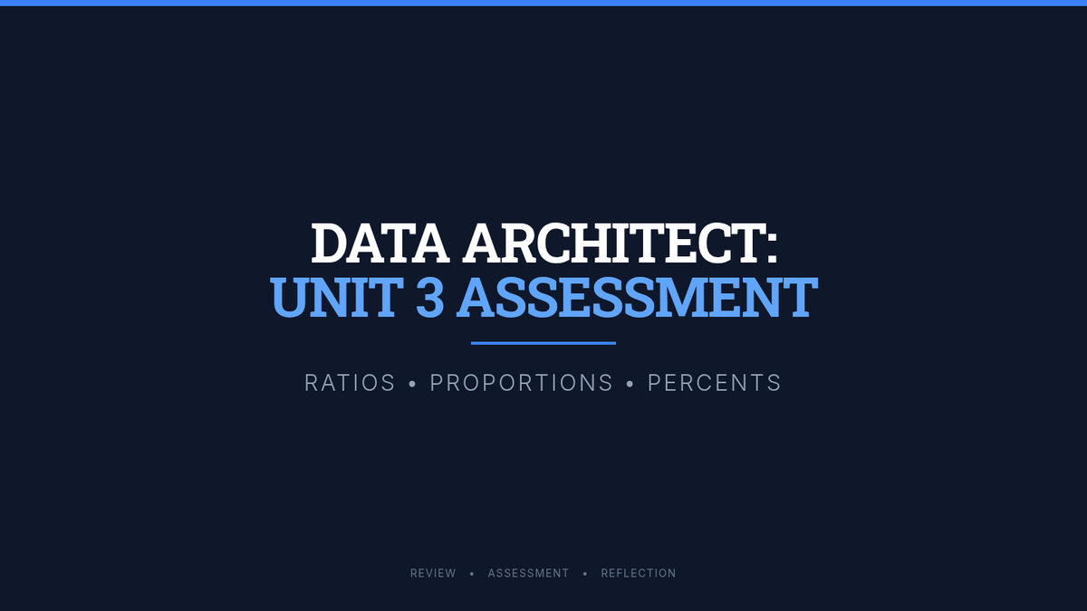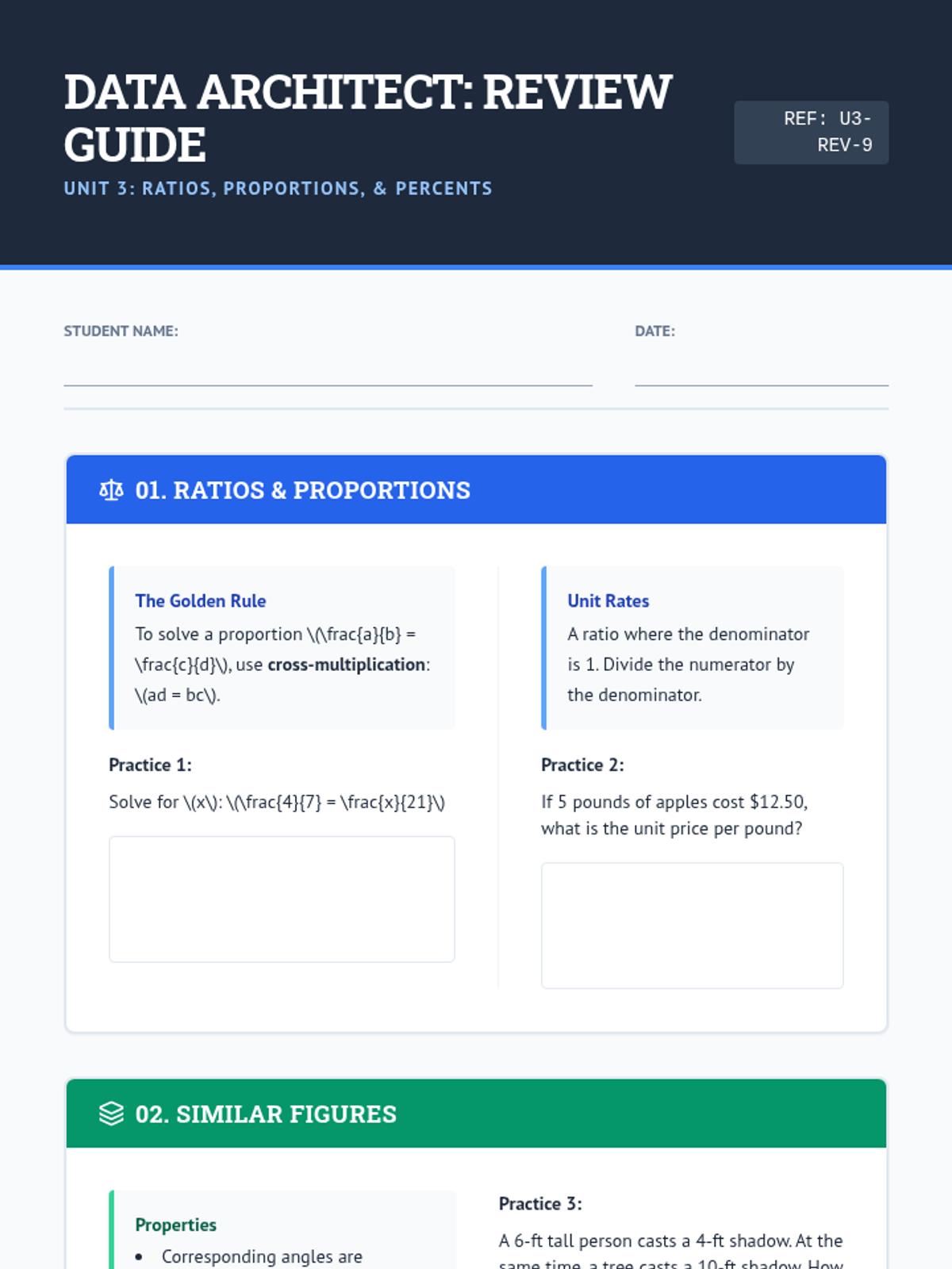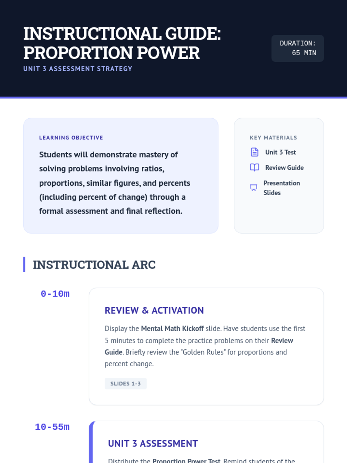 A comprehensive assessment lesson where students review key concepts of ratios, proportions, and percents before completing a formal unit test.