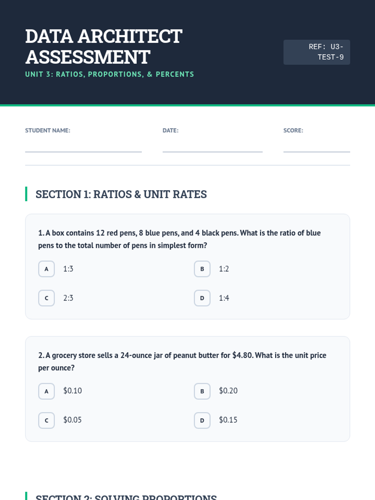 A cumulative milestone assessment designed for students at Grade 6 proficiency (RIT 221-230). This assessment checks foundational understanding of ratios, expressions, and geometry needed for 8th-grade success.