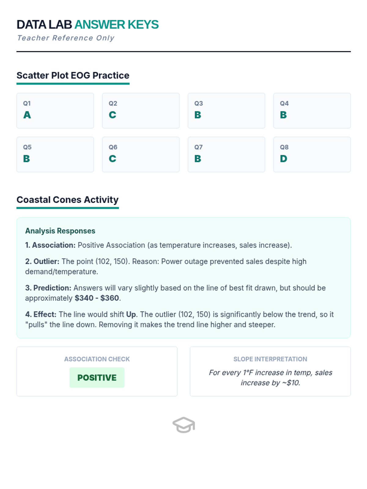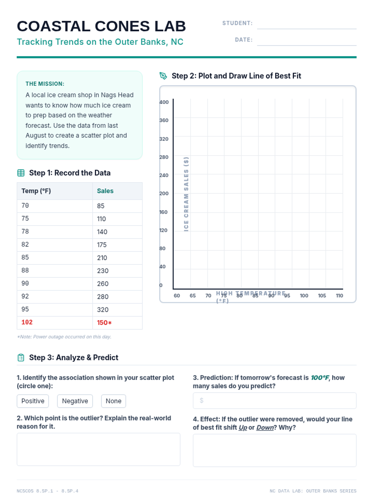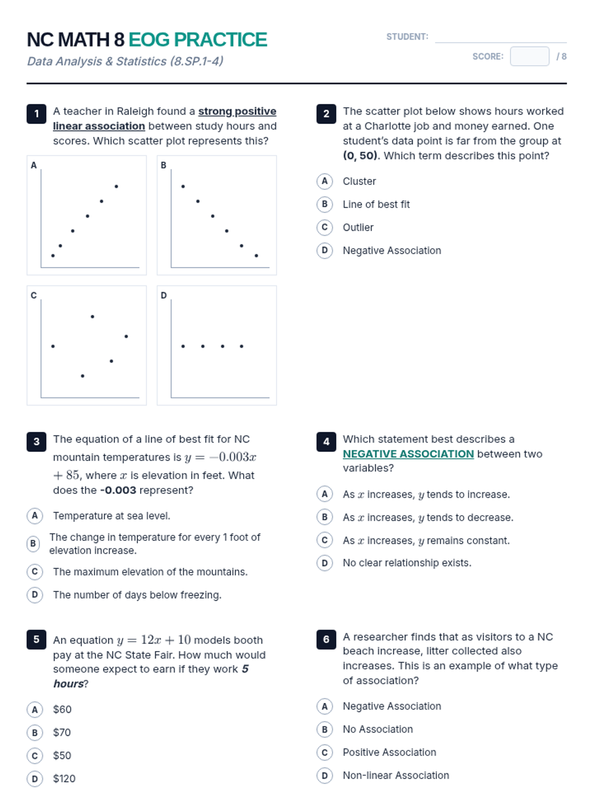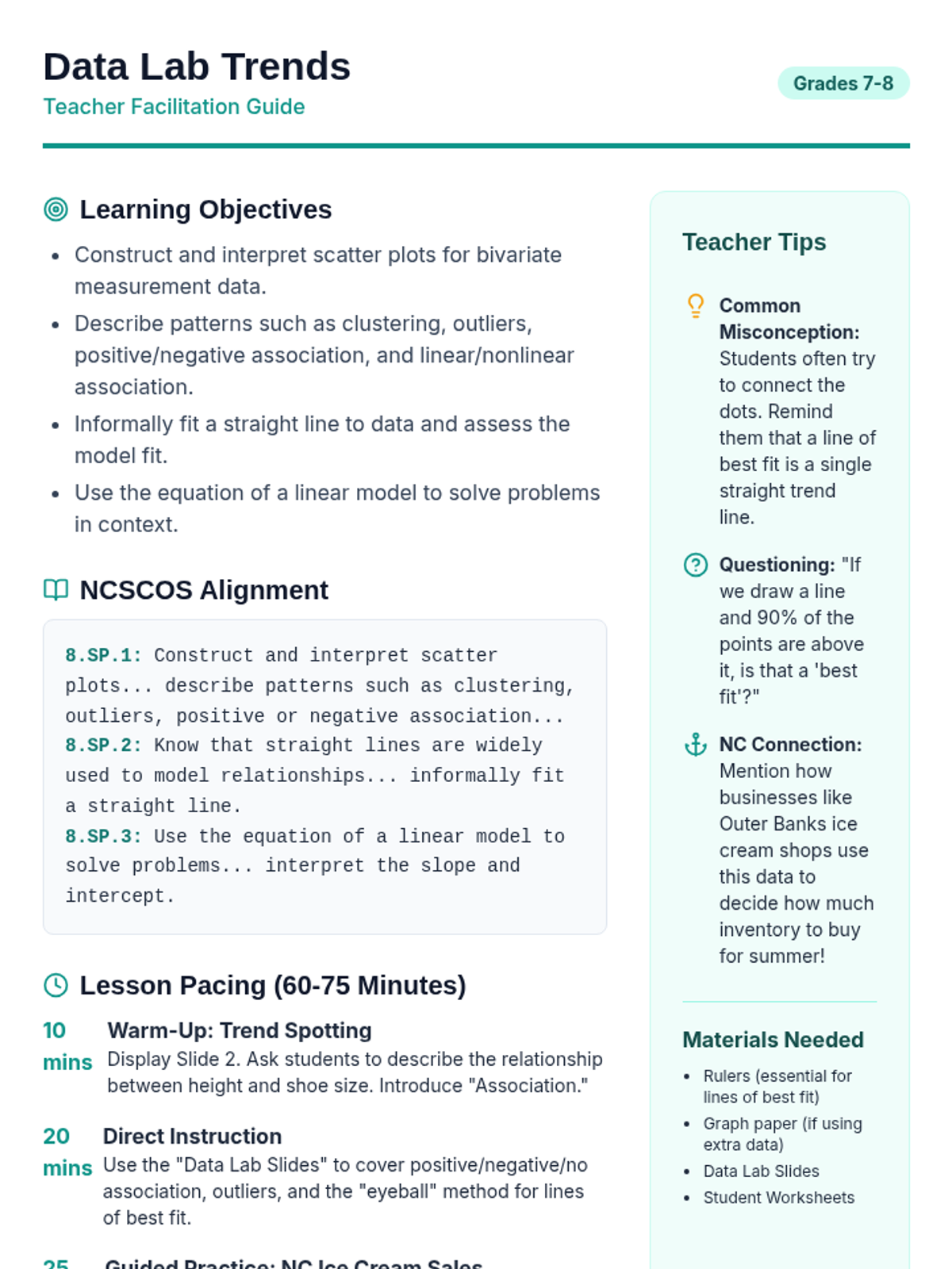 A comprehensive lesson on scatter plots and lines of best fit using North Carolina-specific data. Students will learn to identify associations, construct plots, and make predictions based on linear models.