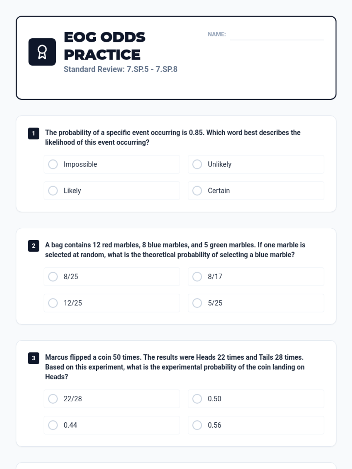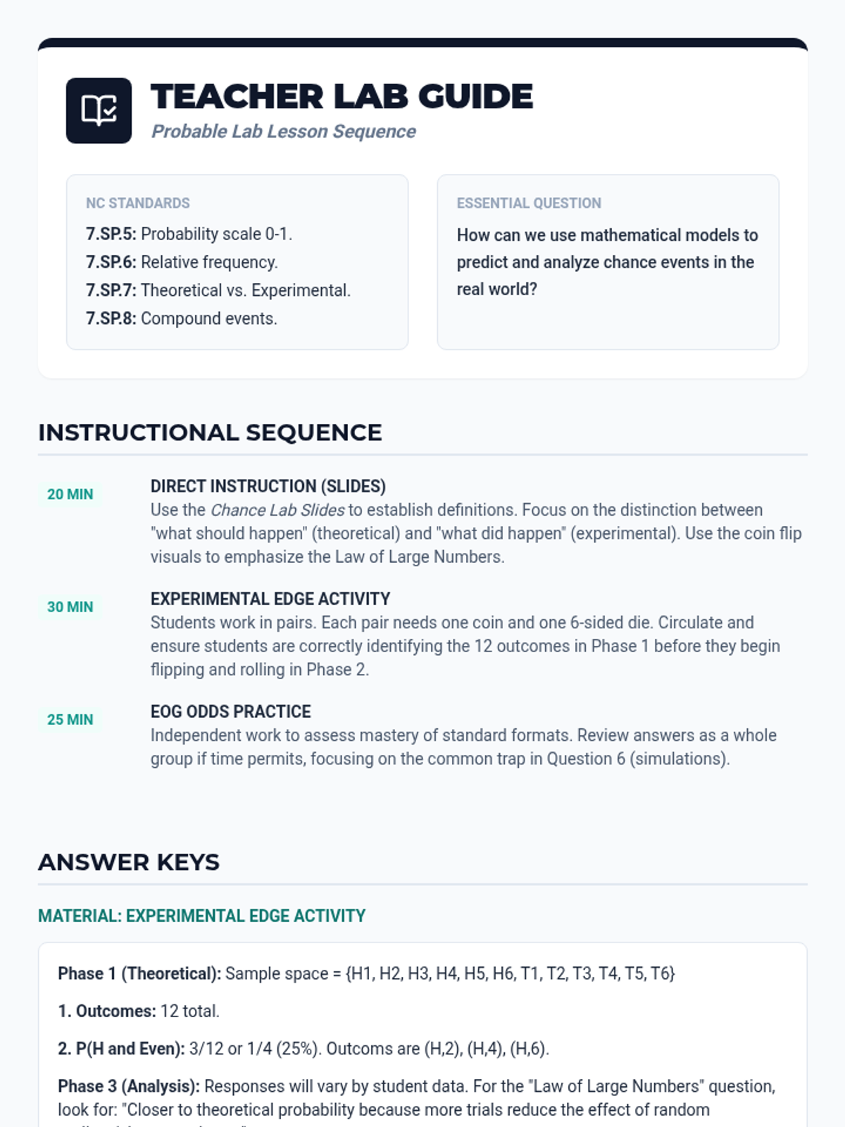 A comprehensive lesson exploring the relationship between theoretical and experimental probability through hands-on simulations and EOG-style practice. Students will move from understanding the probability scale to conducting their own chance experiments and analyzing the results.