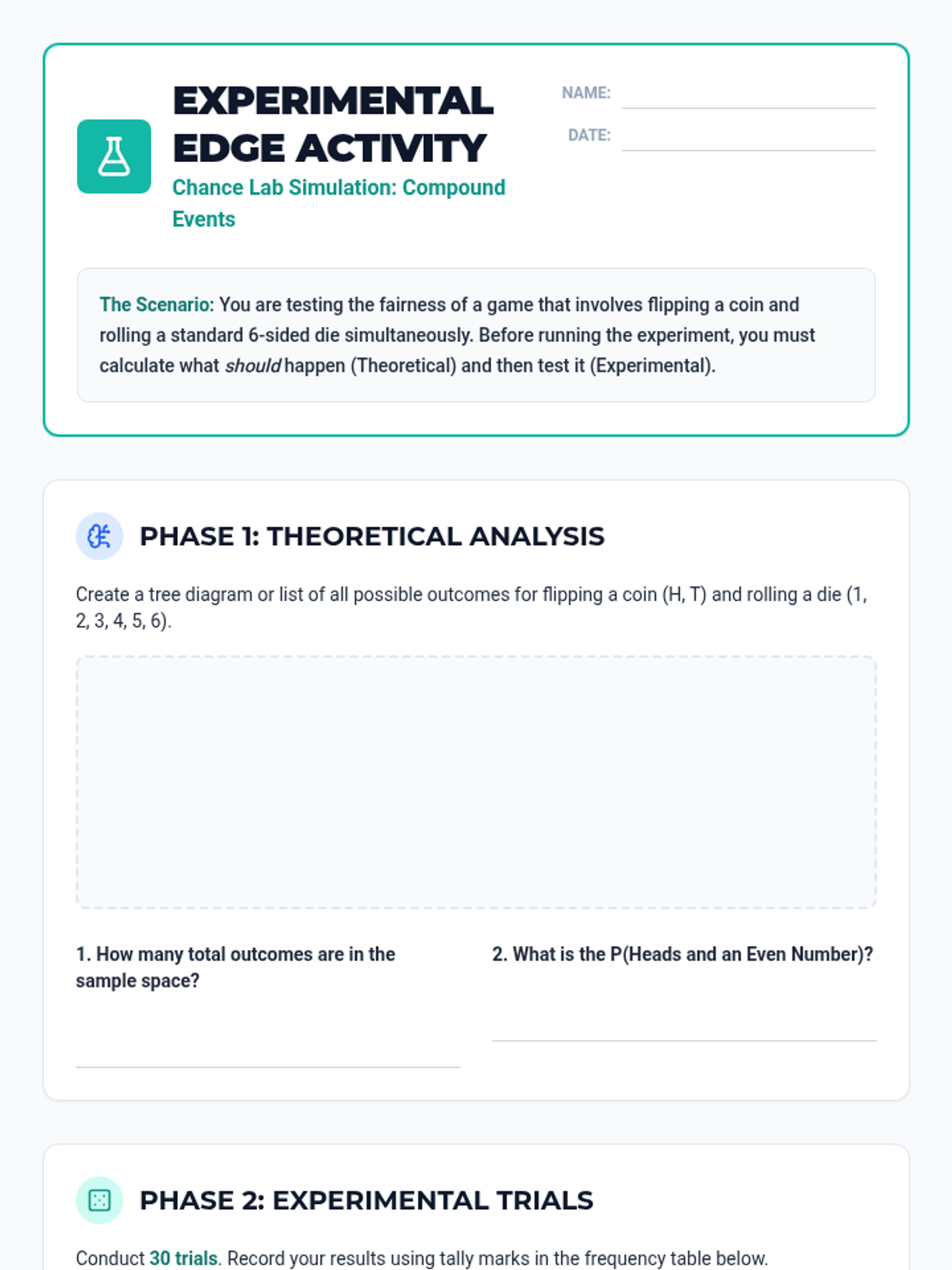 A hands-on probability lab where students rotate through various 'carnival' stations to explore theoretical and experimental probability, compound events, and tree diagrams.