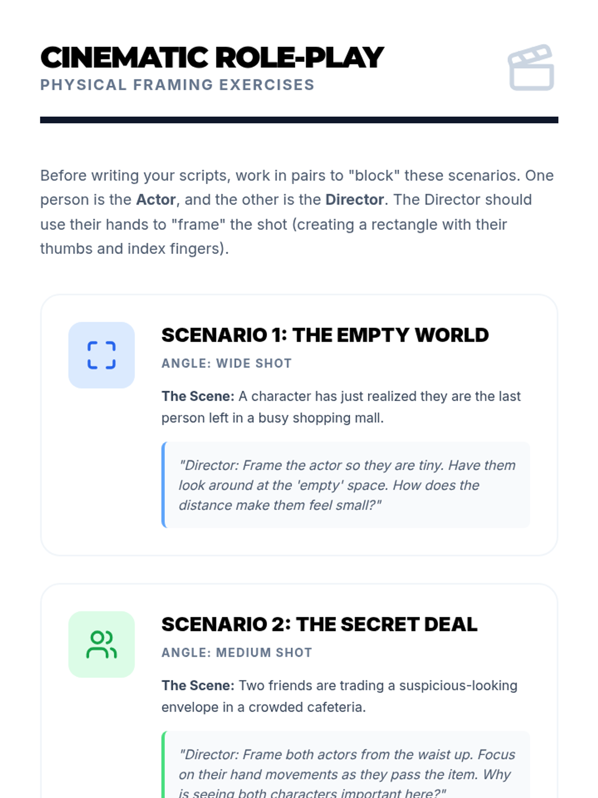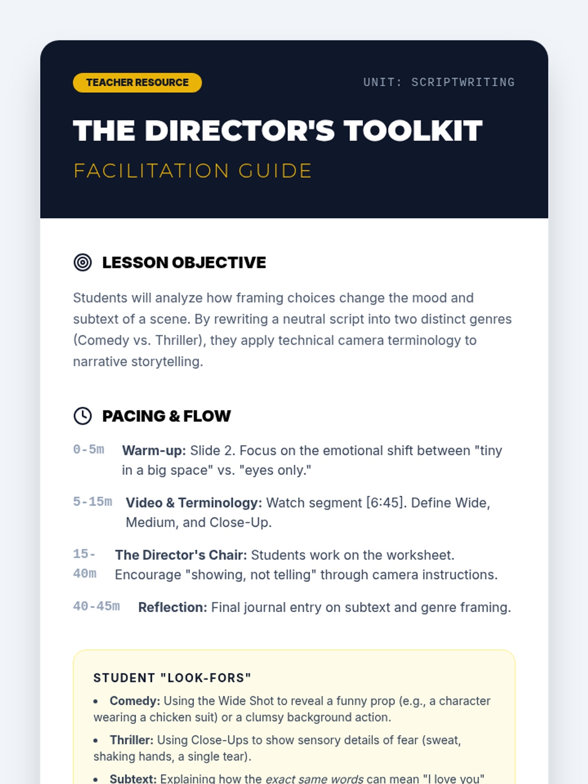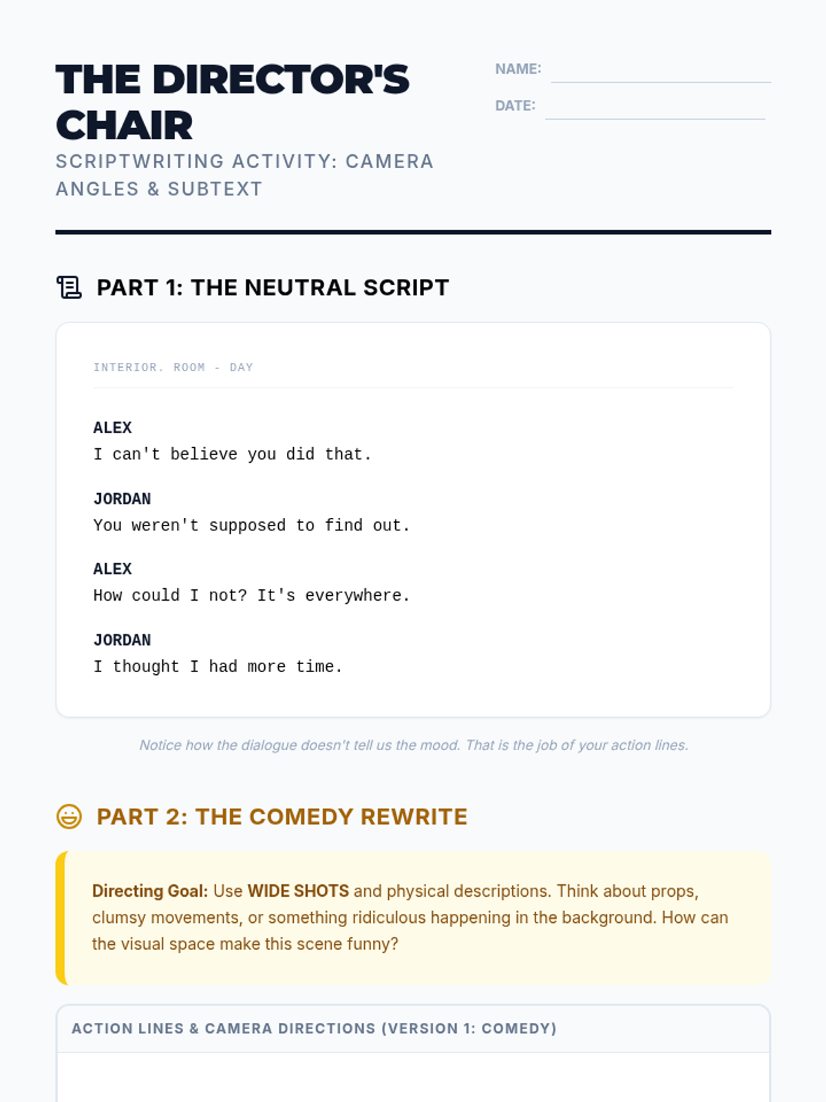 A creative writing lesson for 9th-10th graders that explores the narrative power of camera angles. Students analyze how framing choices change the subtext of a scene and apply these concepts to rewrite scripts for different genres.
