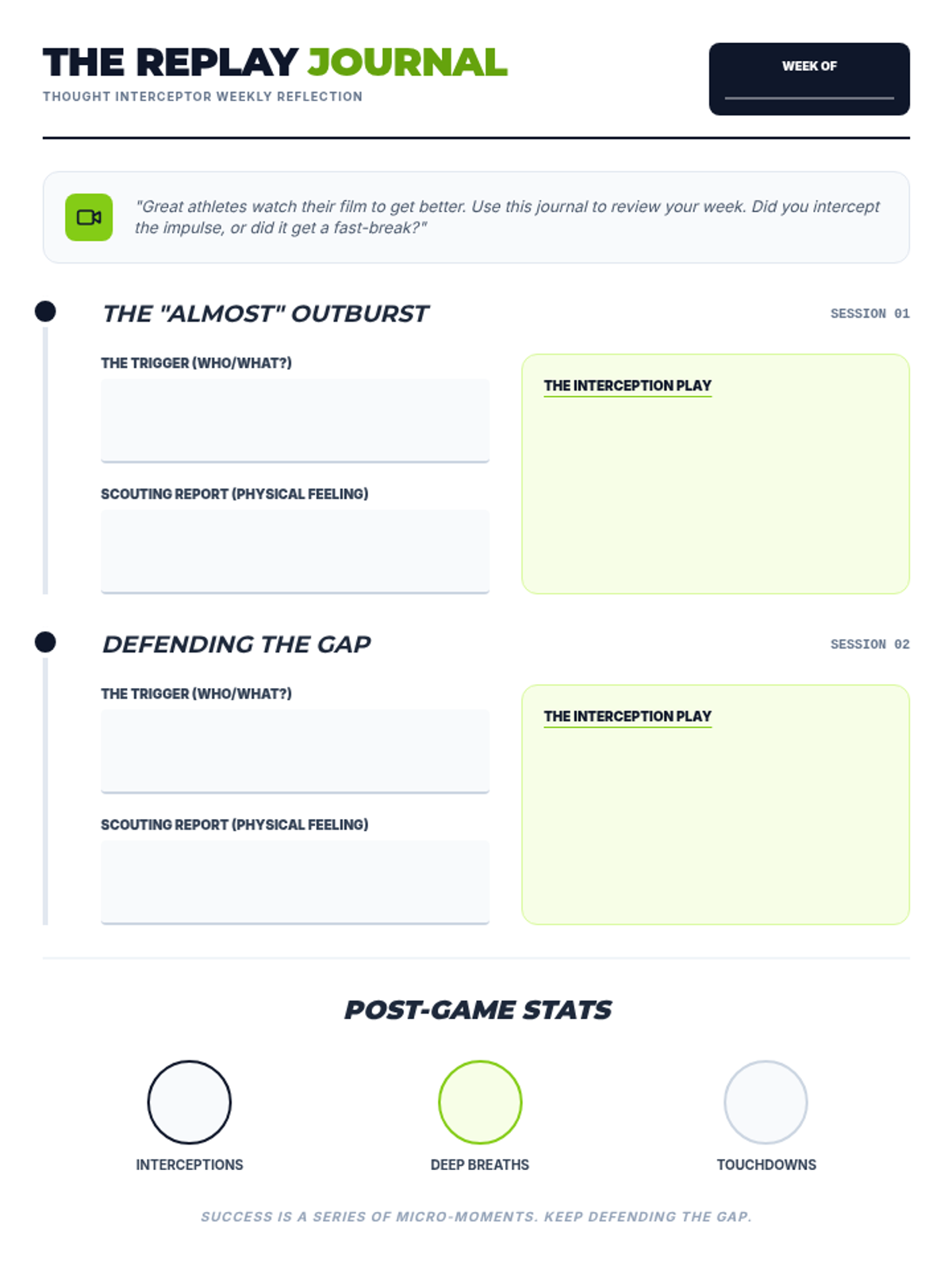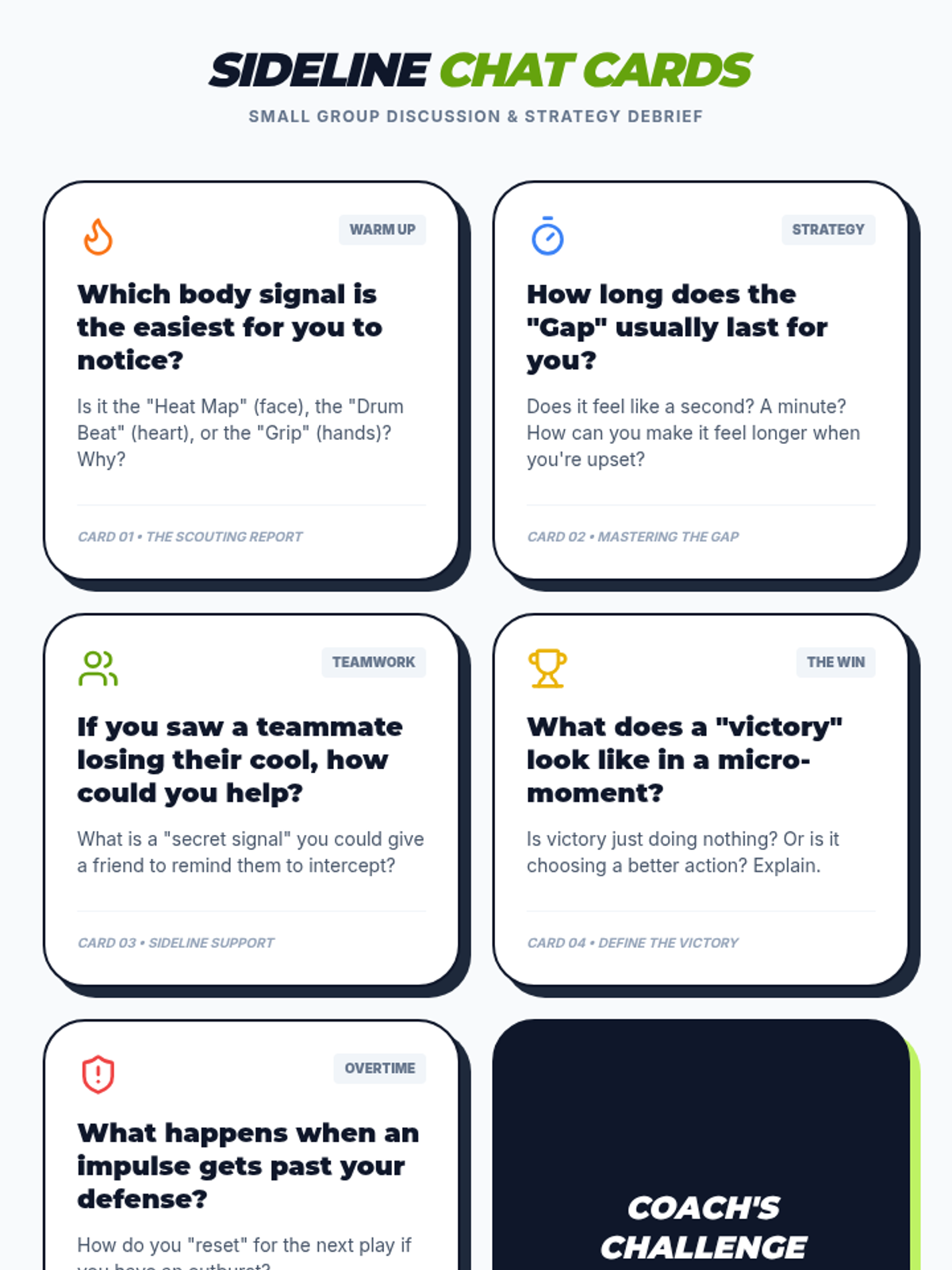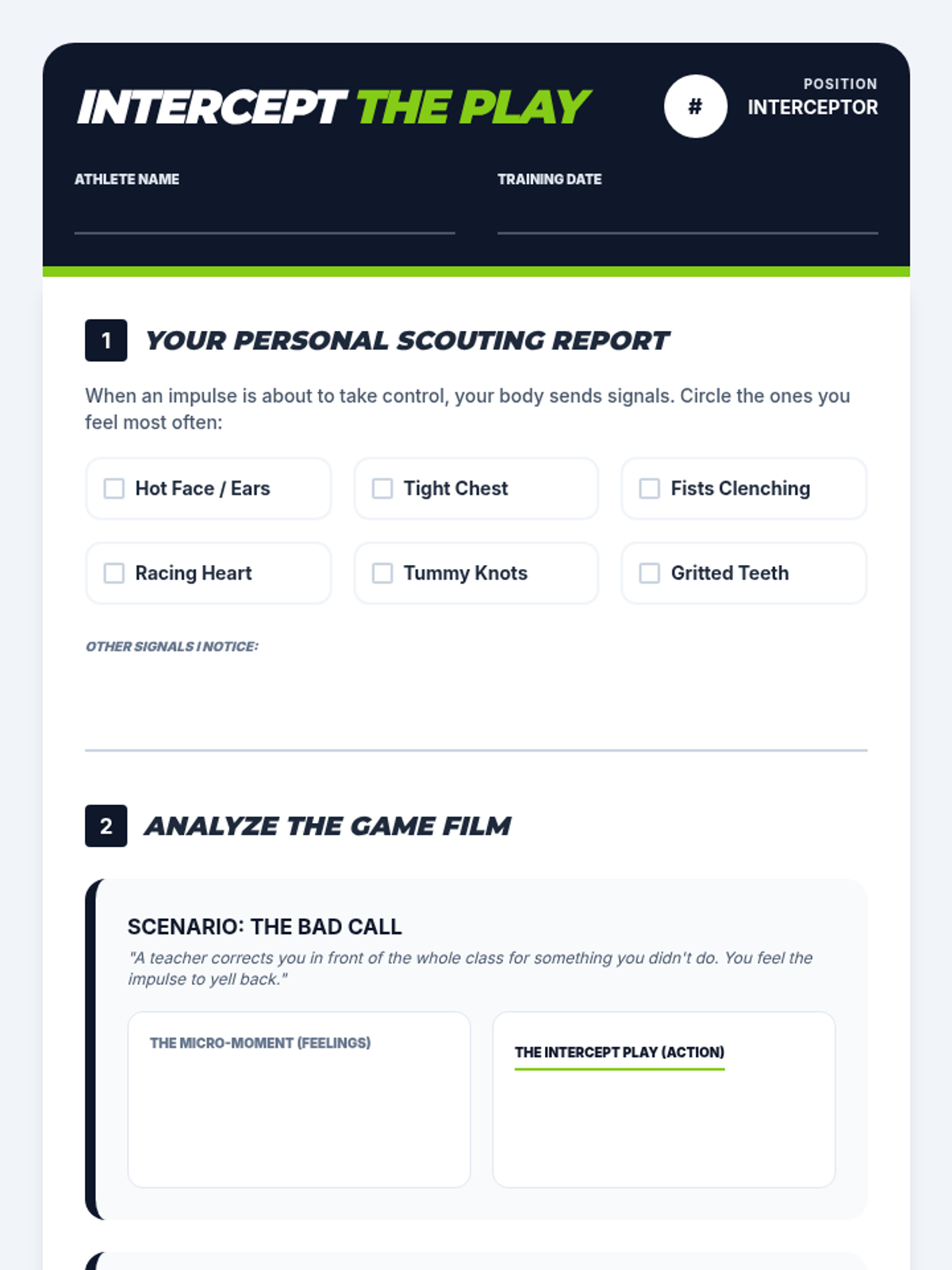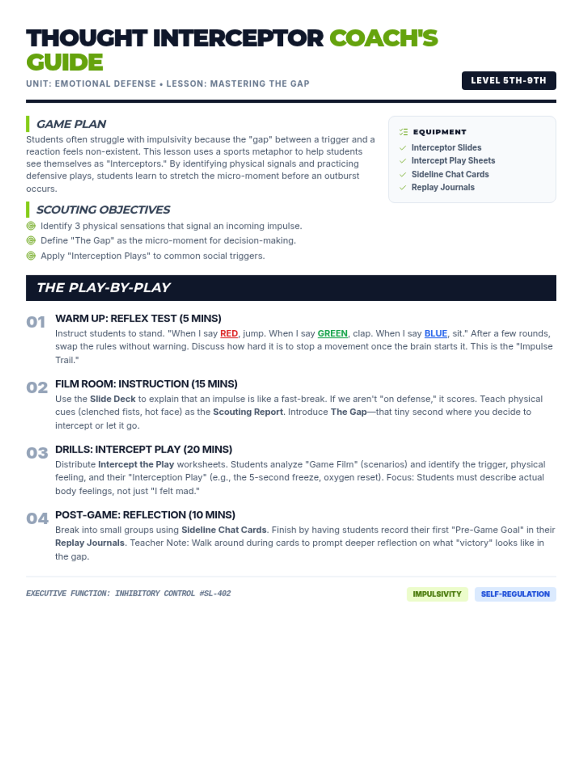A sports-themed lesson for 5th-9th graders on inhibitory control, teaching students to 'intercept' impulsive thoughts by recognizing physical triggers and utilizing the micro-moment before a reaction.